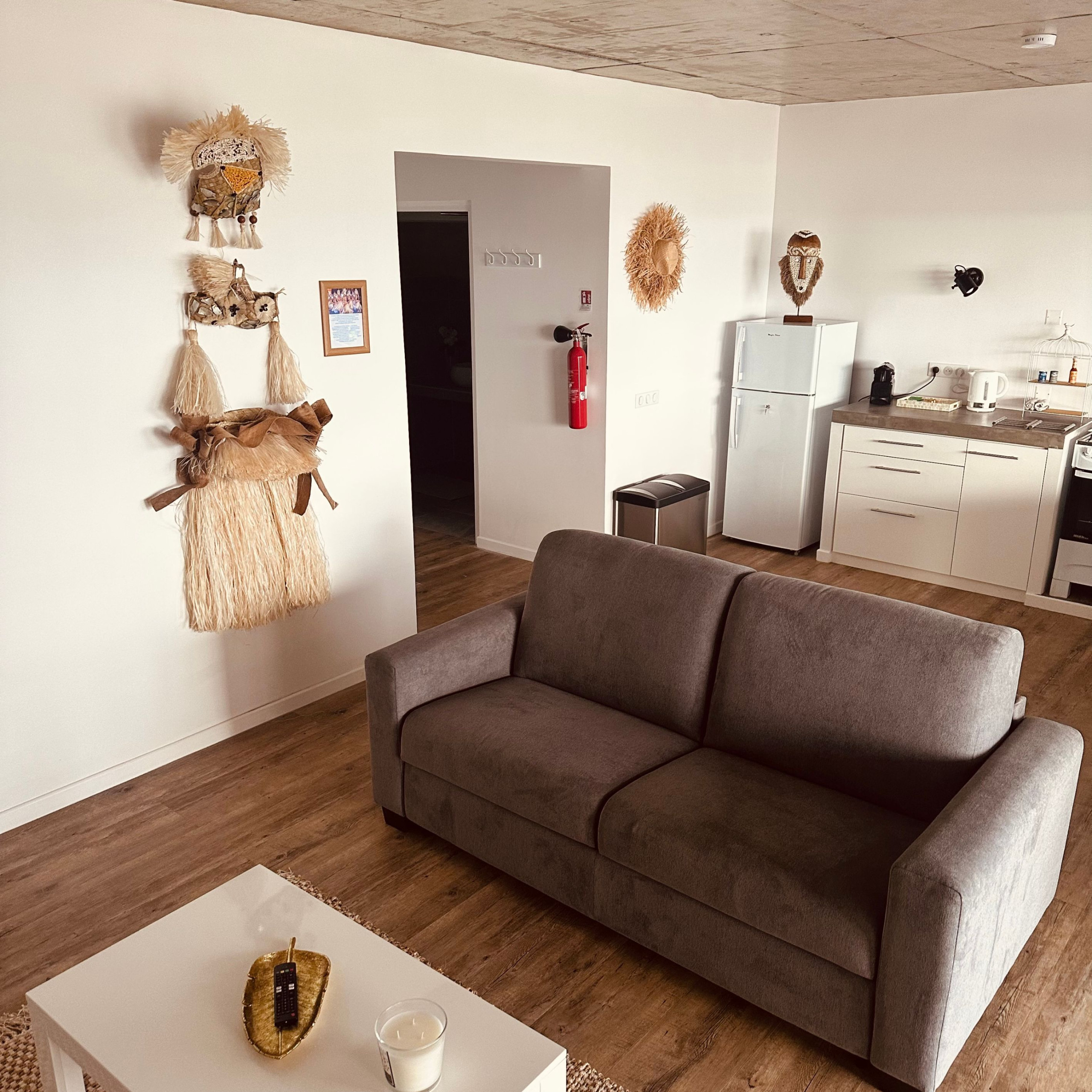 Dans le salon, un espace nuit avec un lit double et un canapé convertible double pour permettra d’accueillir 4 personnes supplémentaires. Celui-ci est ouvert sur une cuisine toute équipée, et est aménagé d’une télévision écran plat et d’une connexion internet en wifi gratuite.