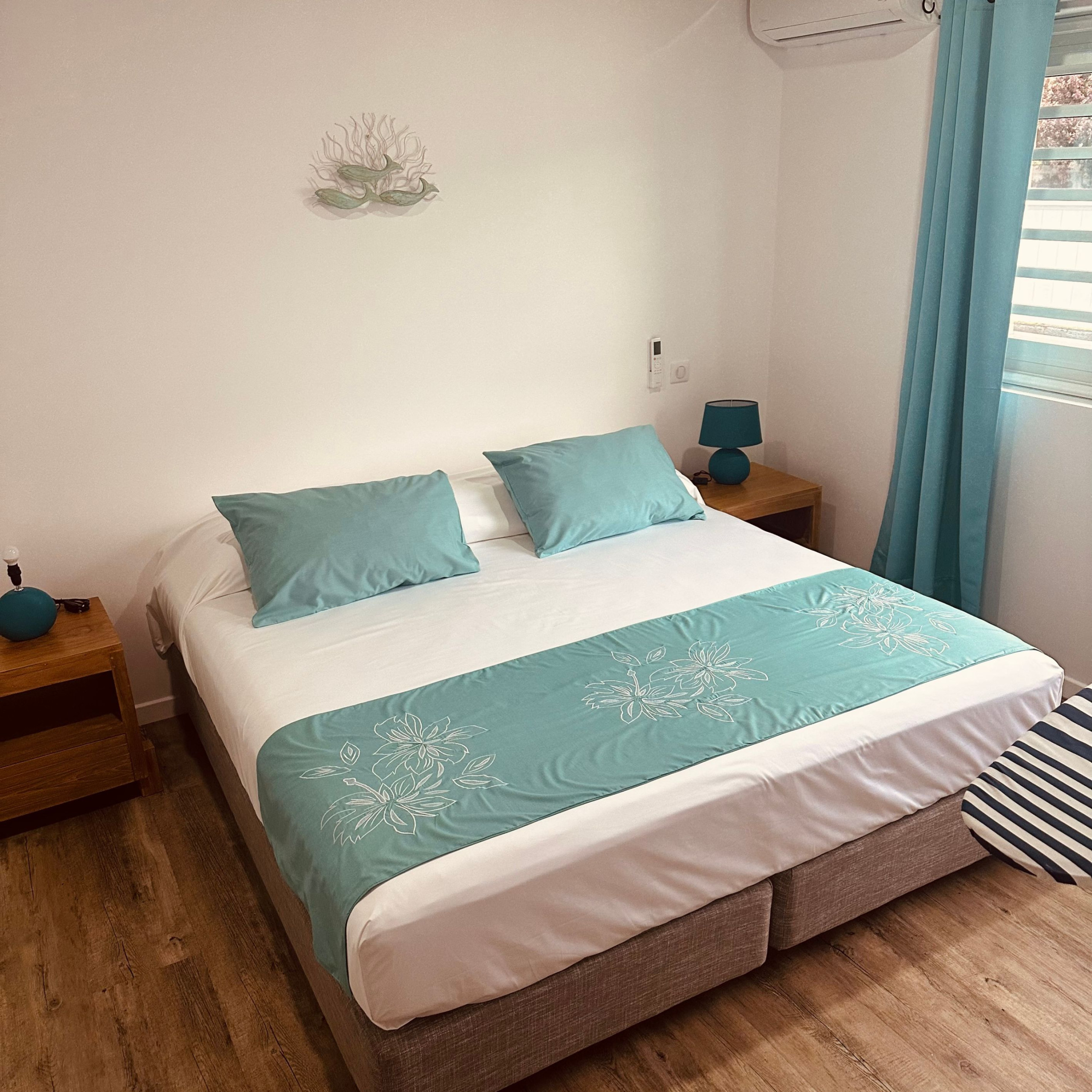 Séjournez dans cet appartement de 75m2, en rez-de-chaussée d’un petit immeuble d’un étage avec piscine et en bord de lagon, alliant le confort d'un hôtel et les avantages d'une pension familiale.