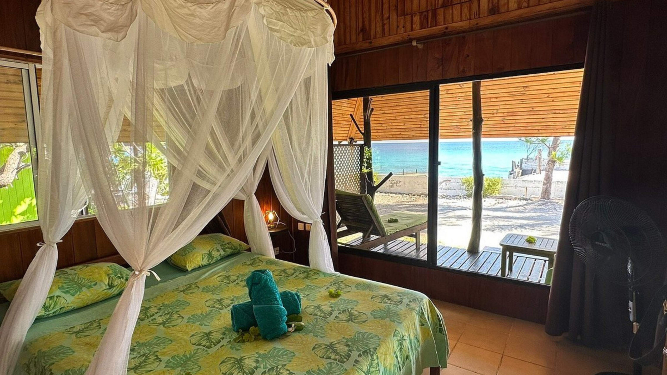 Ce logement dispose d’un lit queen-size avec moustiquaire et ventilateur, d’une salle d’eau privée, ainsi que d’une terrasse couverte, pour profiter des instants de détente face au lagon.
