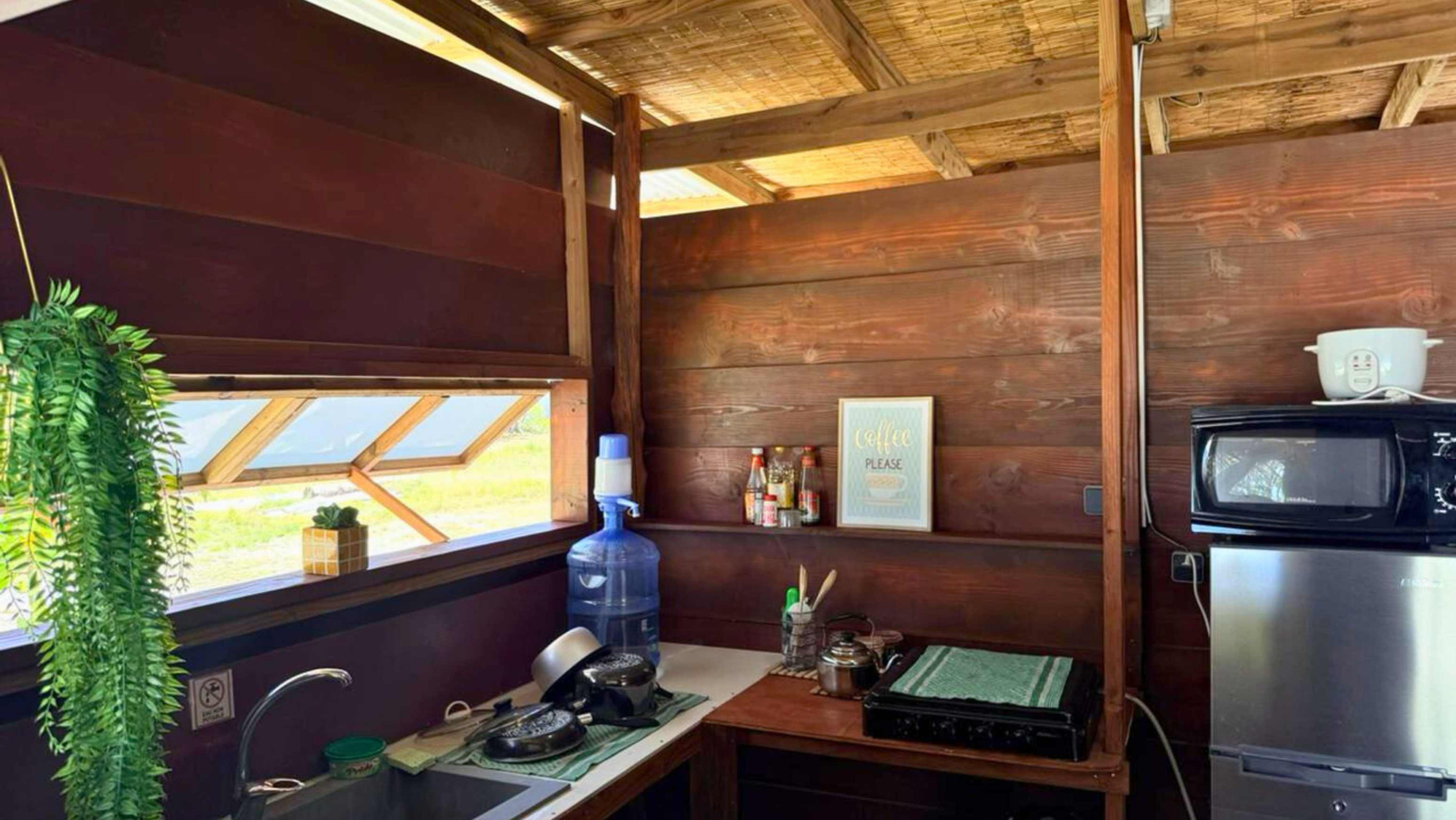 Pour vos repas, vous trouverez une cuisine entièrement équipée avec un réfrigérateur, un four, un micro-ondes, une bouilloire, une machine à café et même un presse-agrumes. Le Wi-Fi est disponible gratuitement pour rester connecté.