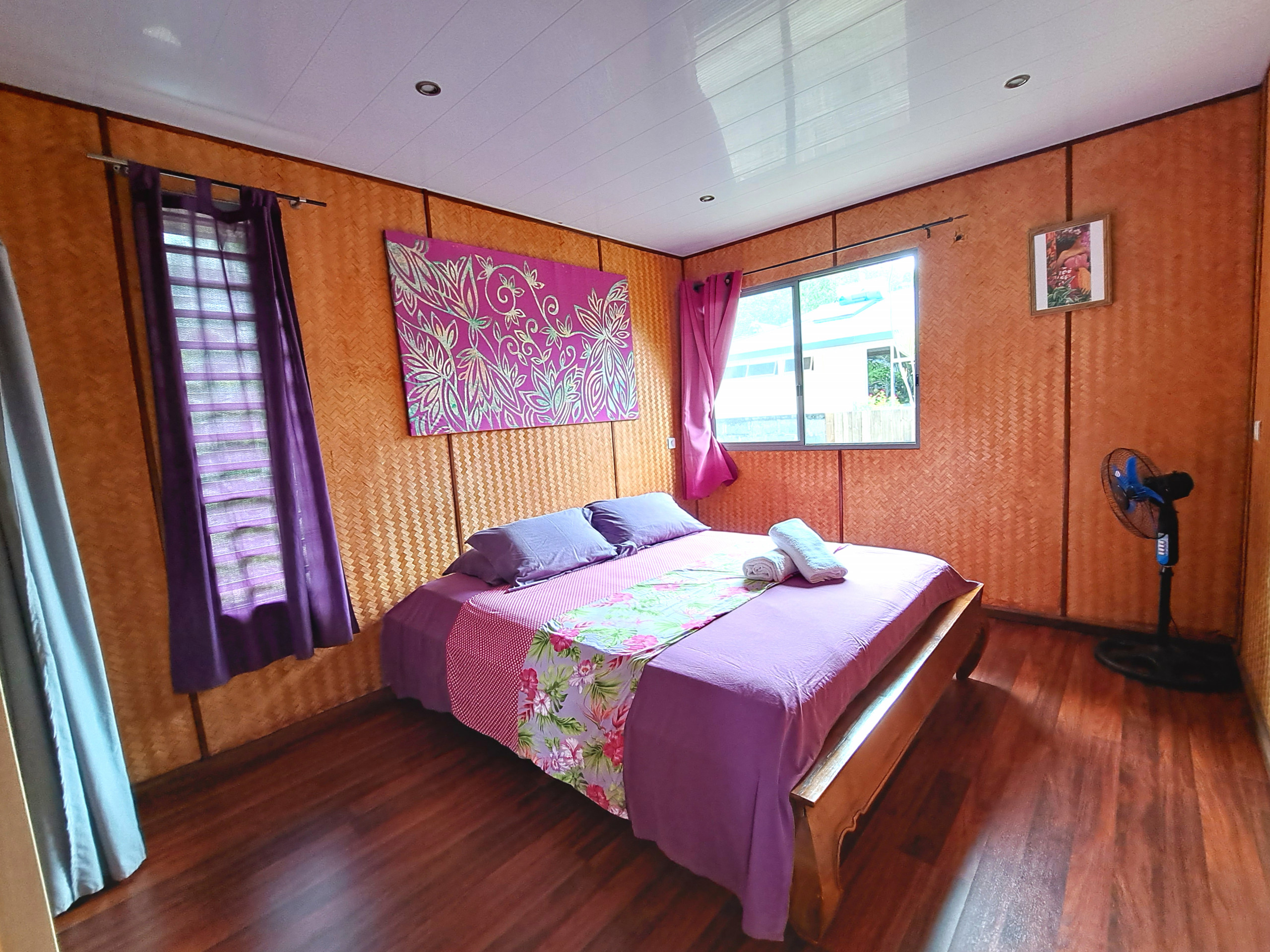 Il est composé d'une pièce principale avec cuisine ouverte sur salon et possède une chambre séparée avec un lit double, une penderie et un ventilateur.