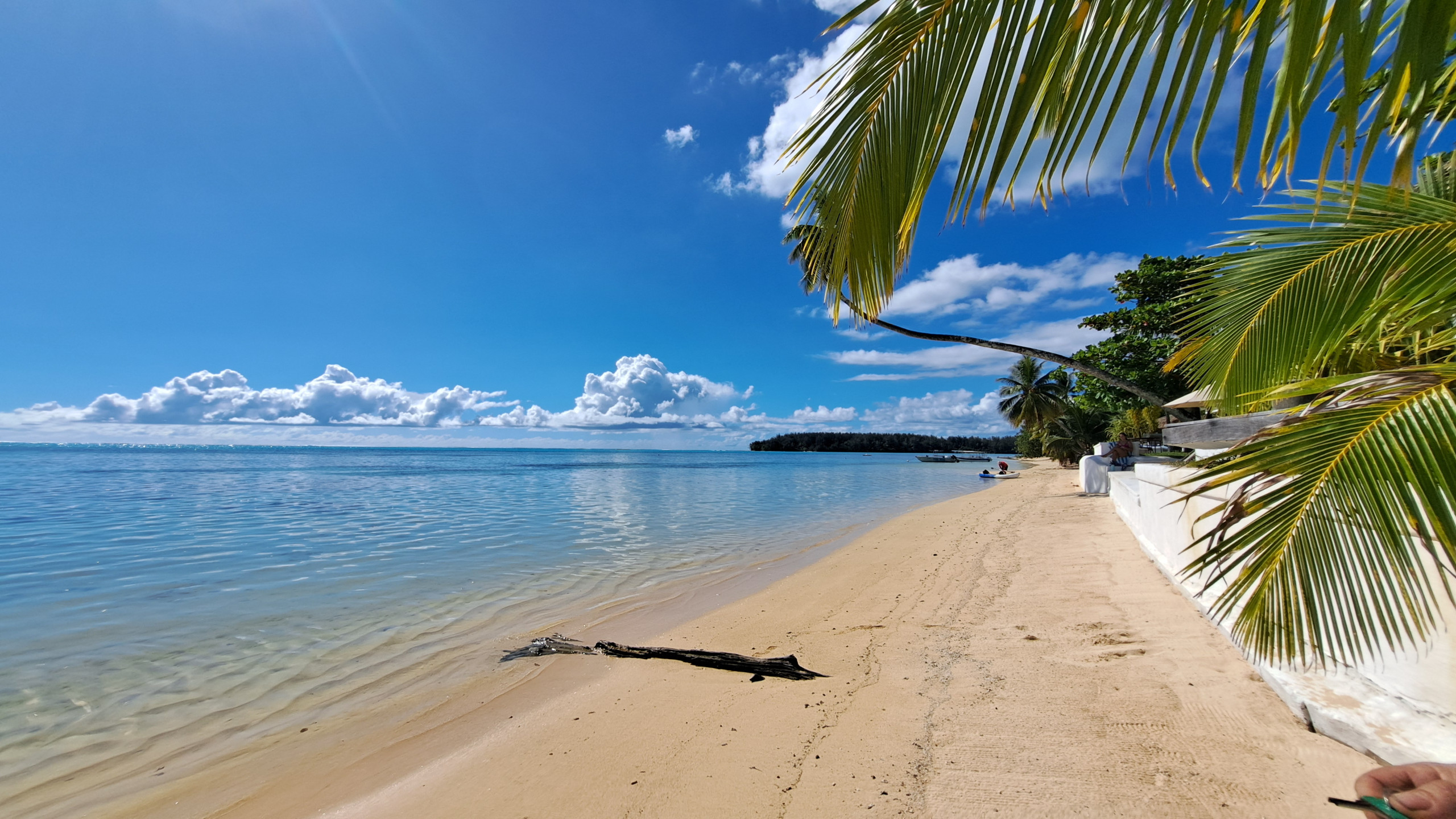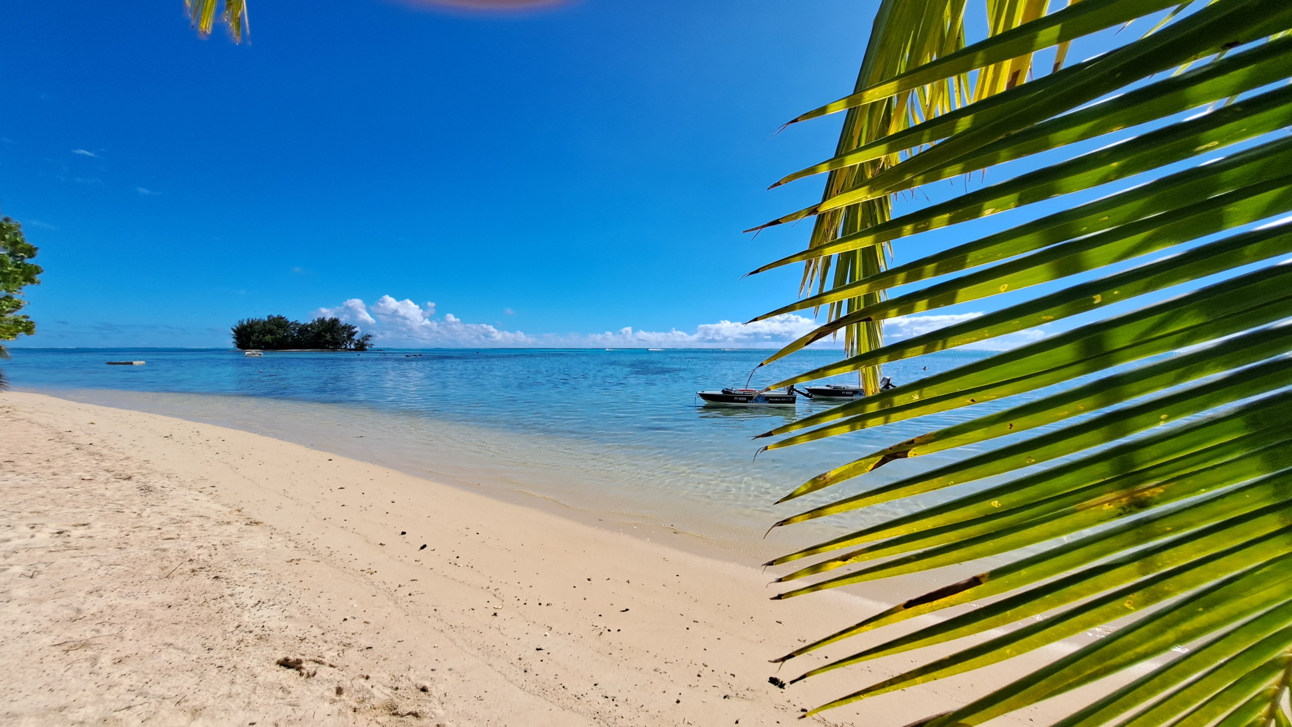 Moorea côté mer, plage de sable blanc, lagon bleu turquoise, vue à couper le souffle