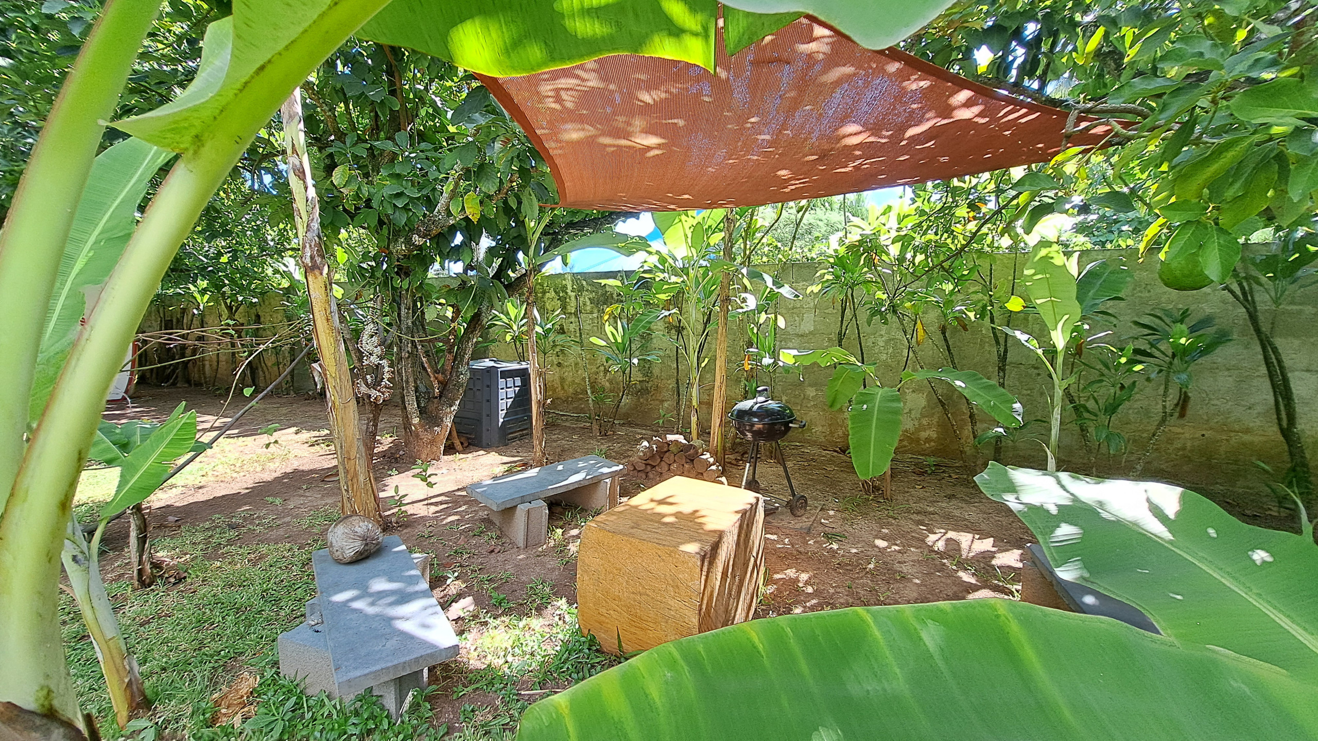 Vous prendrez vos repas sur la table de la terrasse extérieure couverte, entouré de verdure.