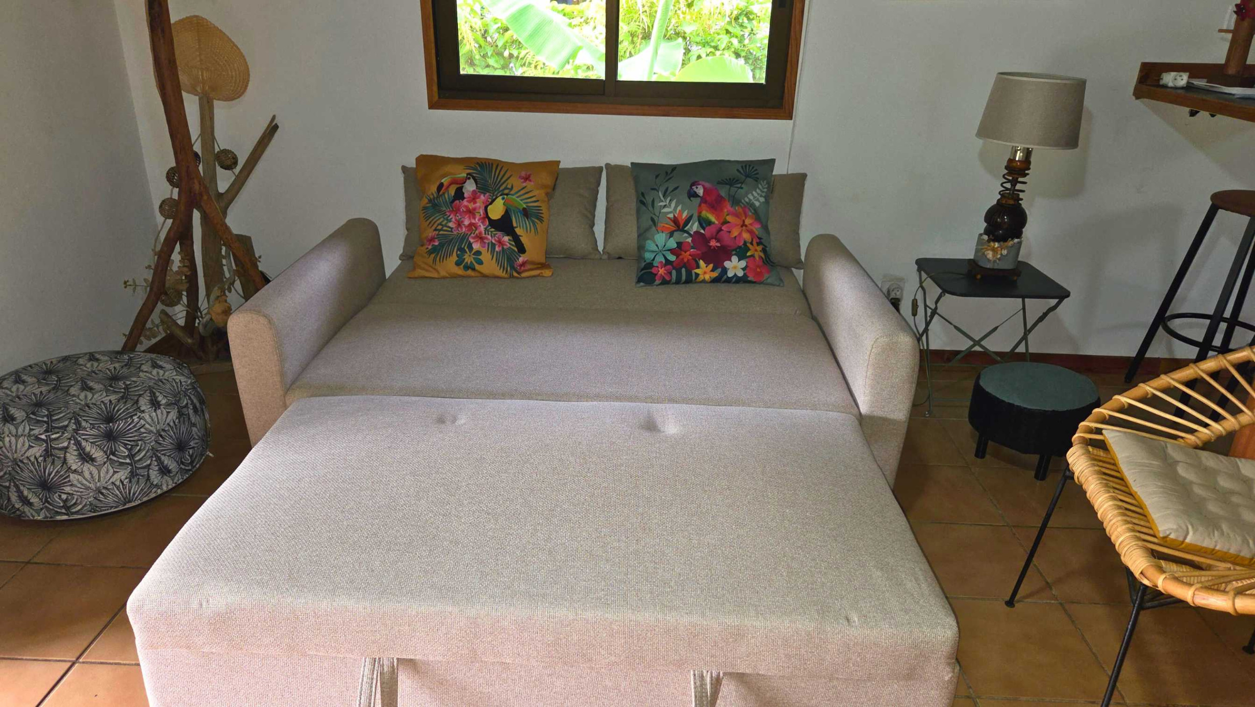 La pièce principale est composée d'un espace salon avec un canapé lit pouvant accueillir 2 personnes en plus , une télévision (netflix, prime vidéo, etc... fournis).