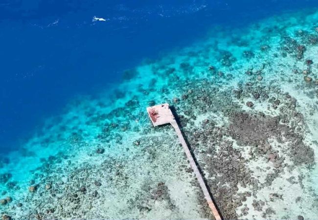 Accès direct à la plage privée, avec un ponton privatif pour contempler le lagon ou vous baigner à toute heure
