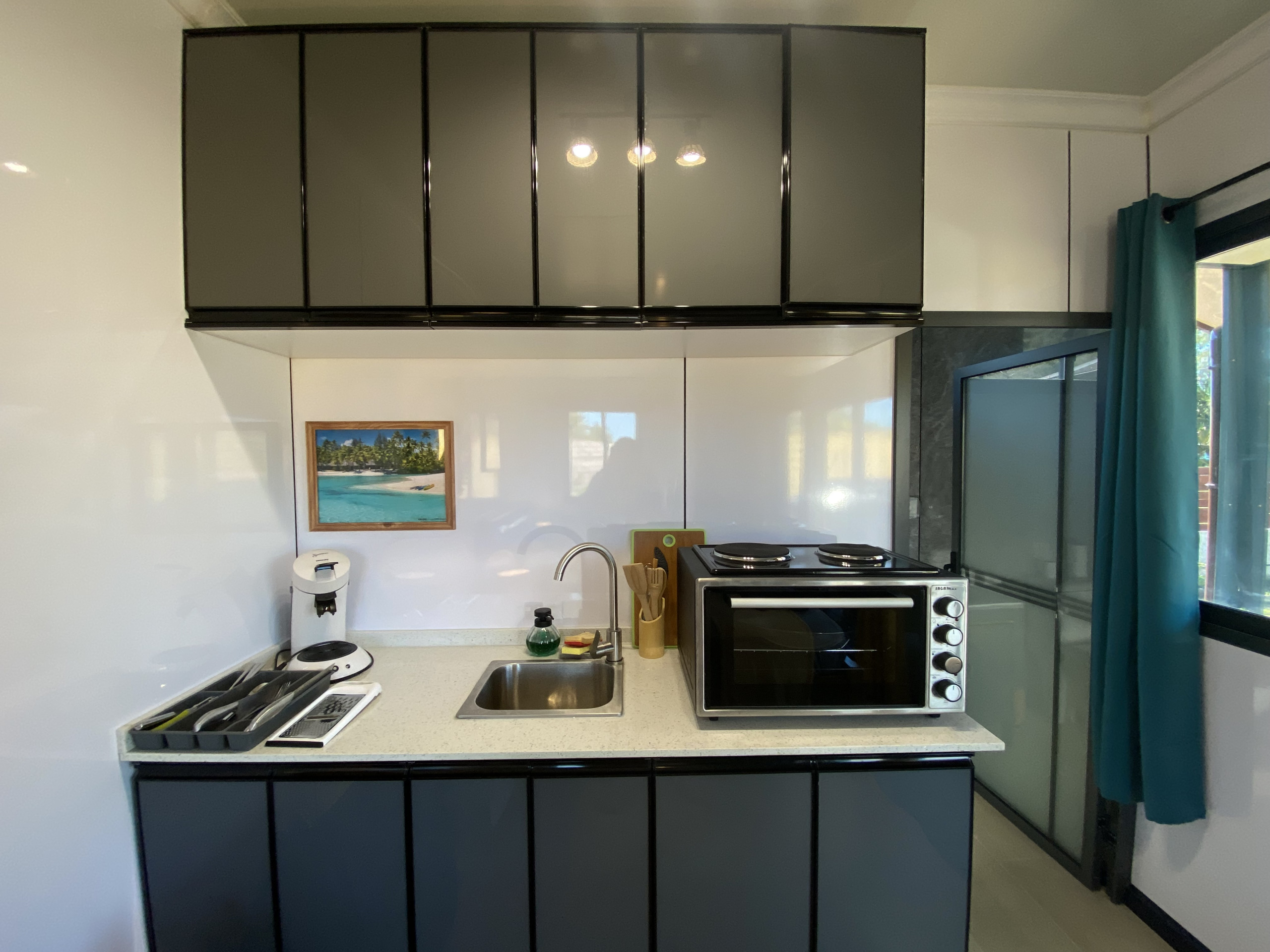 Kitchenette équipée : mini-réfrigérateur, micro-ondes, plaque électrique, cafetière, vaisselle, ustensiles de cuisine