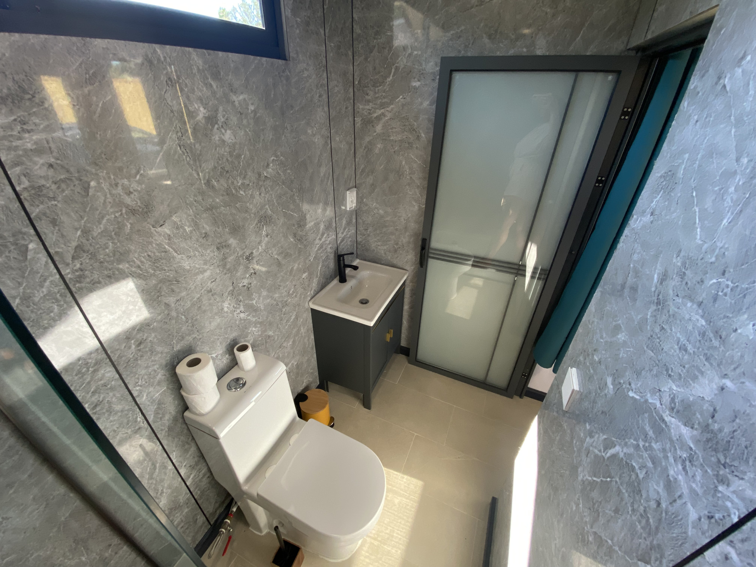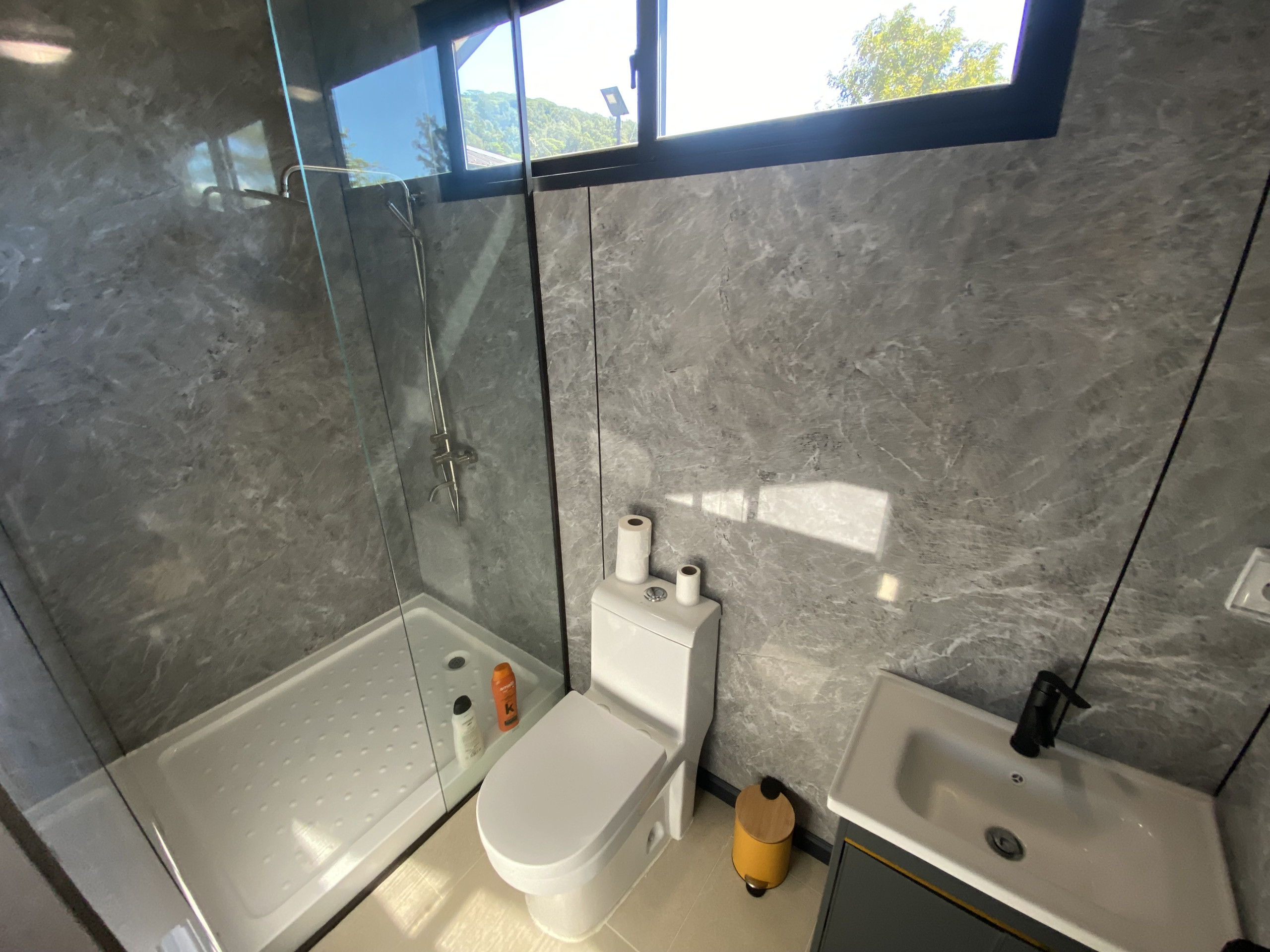 -Salle de bain moderne avec douche, WC, chauffe-eau solaire et linge de toilette fourni