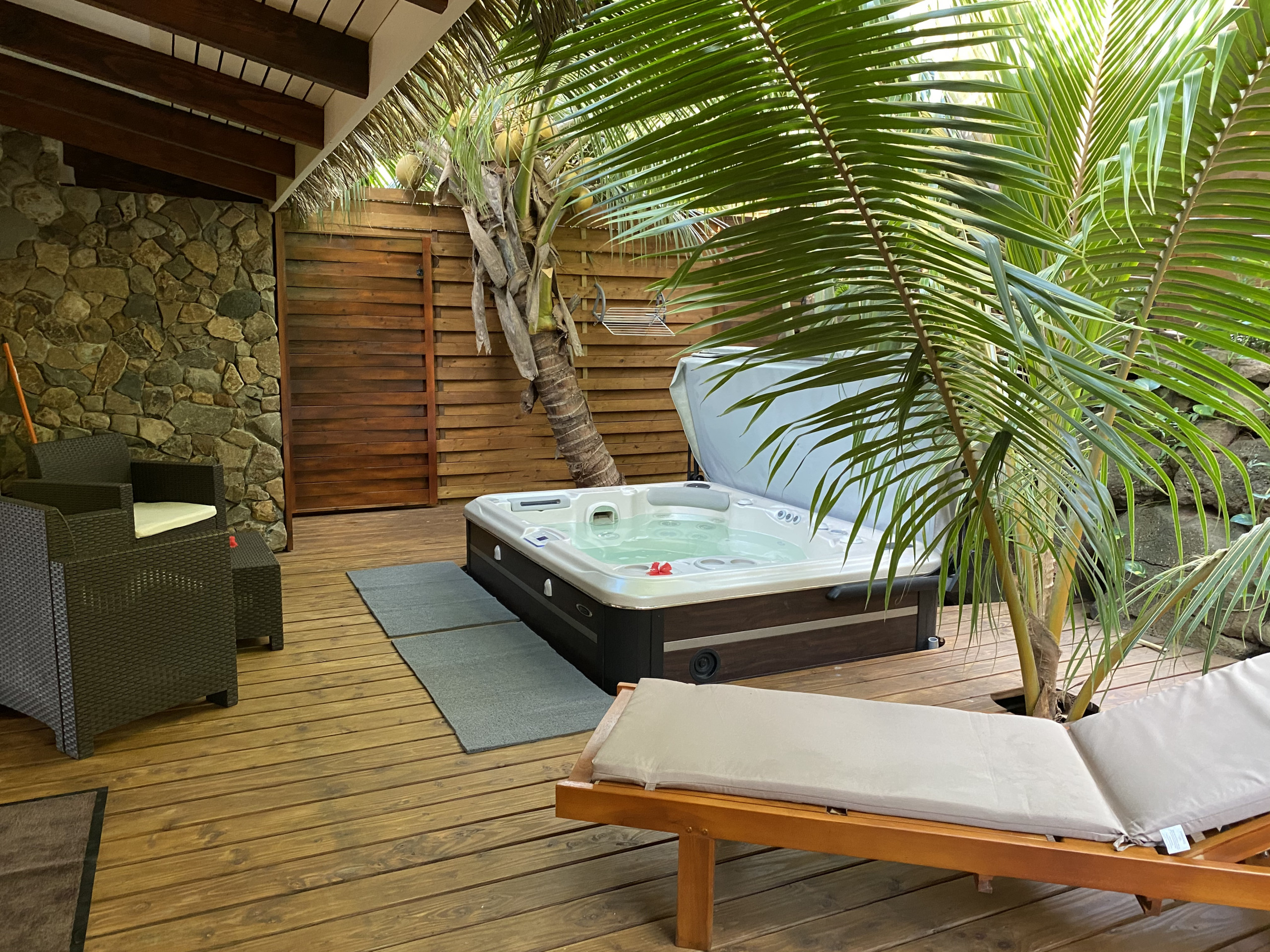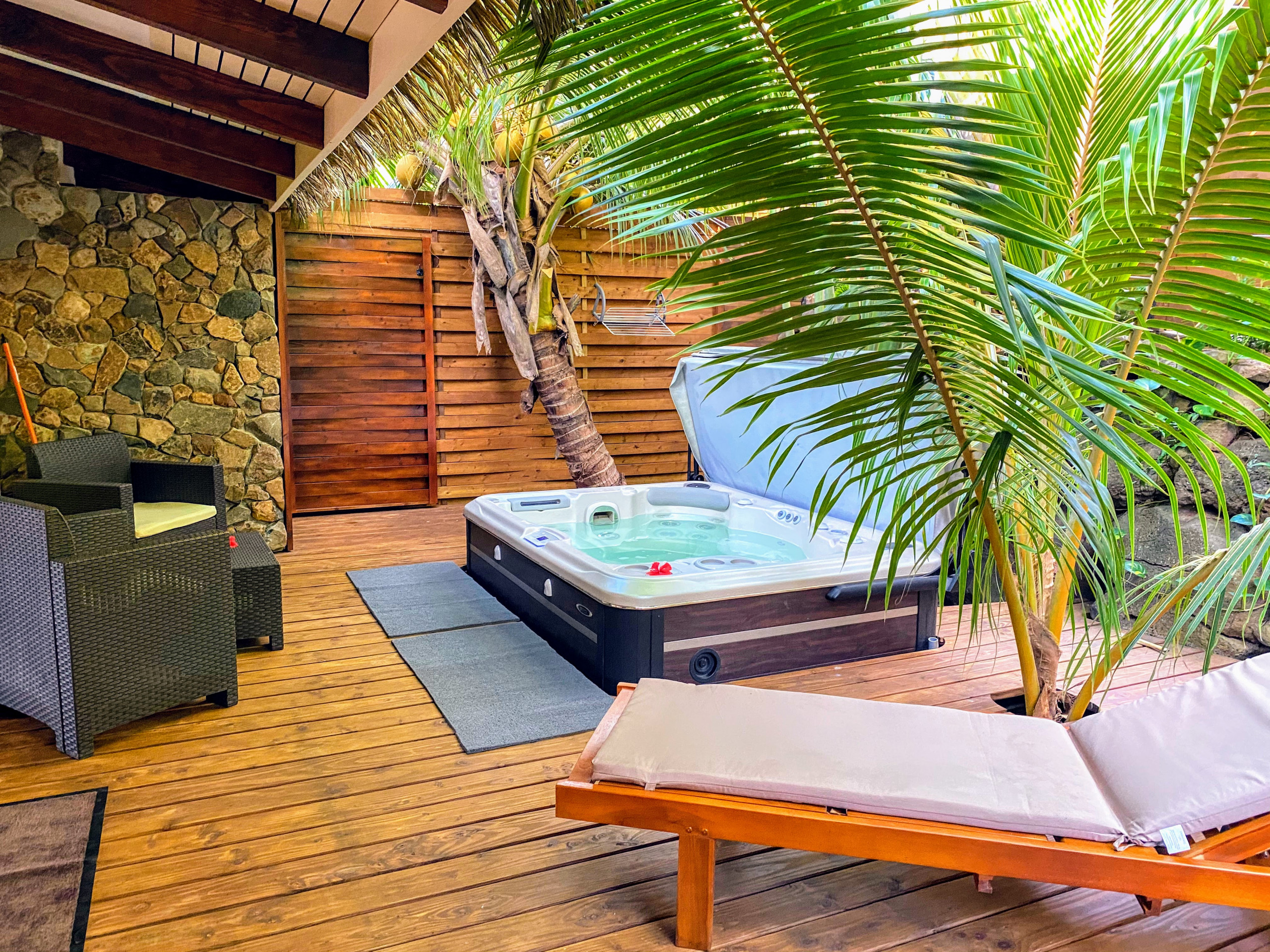 Just Relax Inn vous offrira une atmosphère douce et cosy. Le bungalow est climatisé et peut accueillir 4 personnes confortablement. Vous apprécierez l’élégance des lieux mêlé au charme des îles. La terrasse privée et son jacuzzi sera certainement votre endroit favori. Un véritable jardin d’Eden aux ambiances végétales et cocooning accompagneront vos soirées.