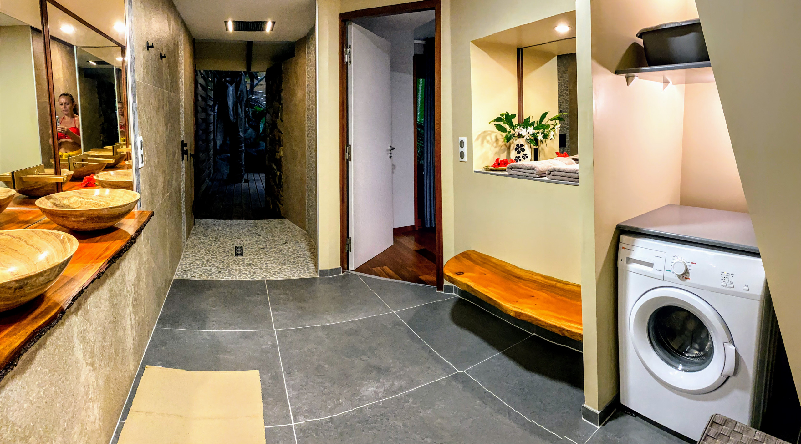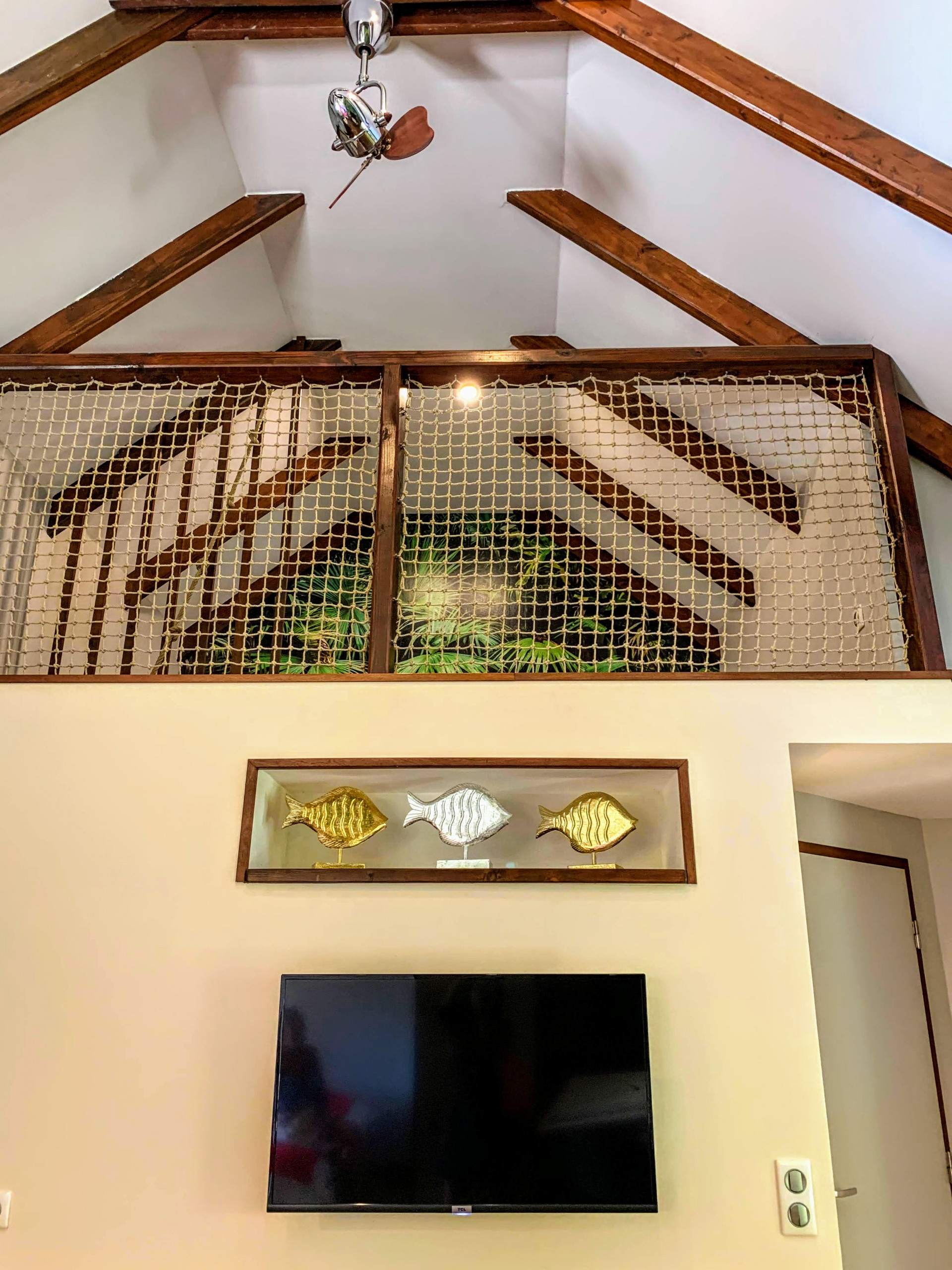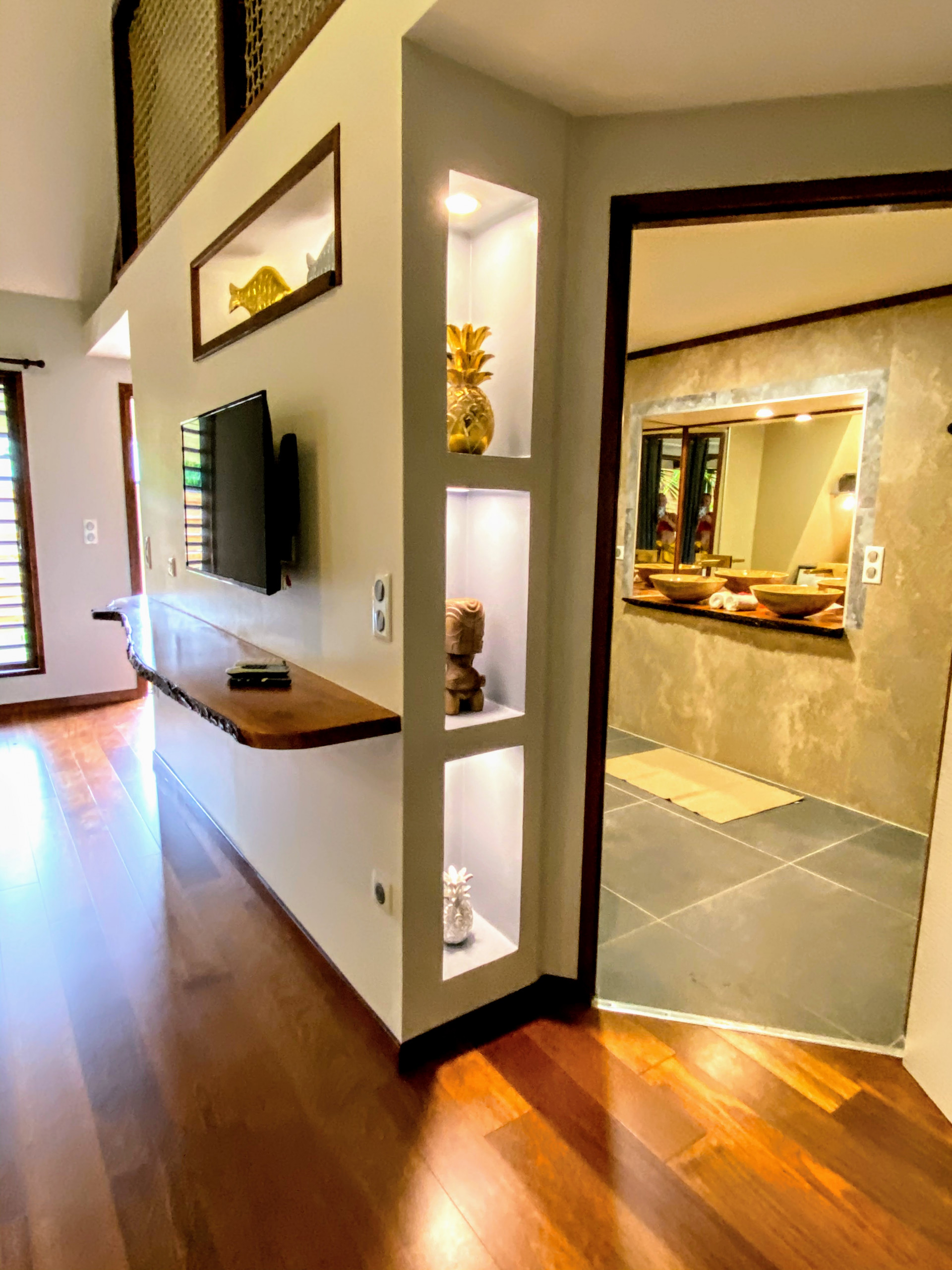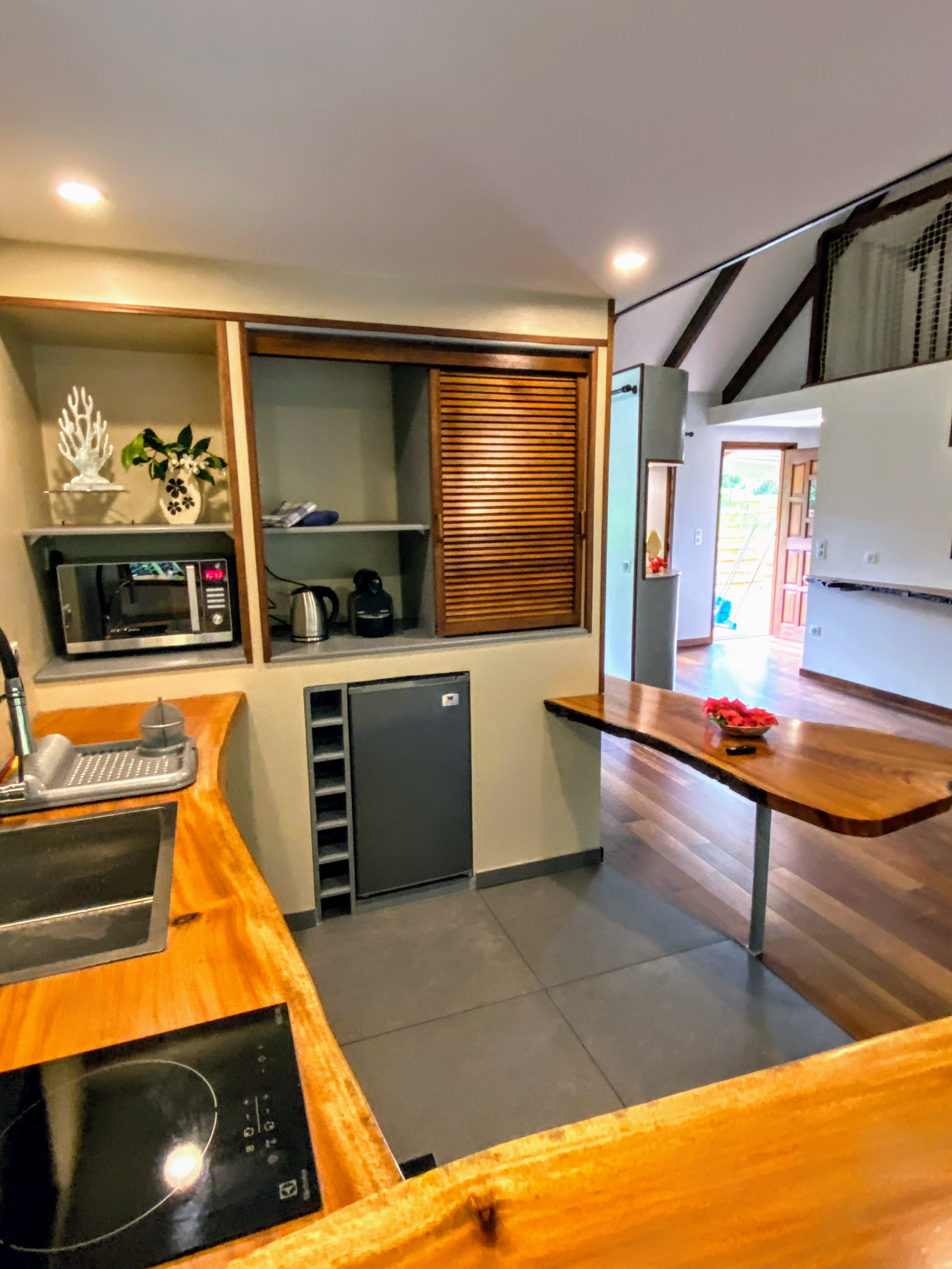 Composé d’une chambre principale avec lit King size, une mezzanine pour 2 personnes avec 2 matelas simple posés au sol, et une spacieuse salle de bain avec toilette + 1 toilette avec douchette indépendant. La cuisine est entièrement équipée et ouverte sur un espace salon avec TV écran plat et un Bar ouvert sur la terrasse avec Chaises de bar. Tout y est réuni pour des séjours paisible et reposants.