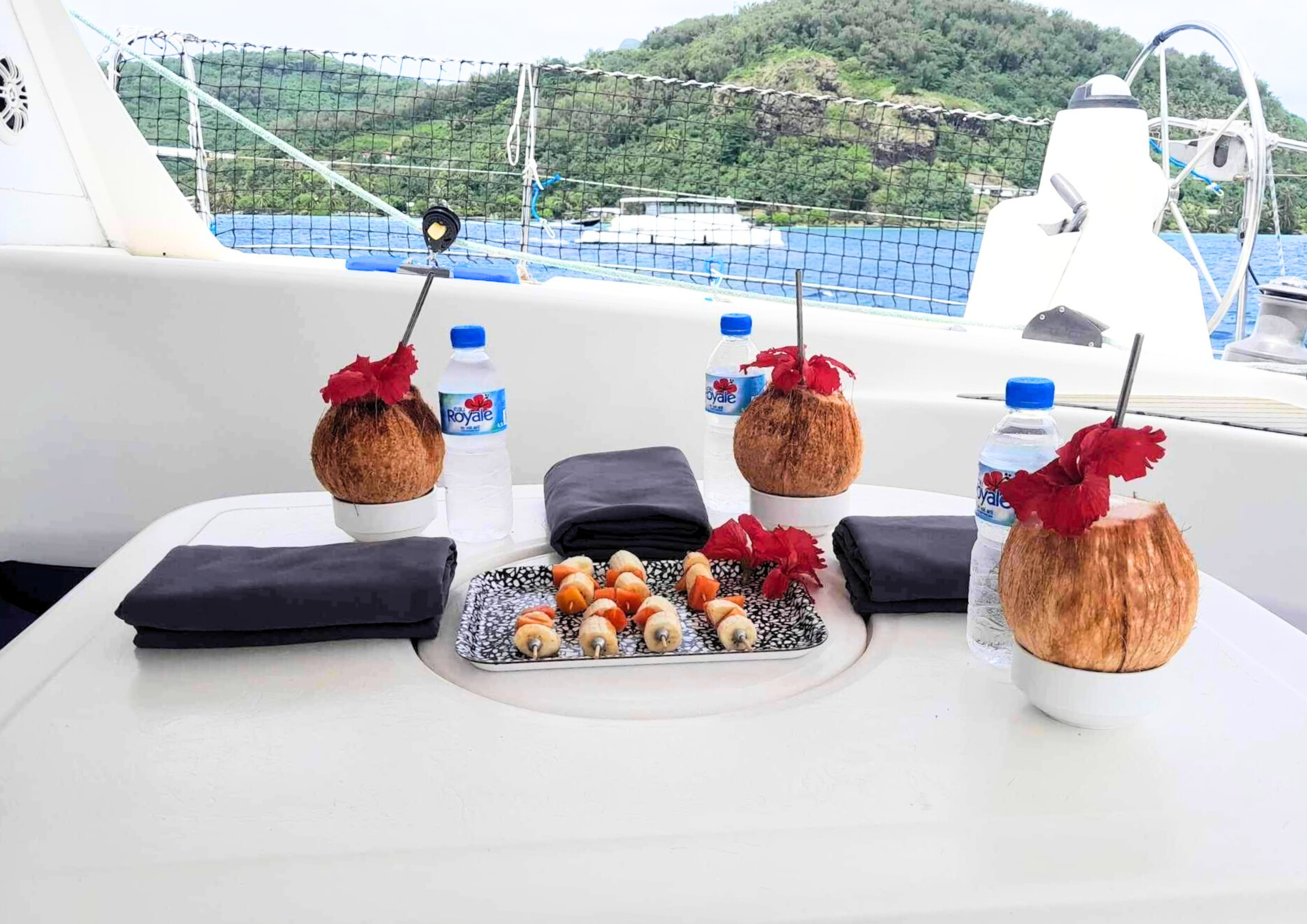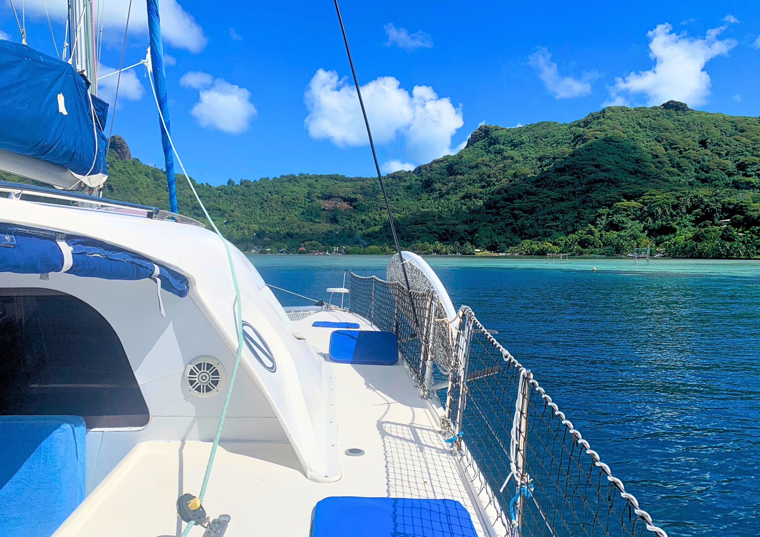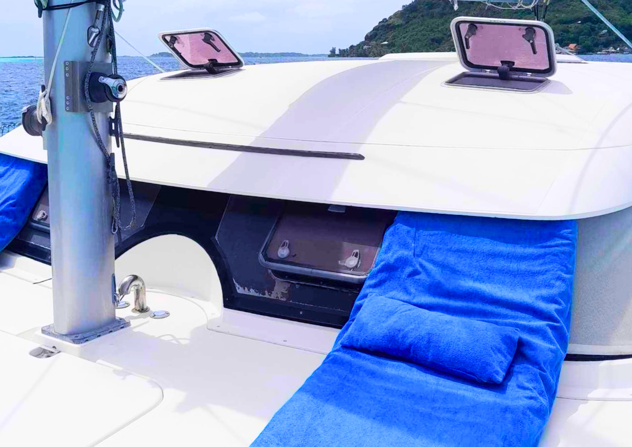 Admirez tous ces bleus exceptionnels qu'offre le lagon et laissez-vous bercer par la douceur des couchers de soleil Polynésiens, installé confortablement sur le pont avant du catamaran.