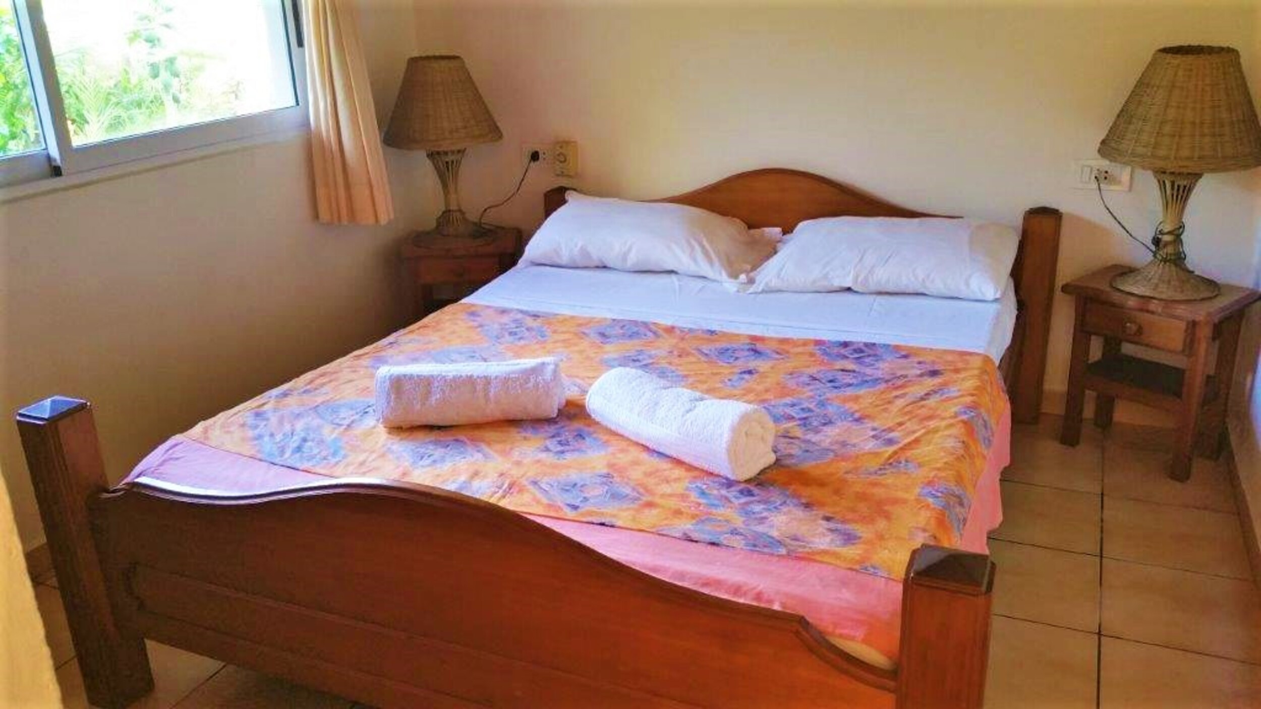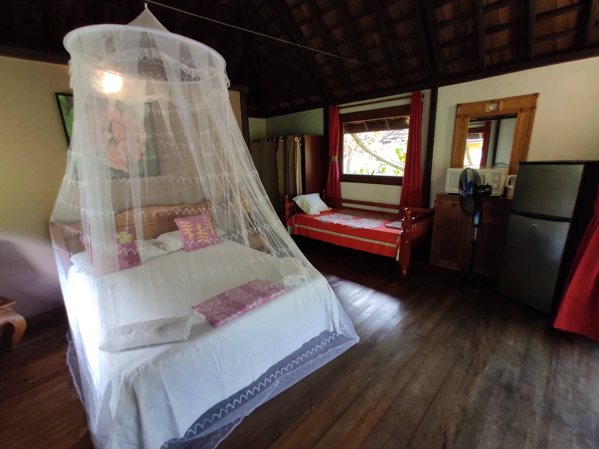 - Une pièce principale avec un lit double recouvert d’une moustiquaire et un lit simple. Dans cette même pièce sont installés un réfrigérateur-congélateur et un micro- pour stocker et faire réchauffer vos repas.