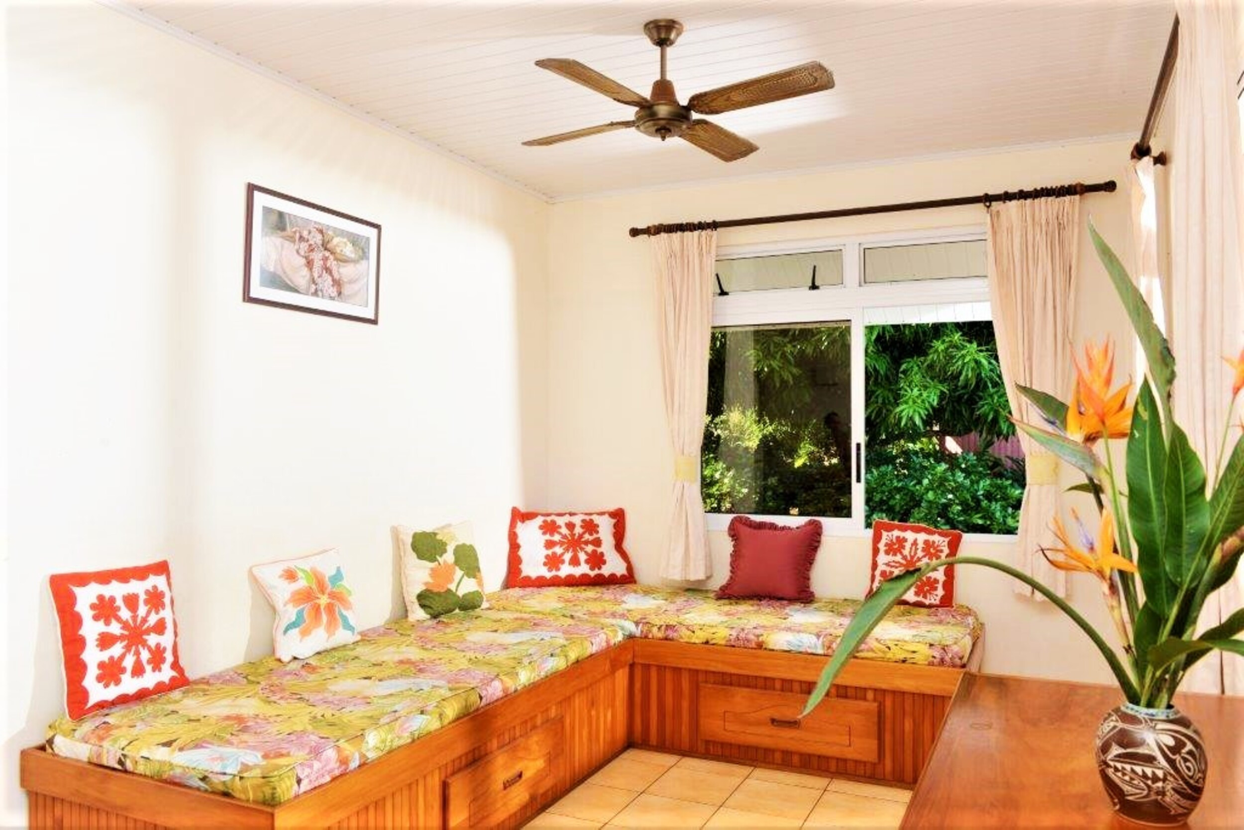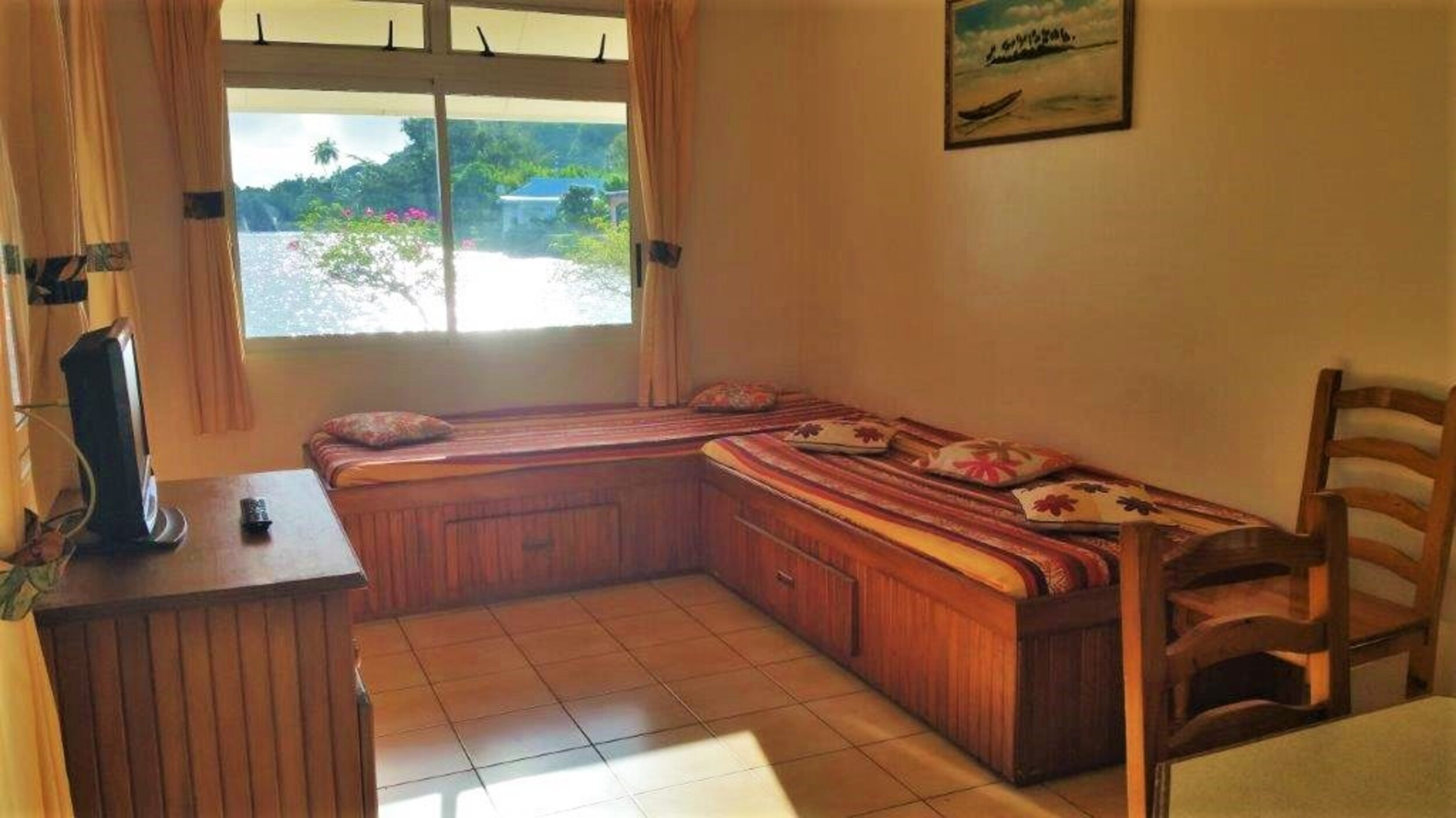 - un salon avec deux lits simples permettent d’accueillir 2 adultes ou 2 enfants. Il dispose aussi d’une télévision et d’un ventilateur.