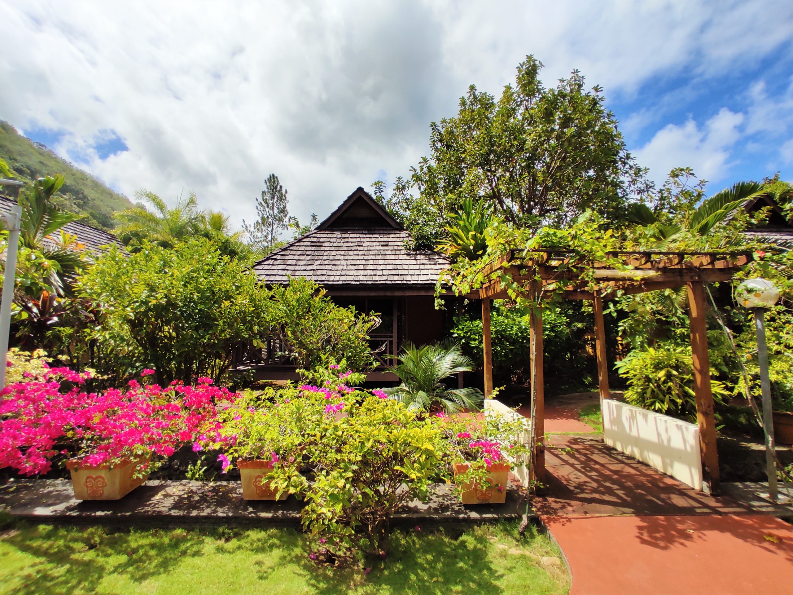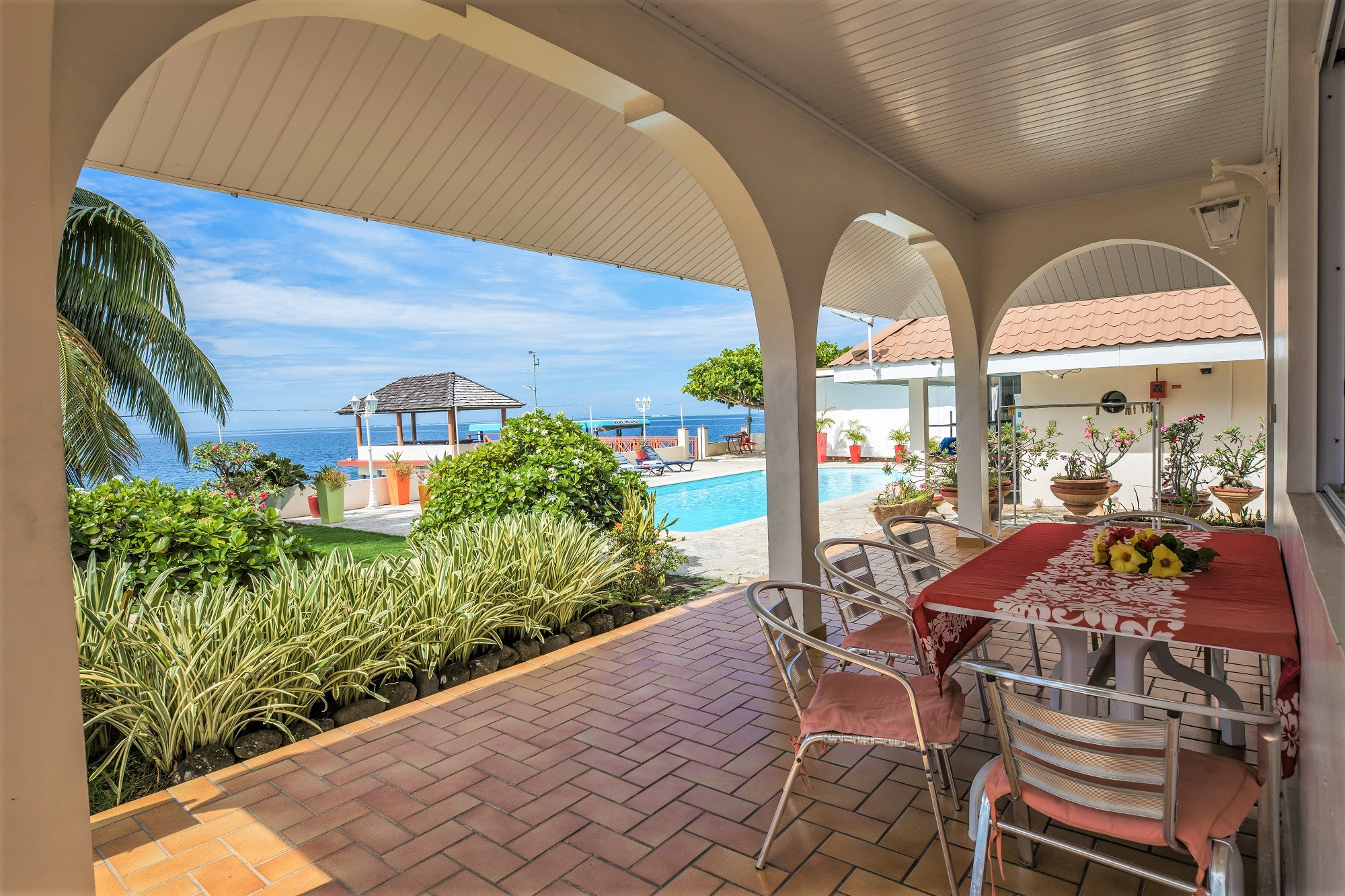En bord de lagon, sont installés une belle piscine avec sa terrasse et ses chaises longues pour prendre vos bains de soleil. Un Fare Pote est à votre disposition avec des tables et des bancs pour prendre vos apéritifs et repas, et pour admirer les couchers de soleil sur le lagon.