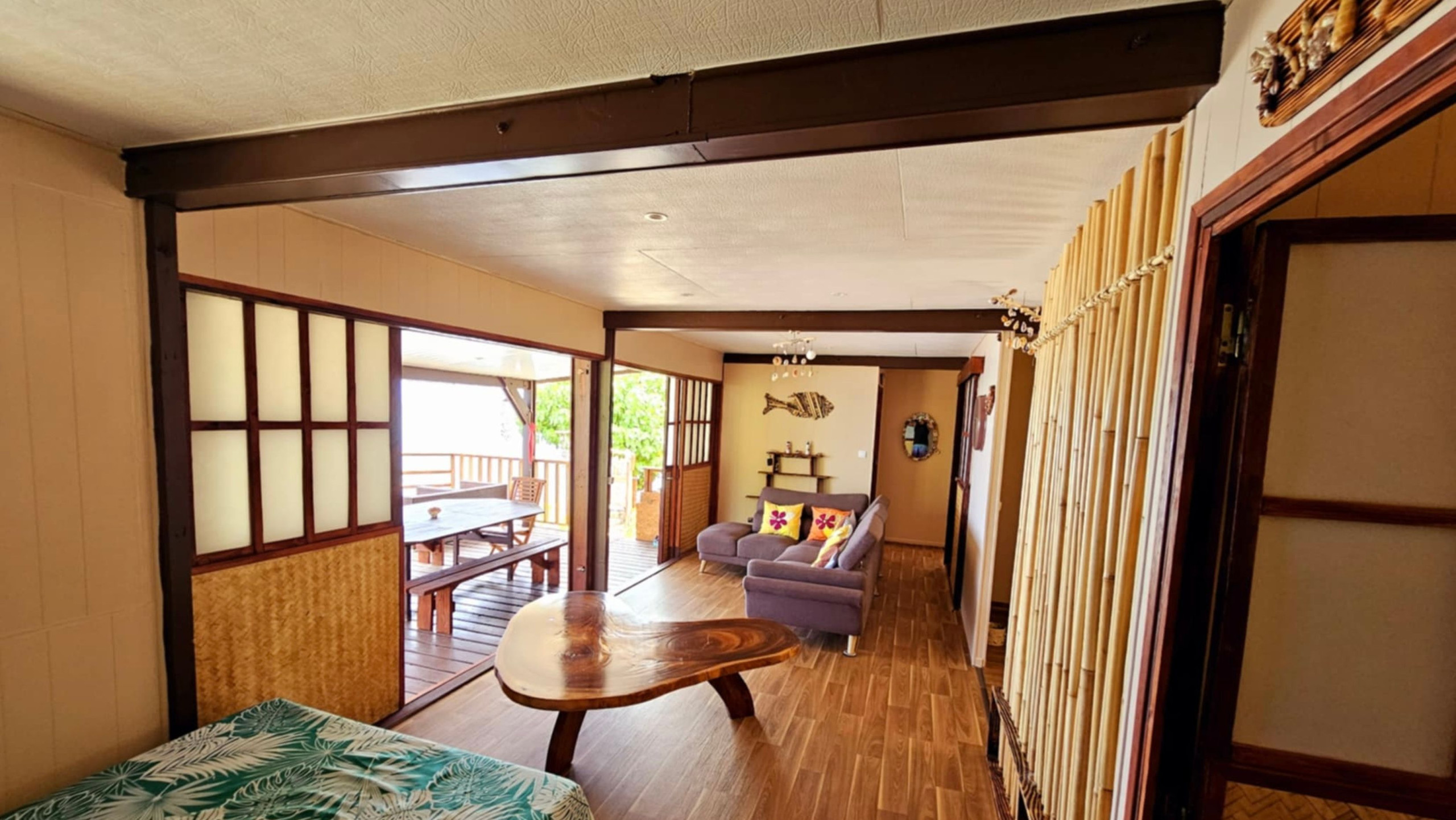 Le salon comprend un canapé d’angle et un lit double, avec vue directe sur le lagon grâce à sa grande ouverture sur la terrasse.