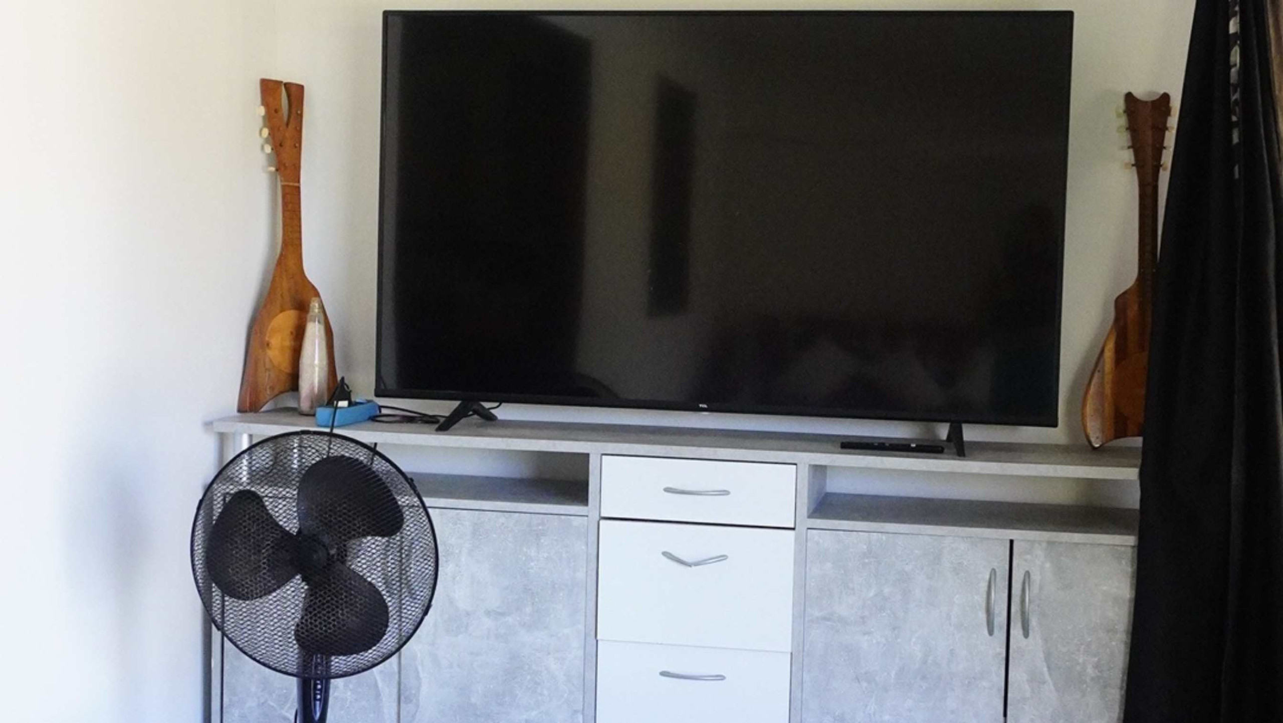Le salon est équipé de ventilateurs sur pied, d’une TV connectée, d’un canapé 2 places et d’un fauteuil. Un lit double supplémentaire peut accueillir 2 enfants de moins de 12 ans ou 1 adulte.