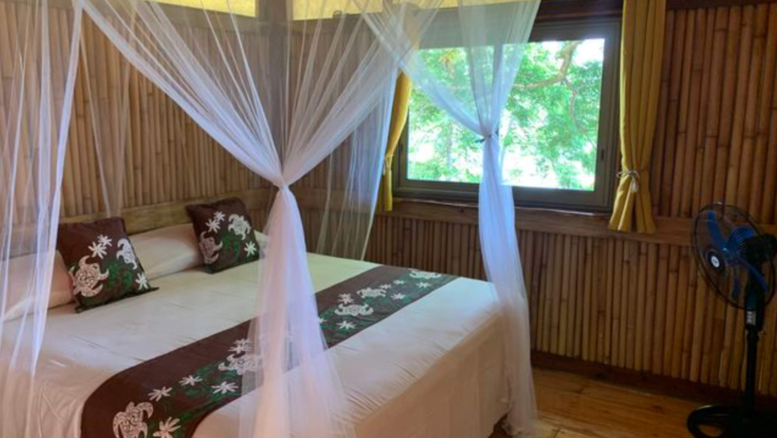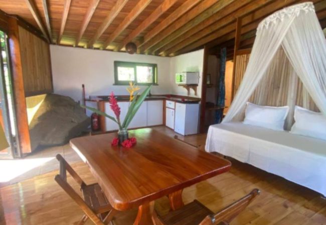 Ce bungalow indépendant peut accueillir 2 personnes et se compose d’une chambre avec lit double équipée de moustiquaire, ventilateur et climatisation, d’un salon ouvert sur la terrasse, ainsi que d’une kitchenette équipée (réfrigérateur, plaques gaz, vaisselle, bouilloire, micro-ondes). La salle d’eau spacieuse avec eau chaude et le WC indépendant apportent confort et praticité. À l’extérieur, une terrasse privée avec vue mer invite à savourer la sérénité des lieux.
