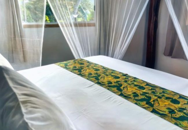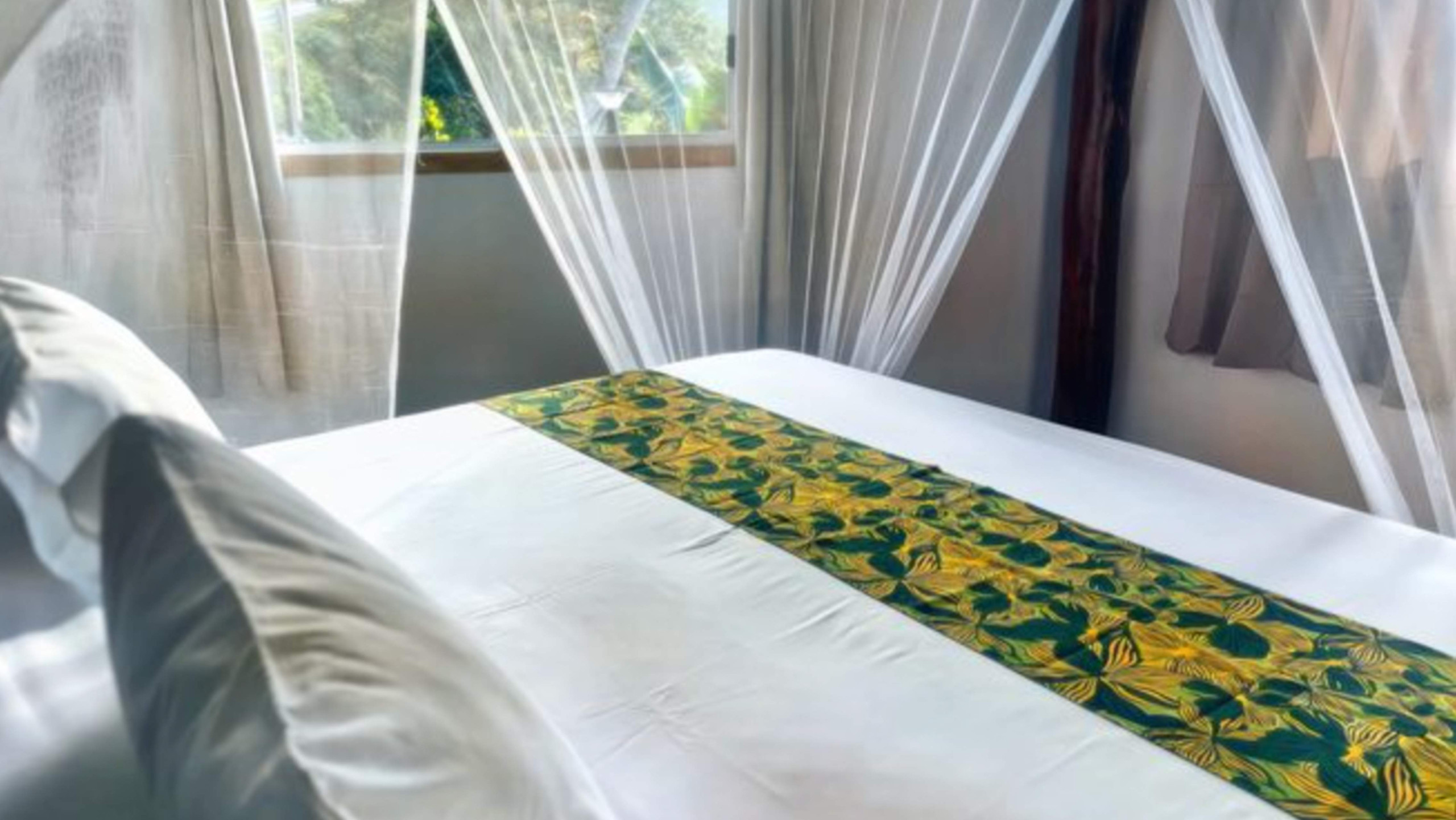 Ce bungalow peut accueillir de 1 à 5 personnes. Il comprend une chambre avec lit double et moustiquaire, une chambre avec 2 lits simples et moustiquaires, ainsi qu’un coin salon avec canapé convertible pour une personne. La cuisine équipée (réfrigérateur, plaques gaz, bouilloire, micro-ondes, vaisselle) permet de préparer vos repas en toute autonomie. Une salle d’eau spacieuse avec eau chaude et des WC indépendants complètent l’aménagement. Les chambres sont climatisées pour plus de confort.