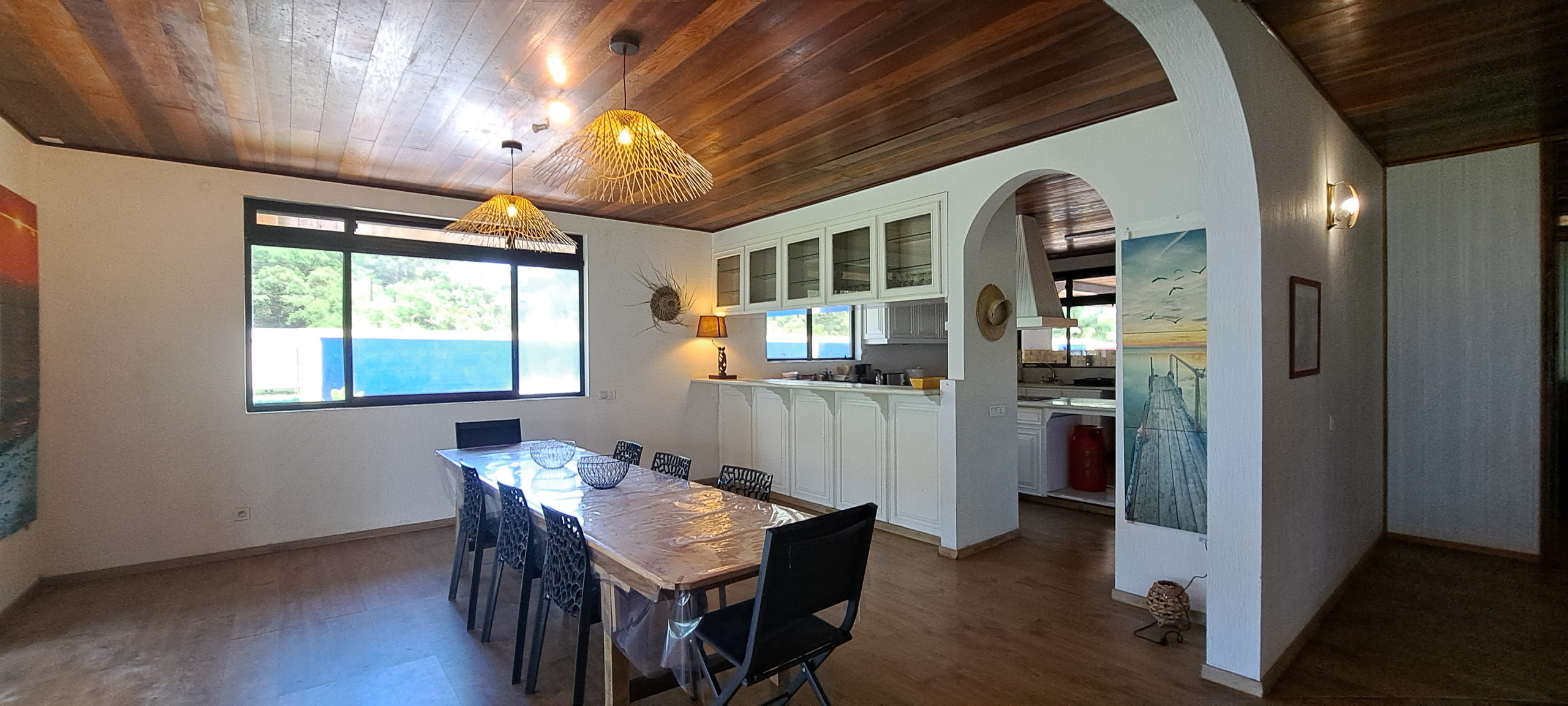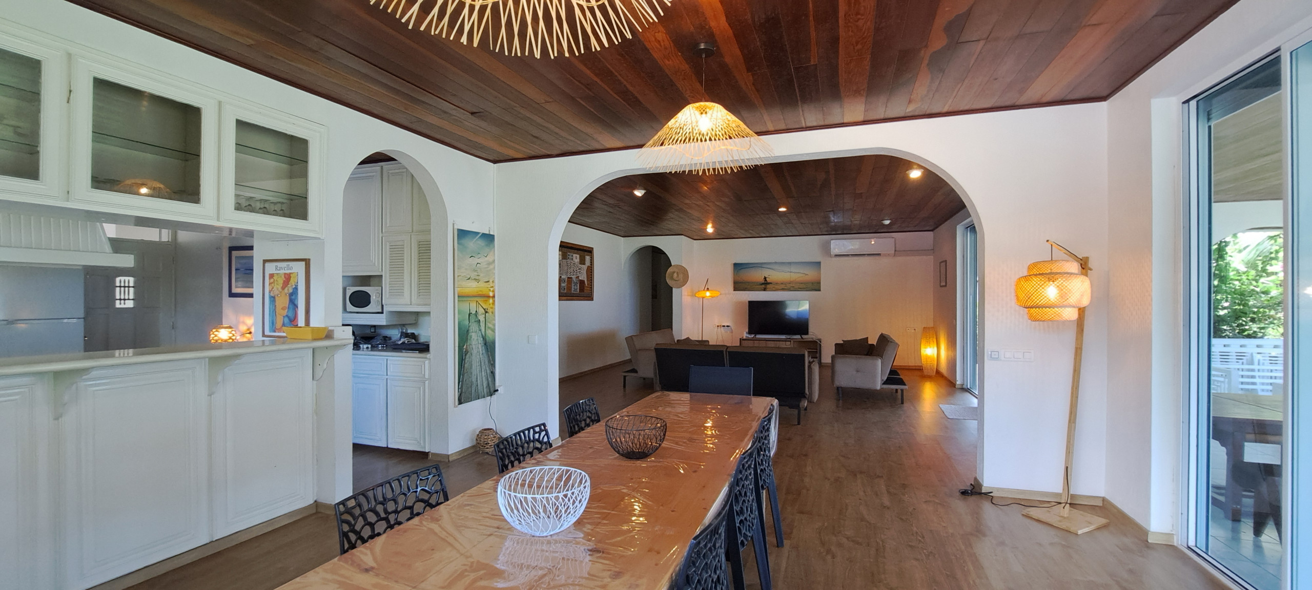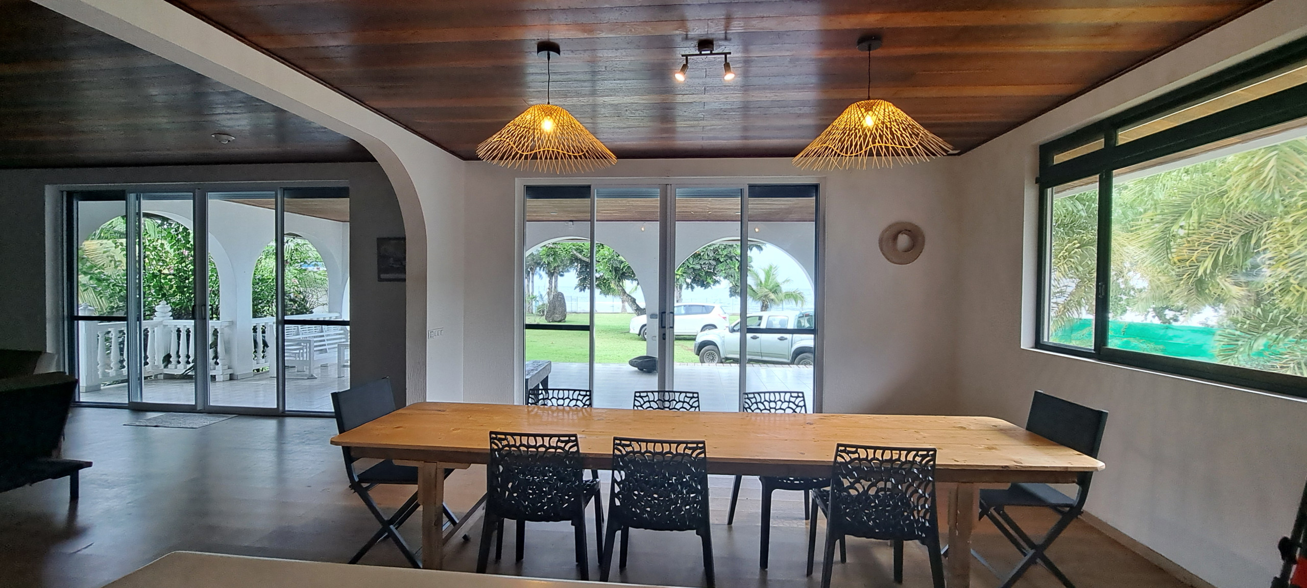 La terrasse arrière quant à elle, vous permettra de prendre vos petits-déjeuner (la boulangerie est à 2 pas de la propriété) et de profiter du jardin arboré et de la vue directe sur le lagon. Un espace pierrade a été aménagé pour vos grillades du soir ou vos brochettes de marshmallows...