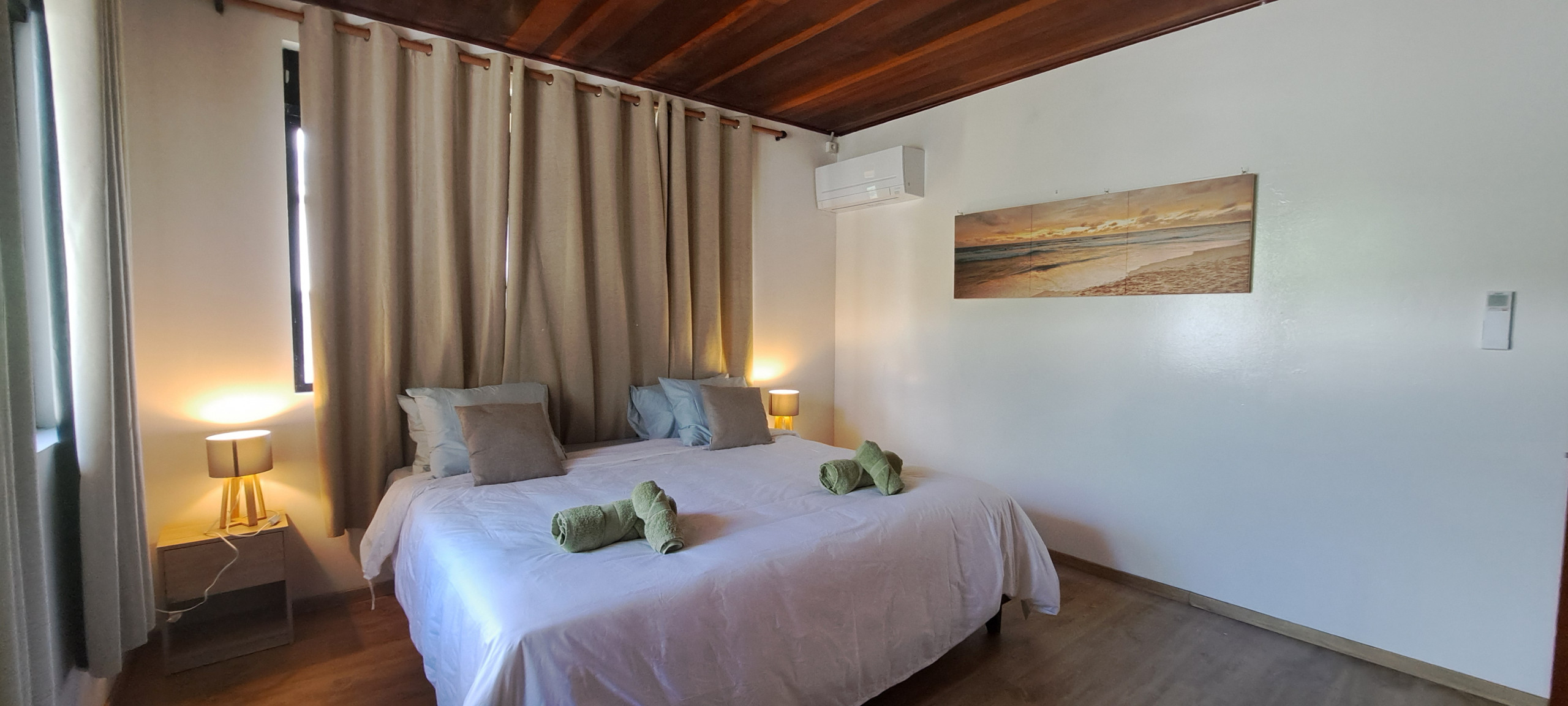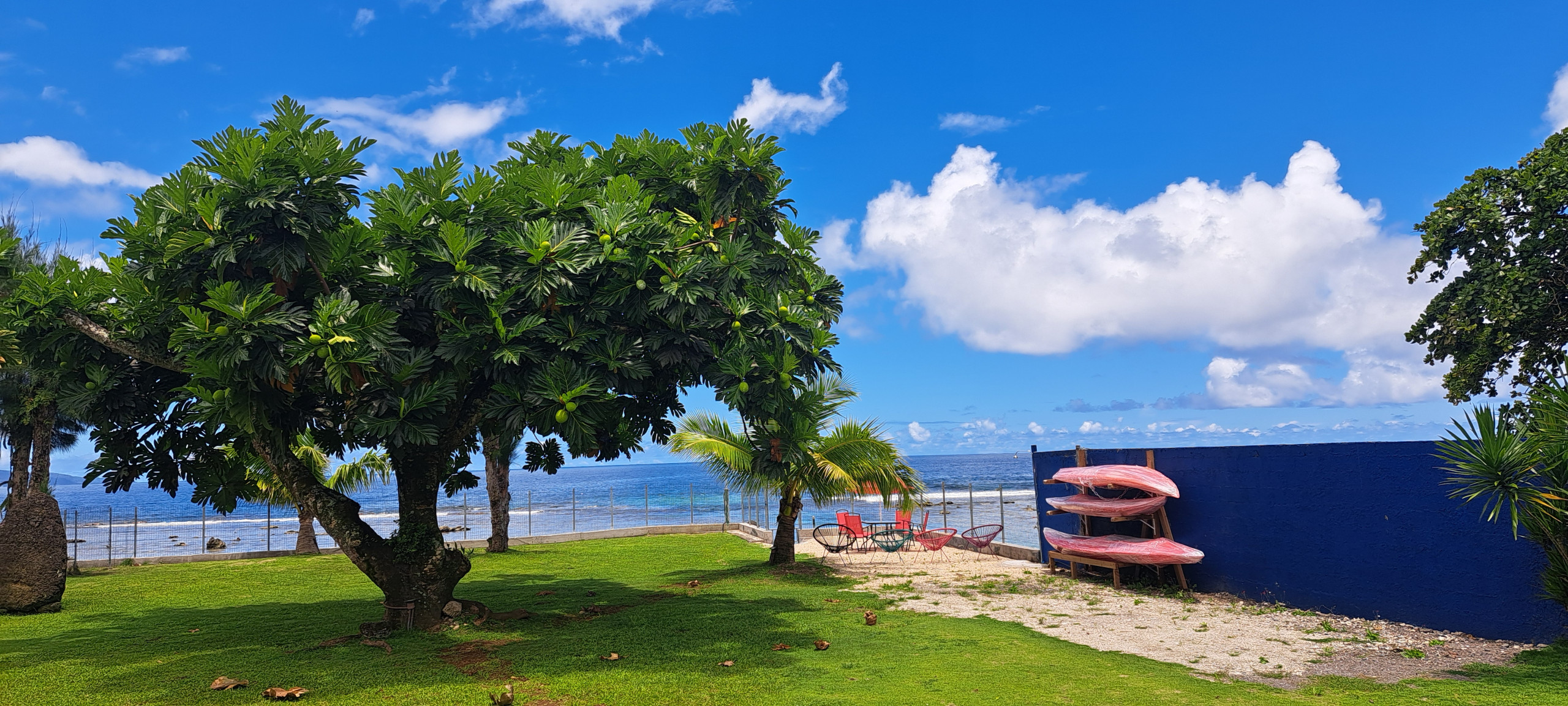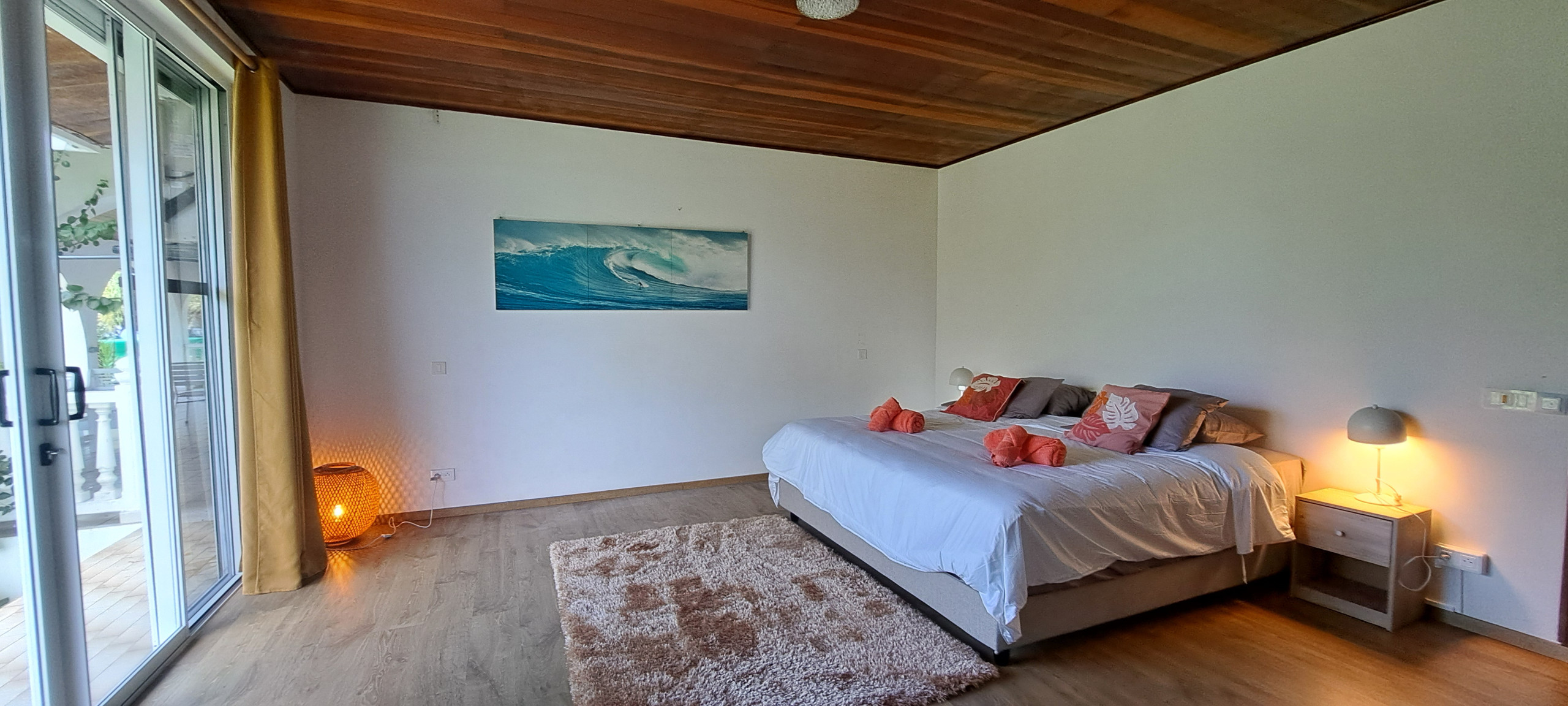 La terrasse arrière quant à elle, vous permettra de prendre vos petits-déjeuner (la boulangerie est à 2 pas de la propriété) et de profiter du jardin arboré et de la vue directe sur le lagon. Un espace pierrade a été aménagé pour vos grillades du soir ou vos brochettes de marshmallows...