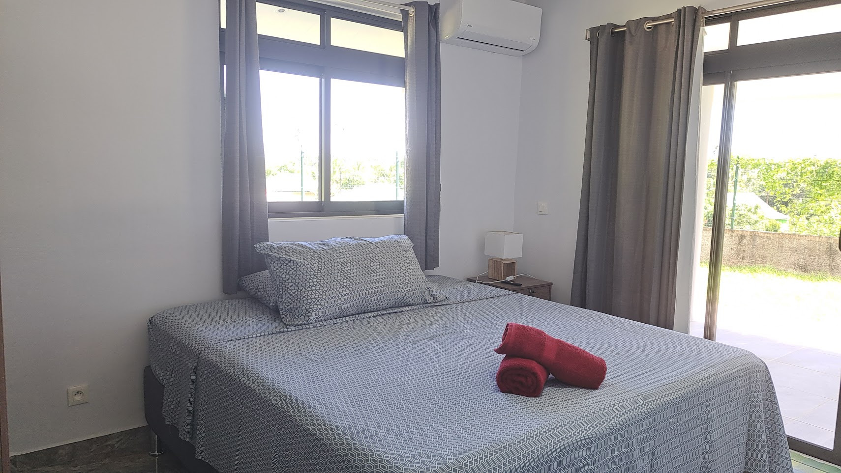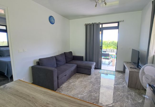 La maison est composée d'une pièce principale avec cuisine ouverte entièrement équipée, un salon avec canapé lit pour 2 personnes, une chambre climatisée avec un lit Queen Size et des rangements, une salle d'eau avec wc. Un lave linge est également disponible.