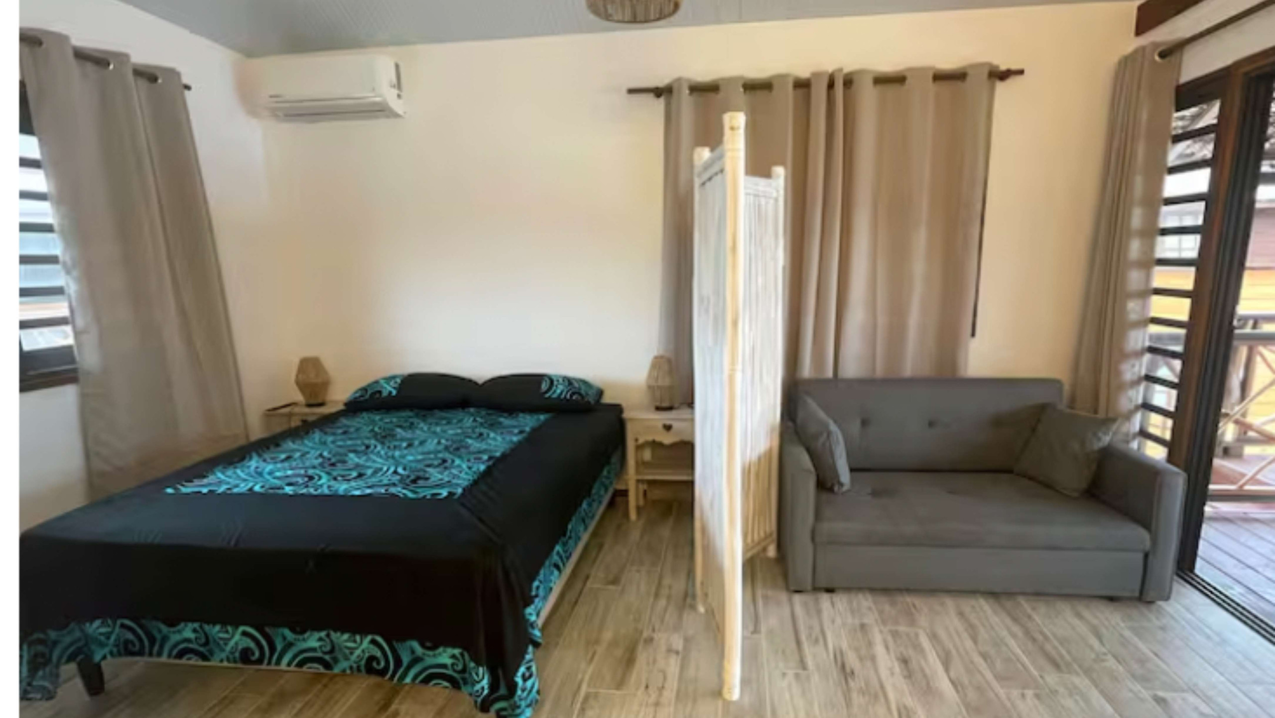 Ce studio lumineux et spacieux dispose d’une grande terrasse privée orientée face au lagon, parfaite pour savourer un café au lever du soleil ou admirer un coucher de soleil flamboyant. À l’intérieur, un espace nuit confortable avec un lit queen size et un clic-clac permet d’accueillir jusqu’à trois personnes.