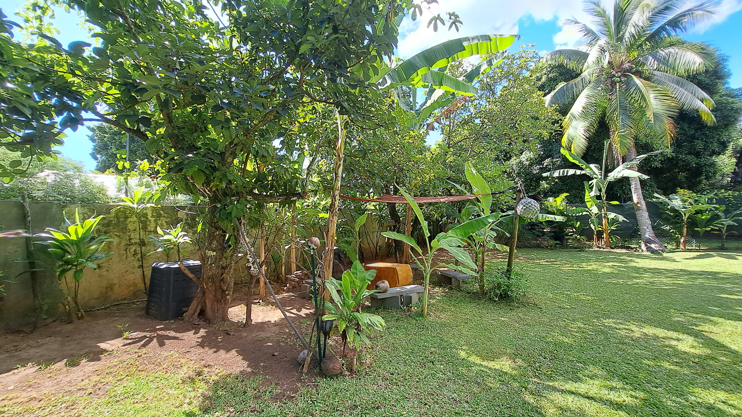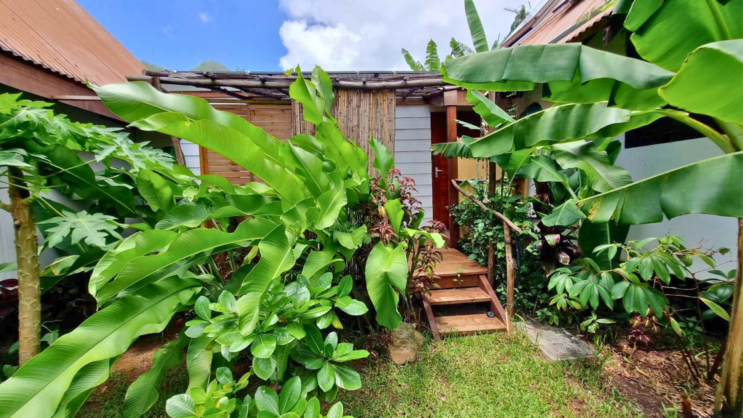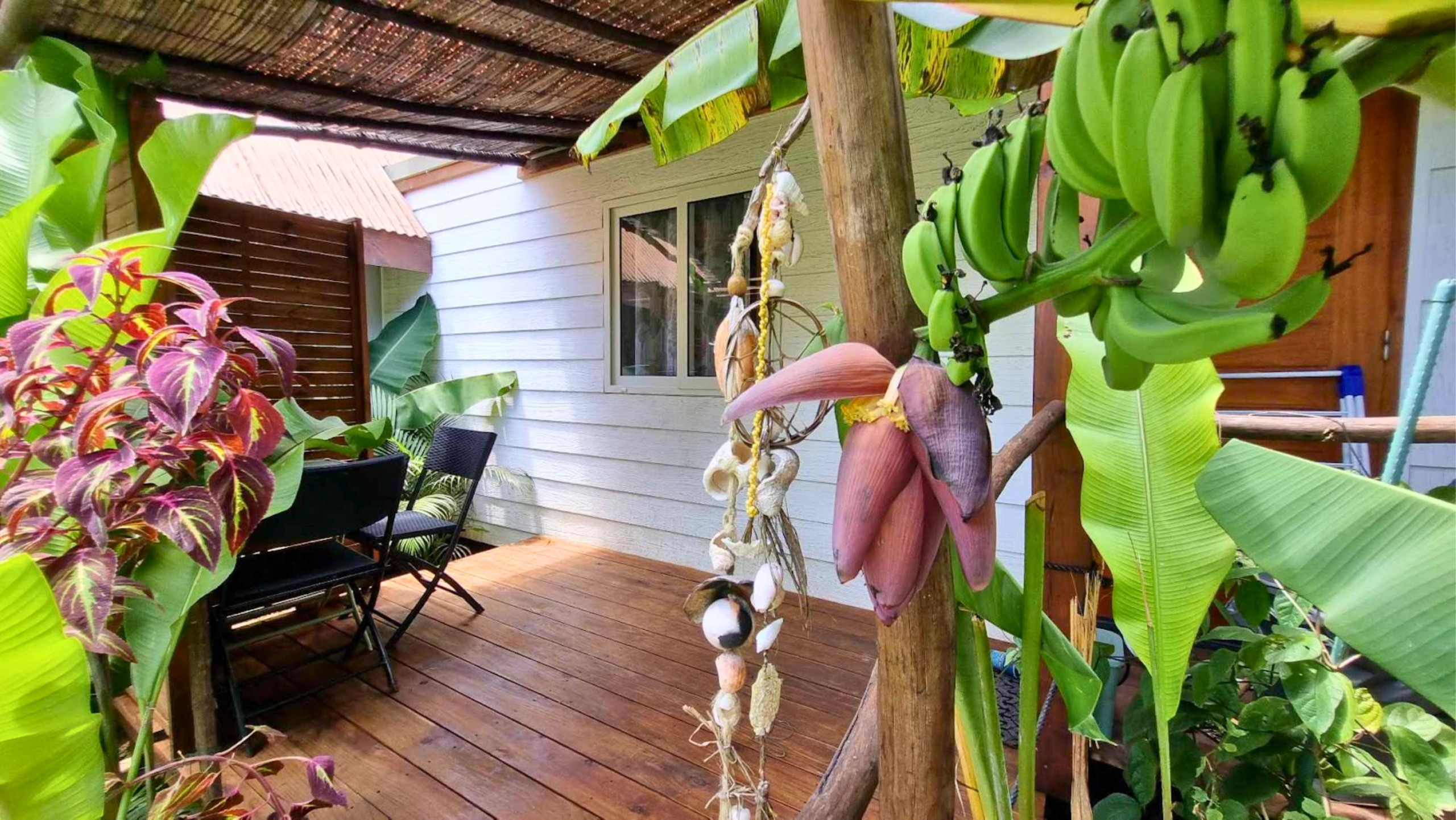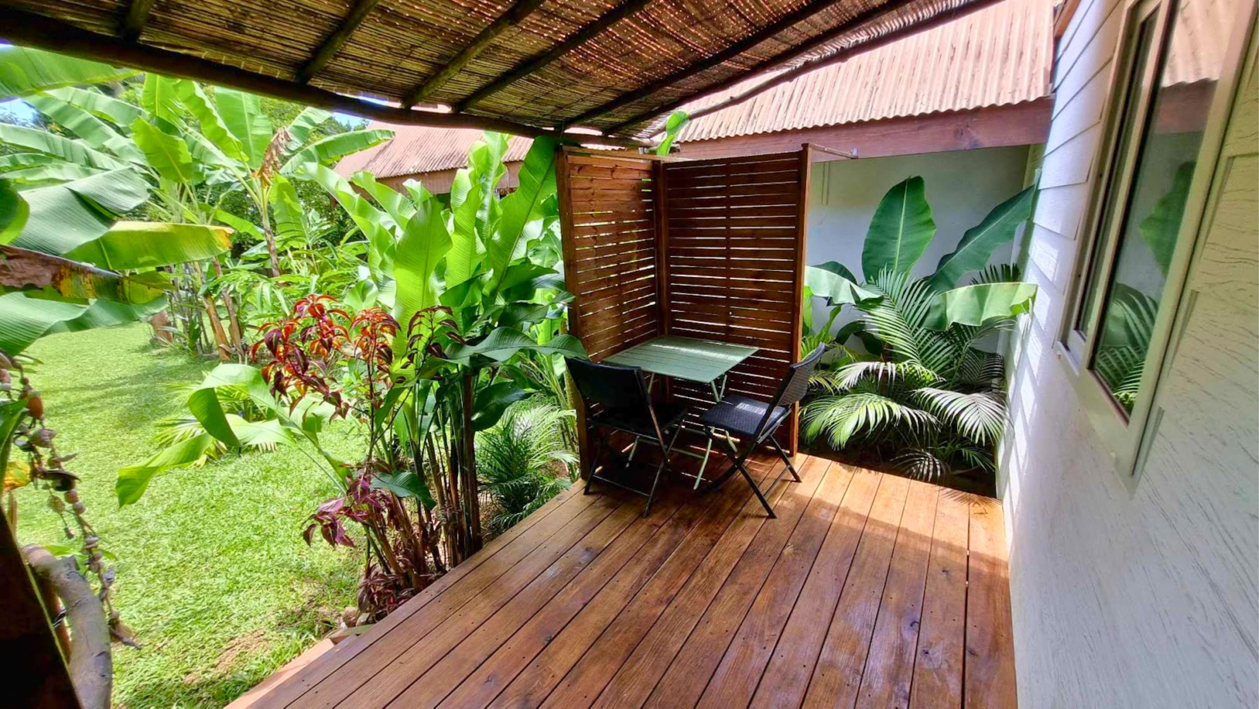 Vous prendrez vos repas sur la petite terrasse extérieure couverte, à l’ombre des bananiers et entouré de verdure.