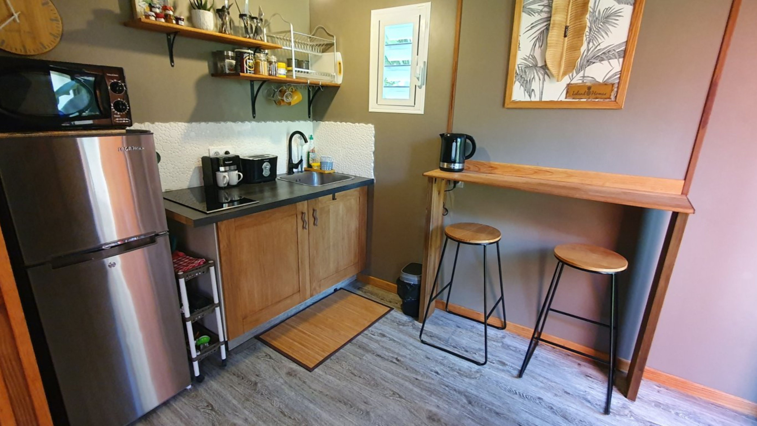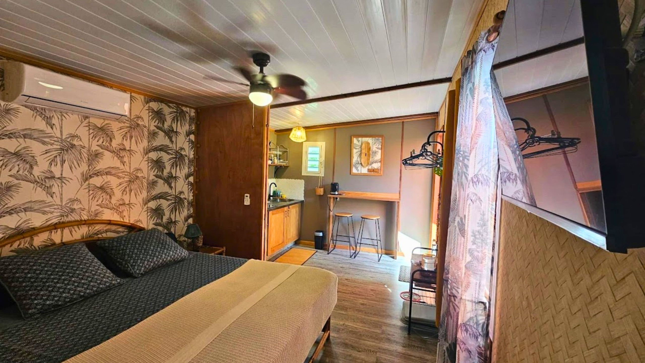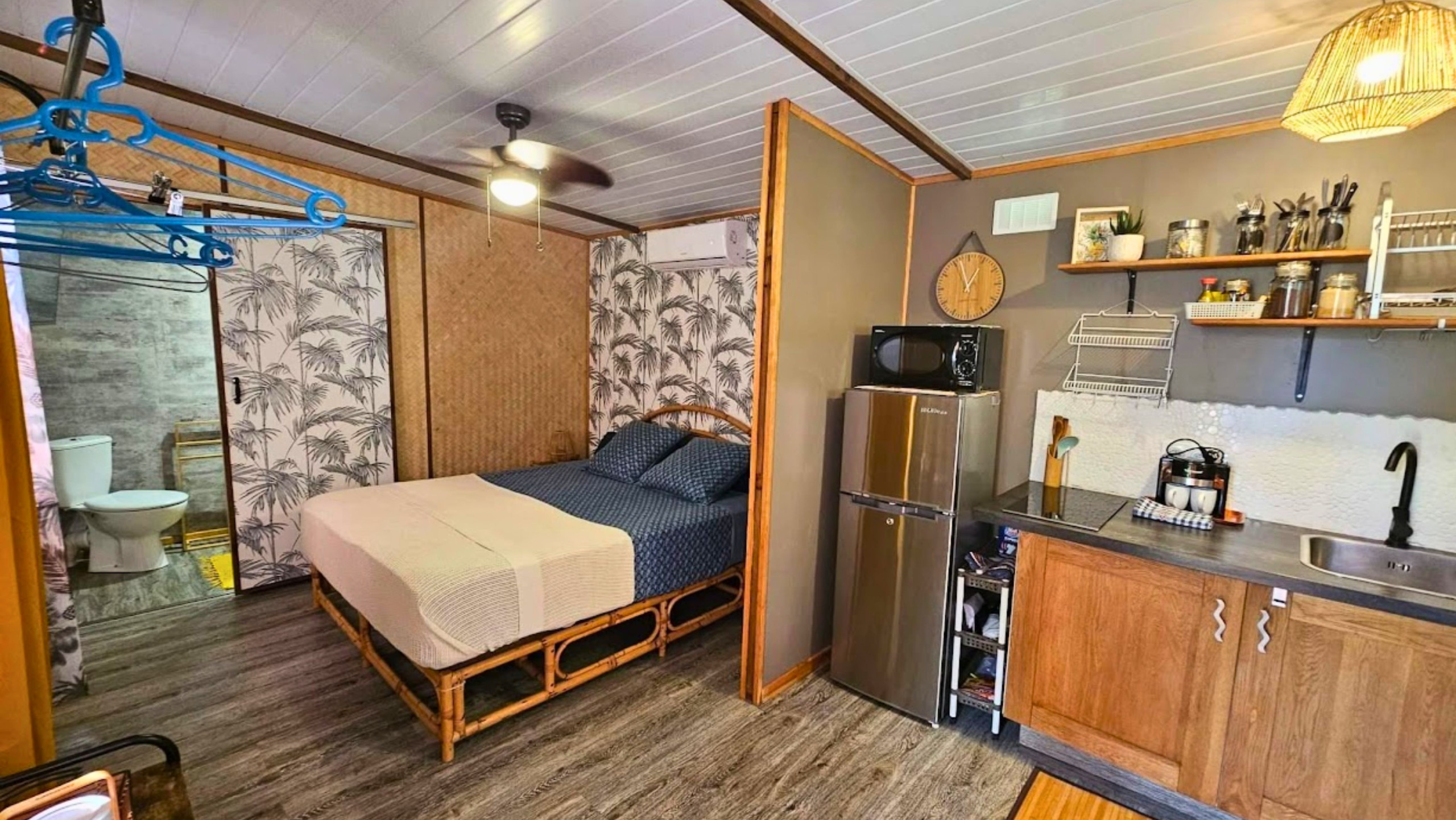 Ce studio en bois, entièrement rénové avec des matériaux locaux, offre tout le confort moderne. Il peut accueillir deux personnes avec son lit Queen Size, une kitchenette bien équipée, une salle d'eau avec douche et WC, et des équipements comme la télévision (Netflix, Prime Video) et le wifi. Profitez d’un petit-déjeuner sur la terrasse ombragée par des bananiers, ou partagez un repas au barbecue commun.