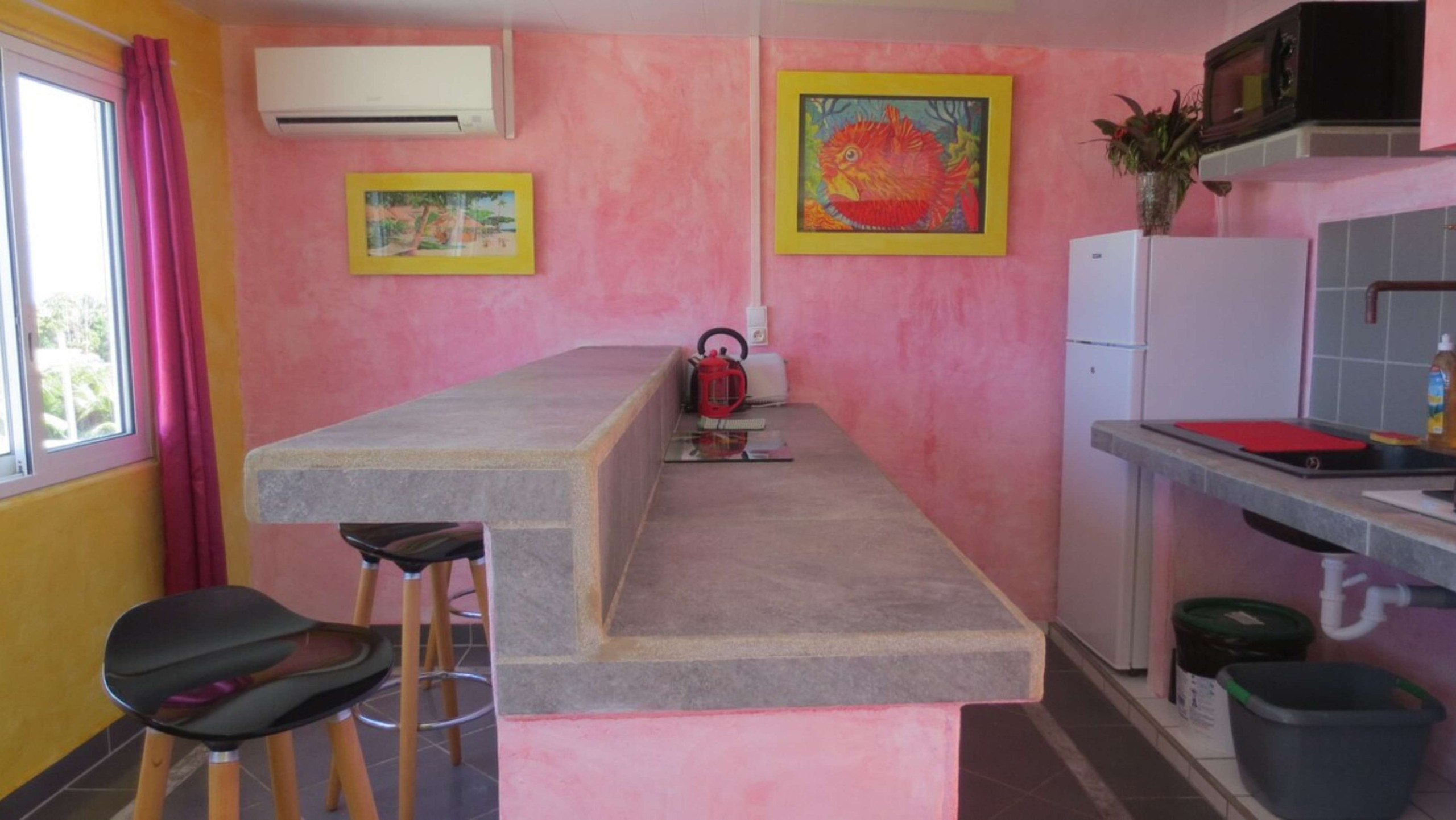 Le logement comprend un séjour lumineux décoré avec soin, équipé d’un lit Queen size et de la possibilité d’ajouter un lit d’appoint. La cuisine aménagée vous permet de préparer vos repas en toute convivialité. La salle de bain est équipée d’une douche, d’un lavabo et de toilettes, dans un aménagement pratique et fonctionnel.