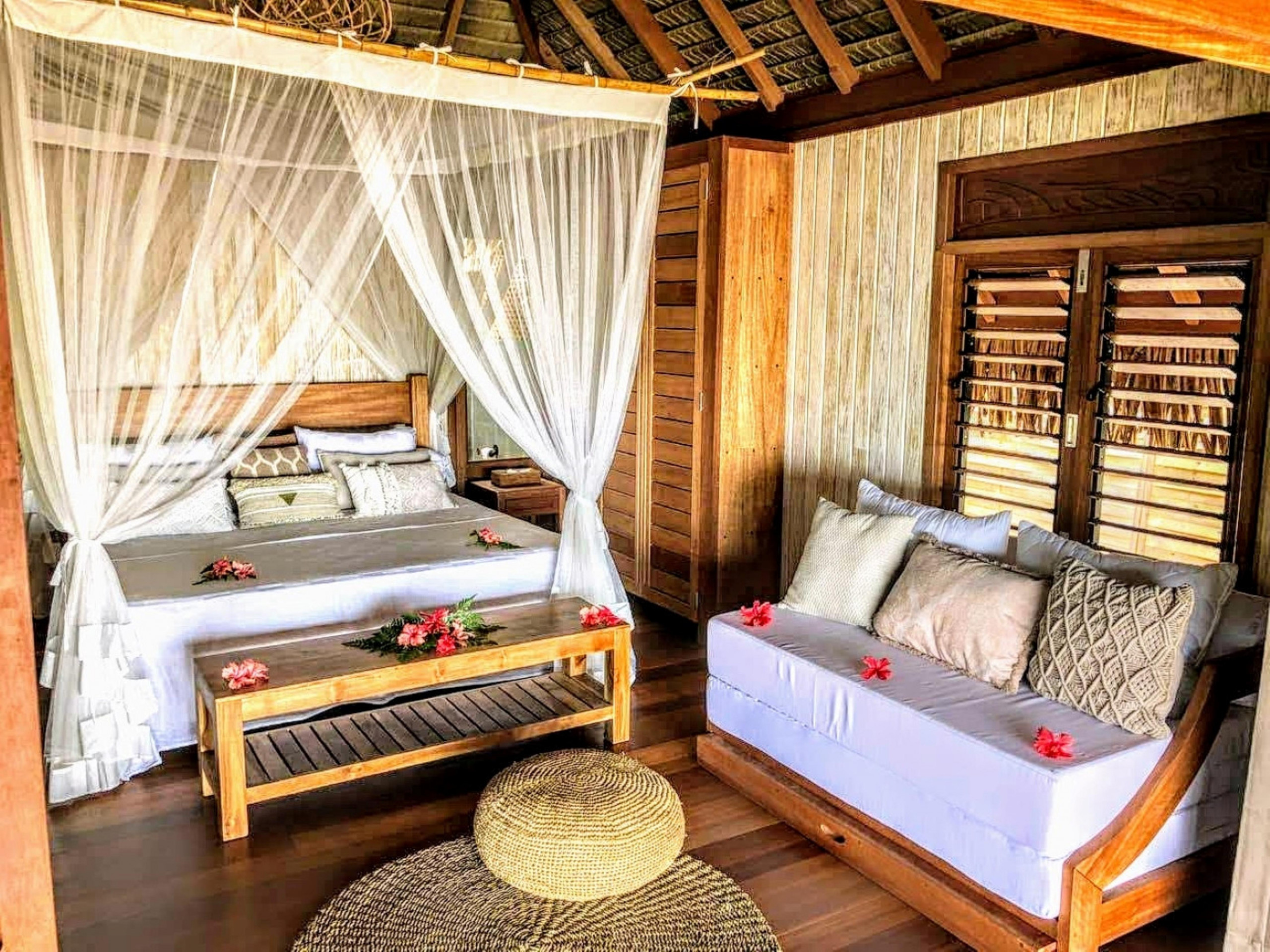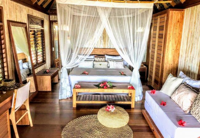 Idéalement situé en bord de lagon dans le district de Tiva. Ce charmant logement est composé d’une chambre confortable avec lit Queen-size et moustiquaire, un coin salon et bureau ; et d’une salle de douche privée. L’ambiance y est élégante et apaisante. Vous apprécierez le calme et la tranquillité des lieux. La terrasse privée sera votre endroit préféré pour admirer le lagon, prendre un apéritif ou simplement vous reposer.