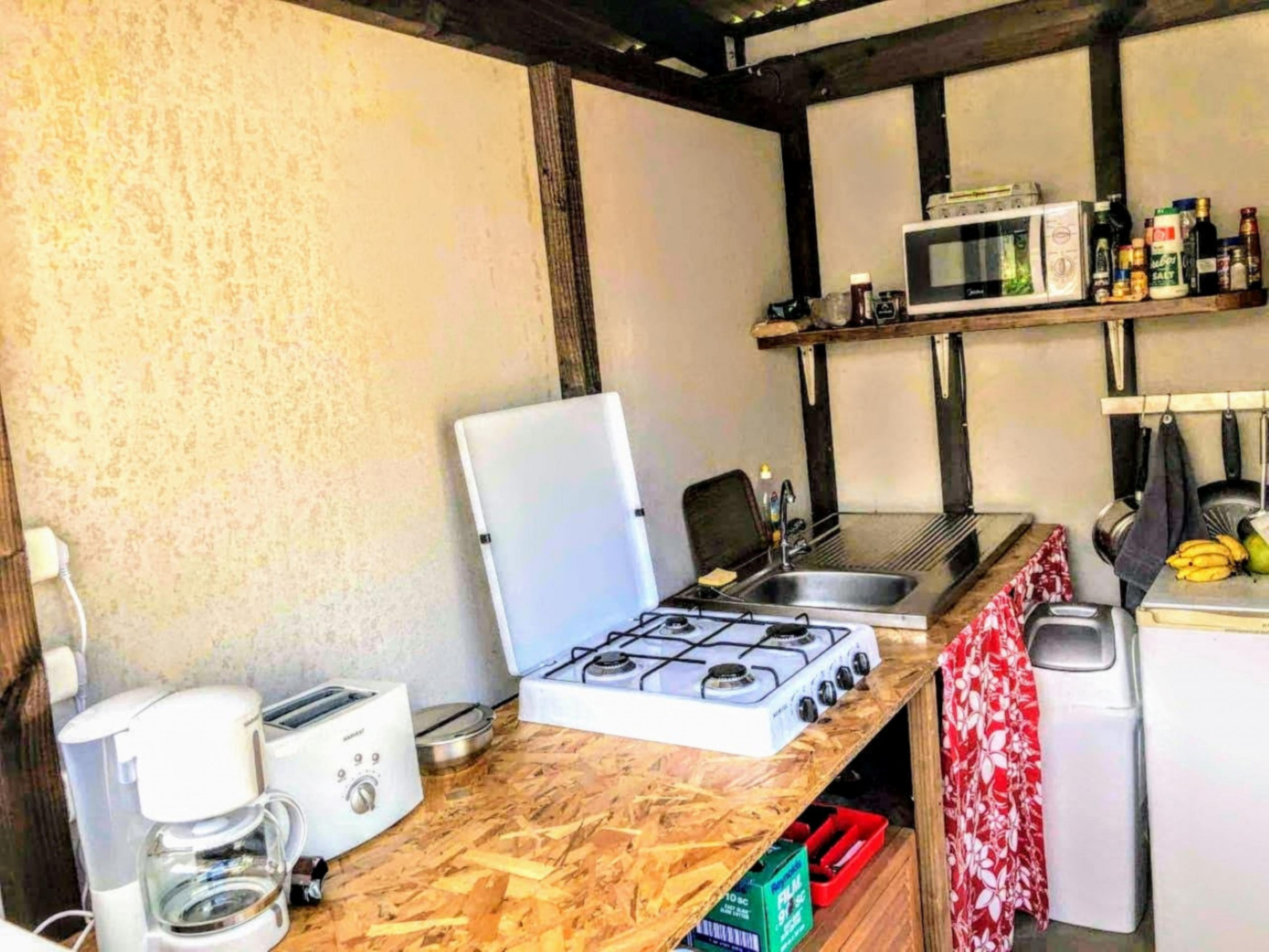 Un espace cuisine, équipé d’une cafetière, réfrigérateur et gazinière est à votre disposition. Cet endroit est à partager avec les occupants du deuxième bungalow.