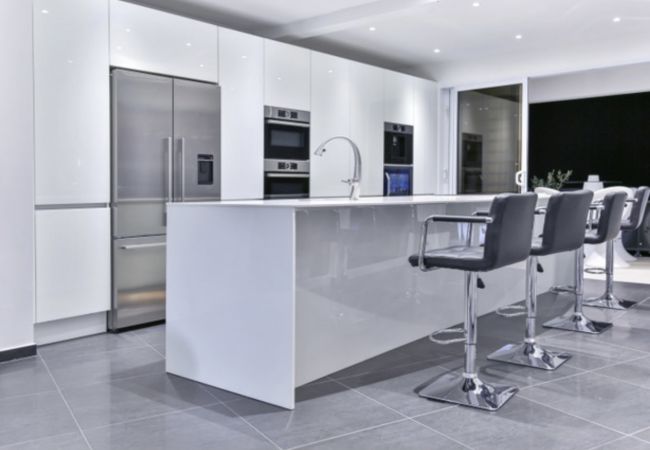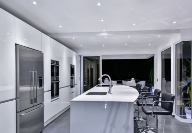 L’élégante cuisine à été pensée dans un style épuré et moderne avec tous ses éléments qui sont intégrés de façon à se fondre dans le décor. La cuisine est ouverte sur le salon avec un vaste îlot central et ses chaises hautes. Vous y trouverez un réfrigérateur congélateur, un four, un micro onde, un lave vaisselle, une cafetière et même une cave à vin !