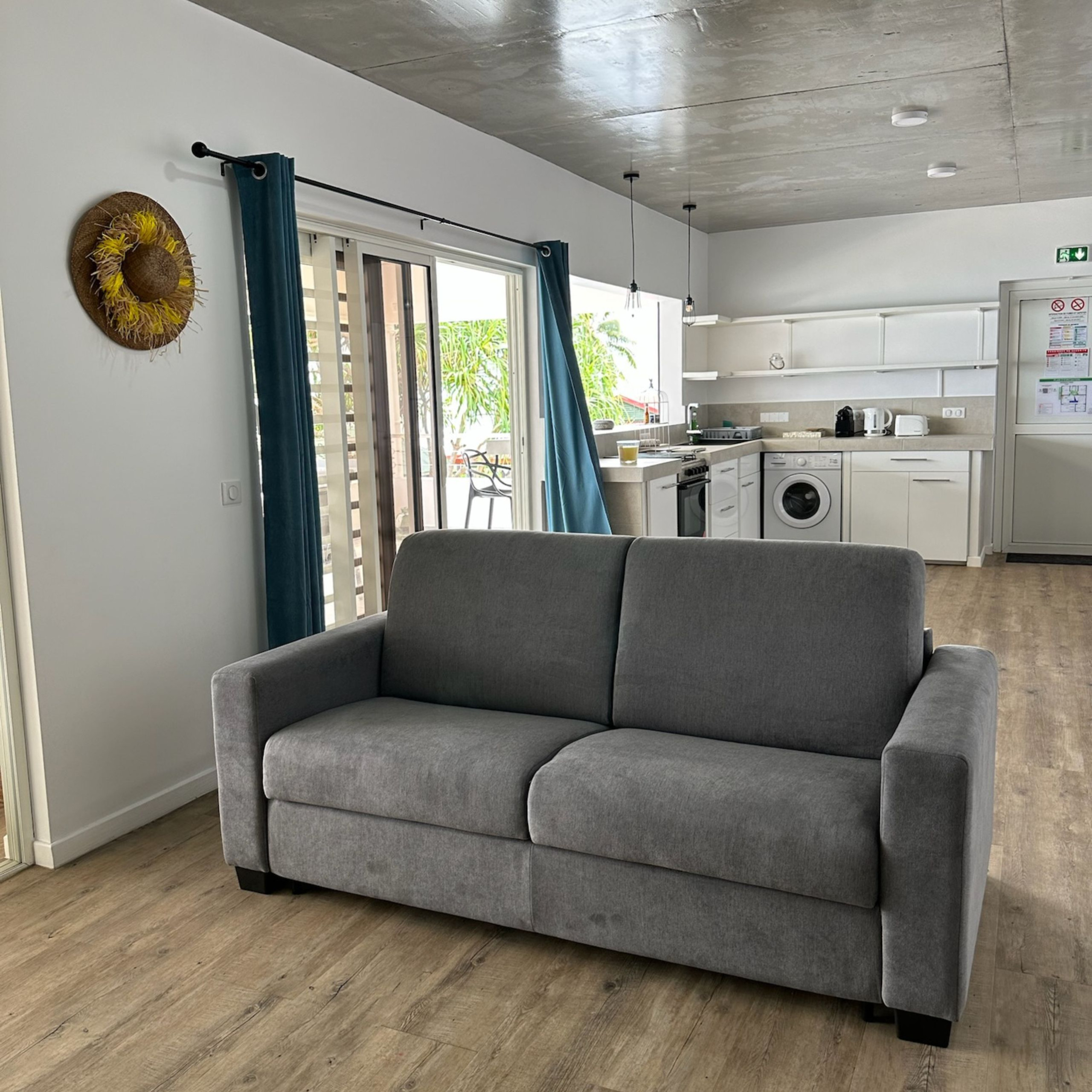 In the living room, a double bed and a double sofa bed can accommodate a further 4 people. It opens onto a fully-equipped kitchen, and features a flat-screen TV and free wifi internet access.