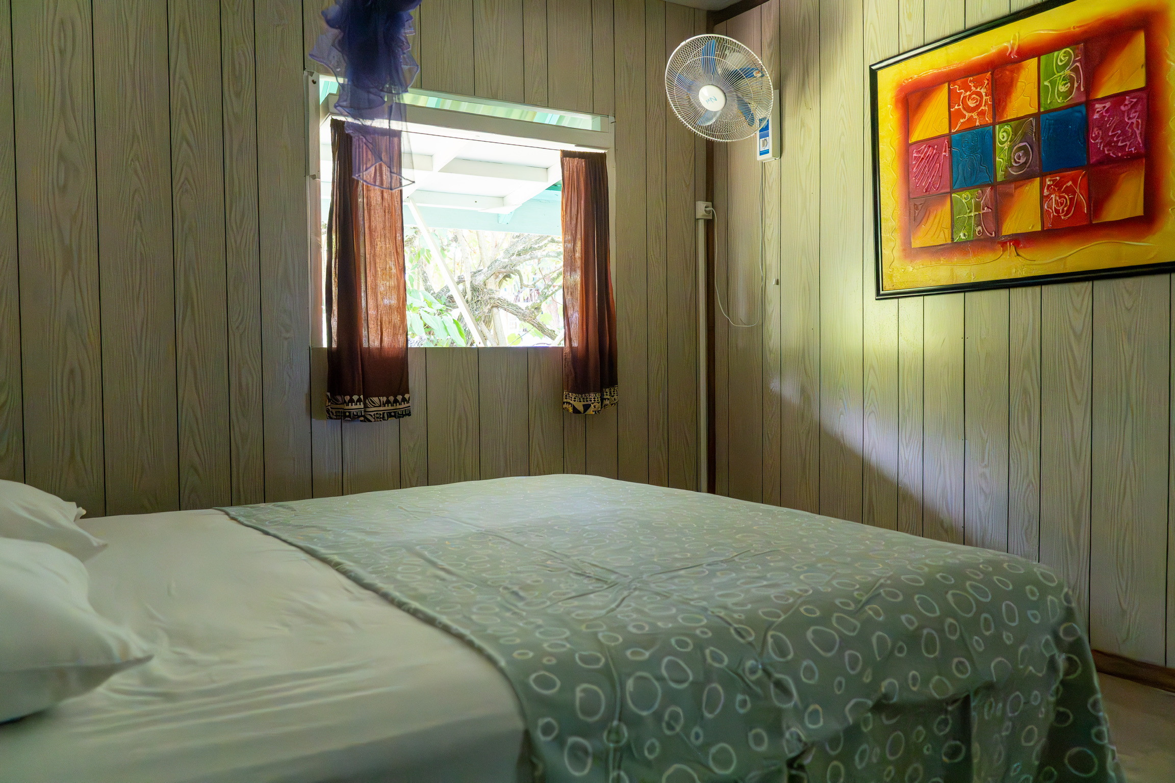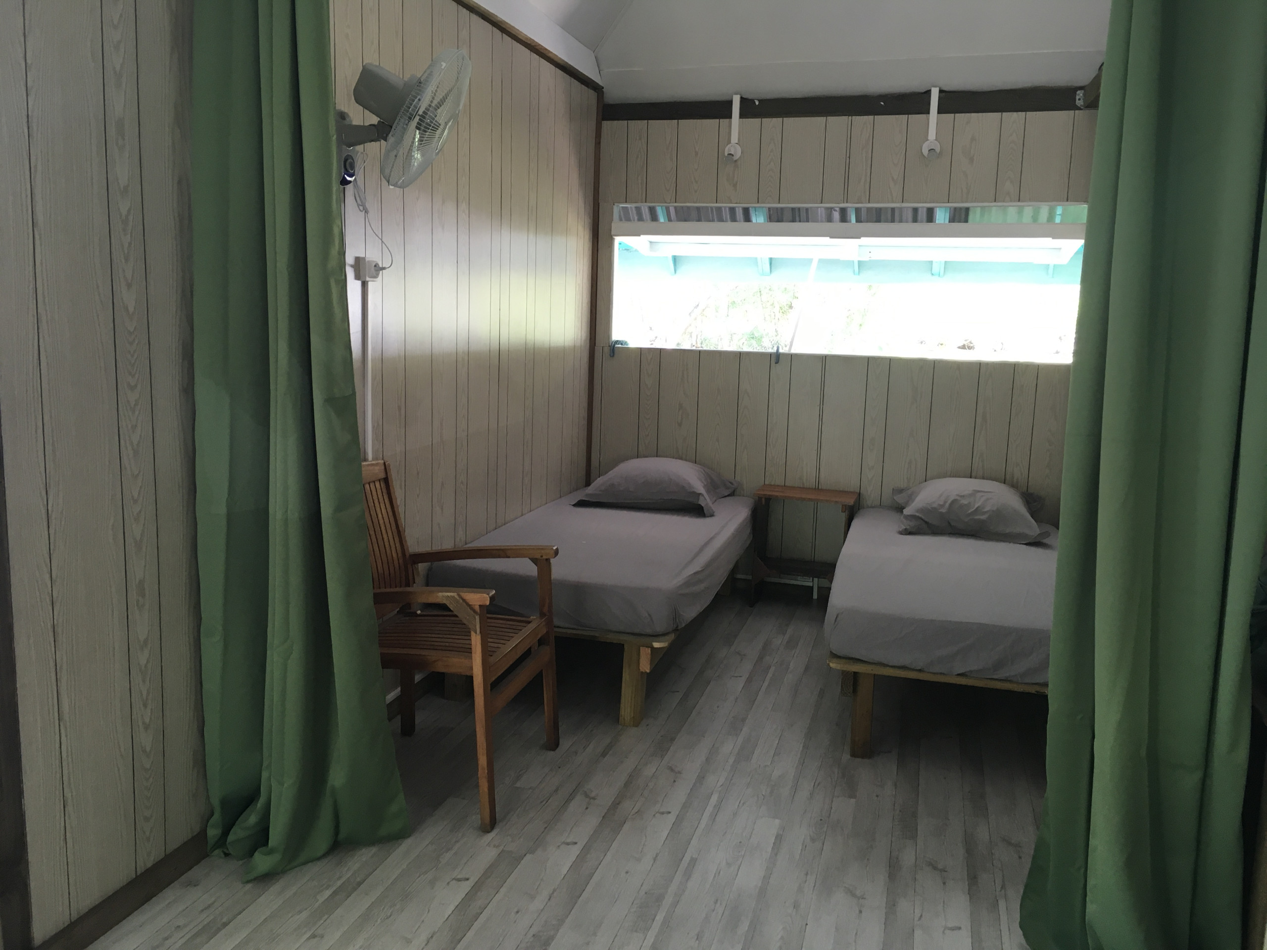 2 bedrooms, each equipped with a queen-size bed + mosquito net and storage space. And a spare room with 2 single beds in the living room. Fans are provided during your stay and 1 safe is included in the bungalow
