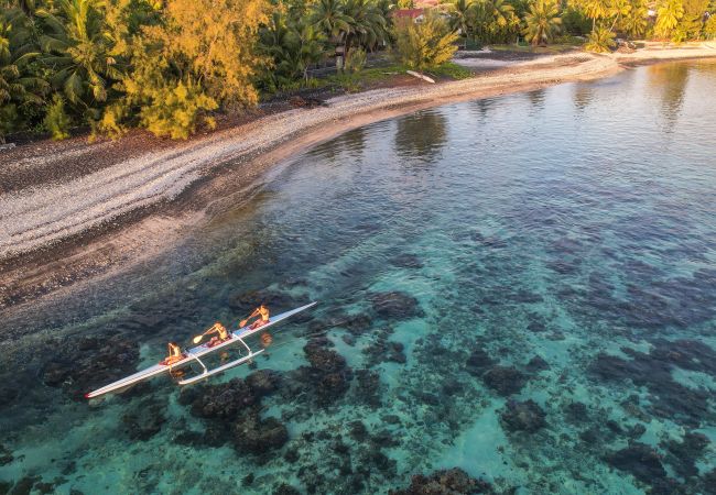 Located on the west coast of Tahiti, in Papara, the Bungalow Manomano Beach Teva I Uta offers you a privileged setting by the beach, in the heart of a calm and verdant family property. You will enjoy an almost private access to white sand and an exceptional lagoon, ideal for relaxation, snorkelling or a kayak outing.