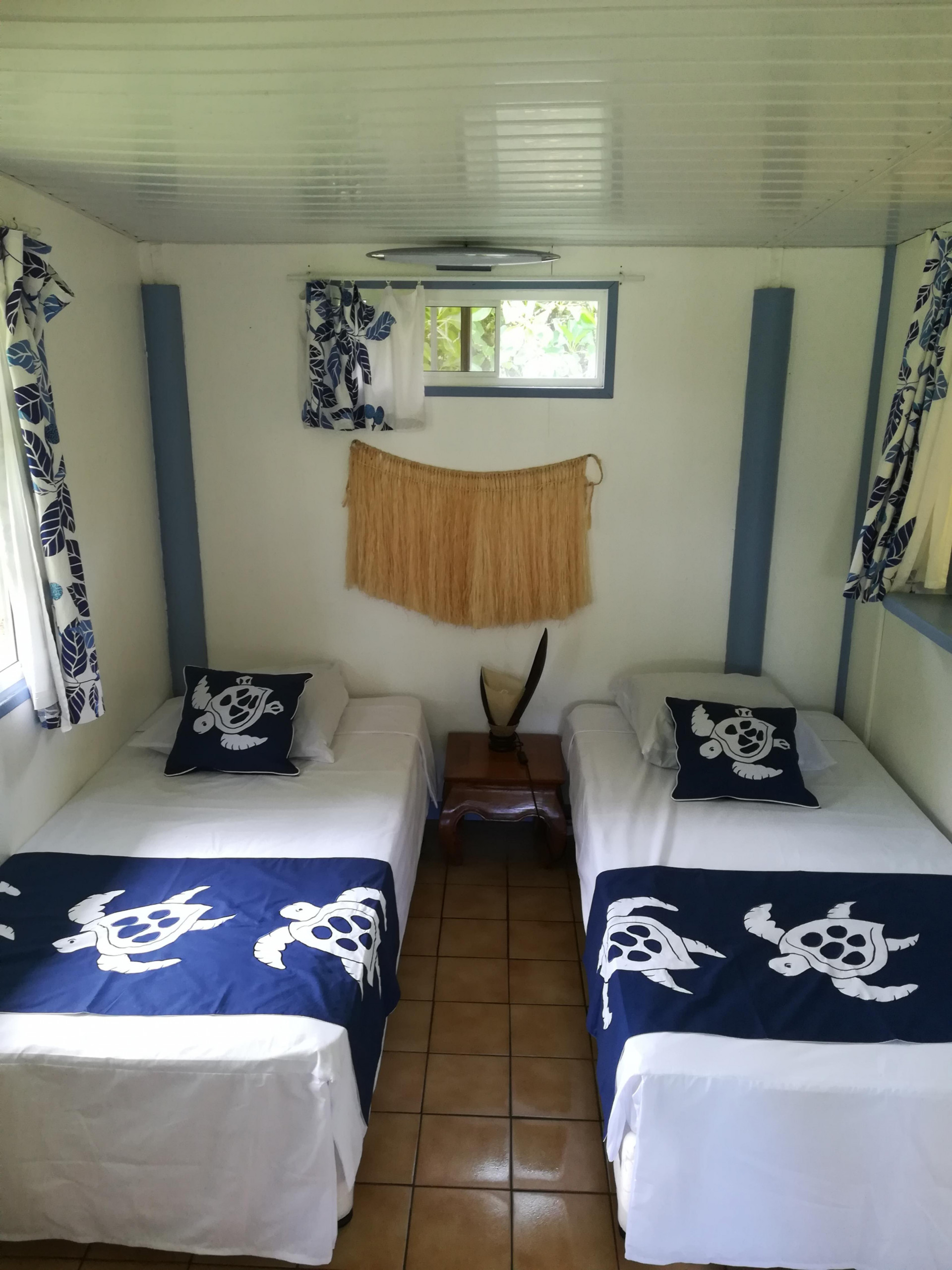 The Hibiscus bungalow can accommodate 4 people in 2 rooms, one room with a Queen size bed, a wardrobe, a mini bar, a TV screen and a room with 2 single beds.