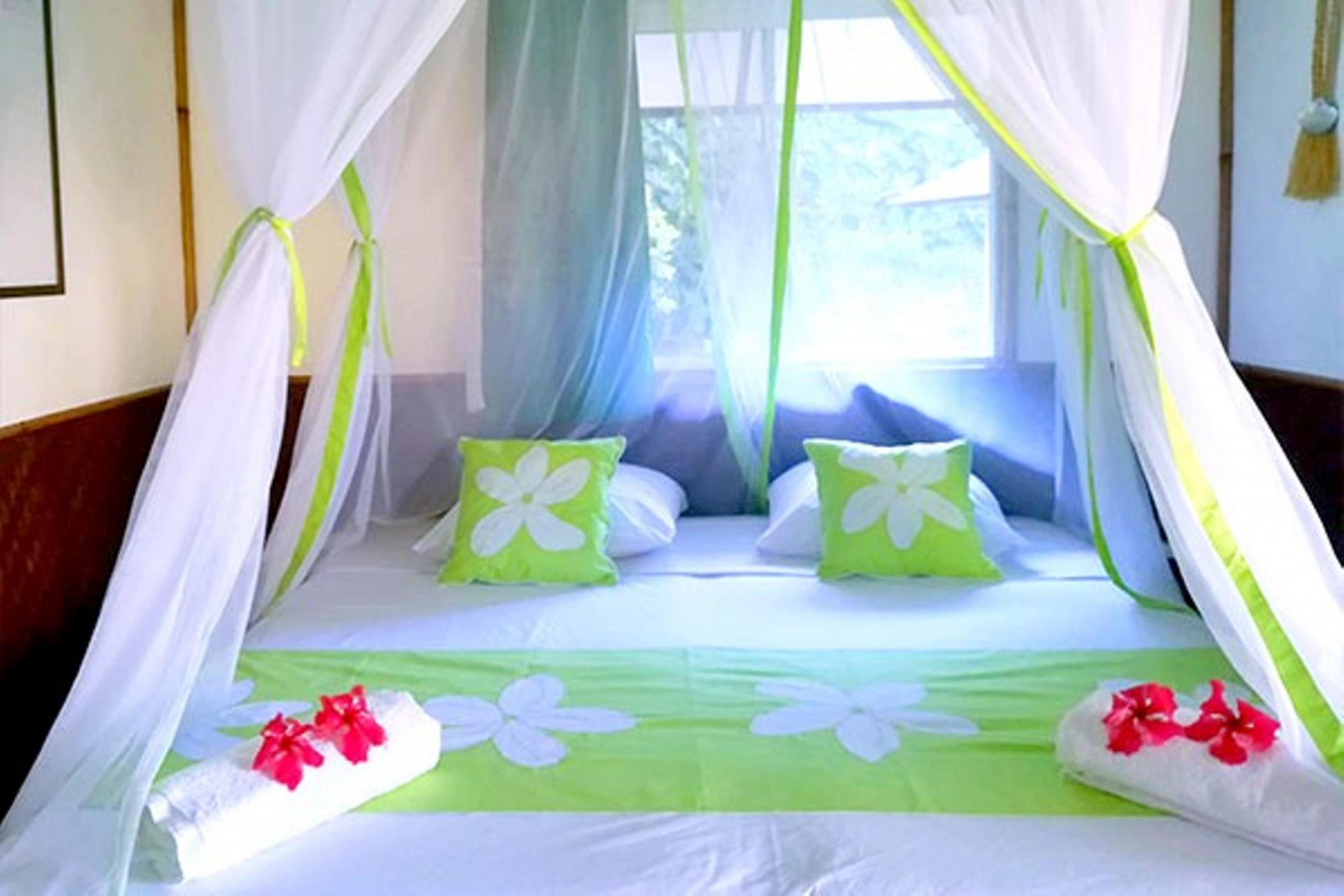 The Te Tiare bungalow is 34m² and can accommodate up to 3 people in a Queen Size bed and a single bed.