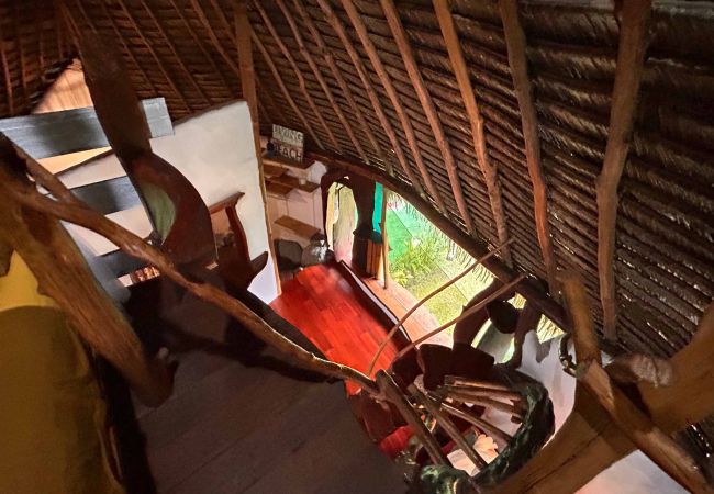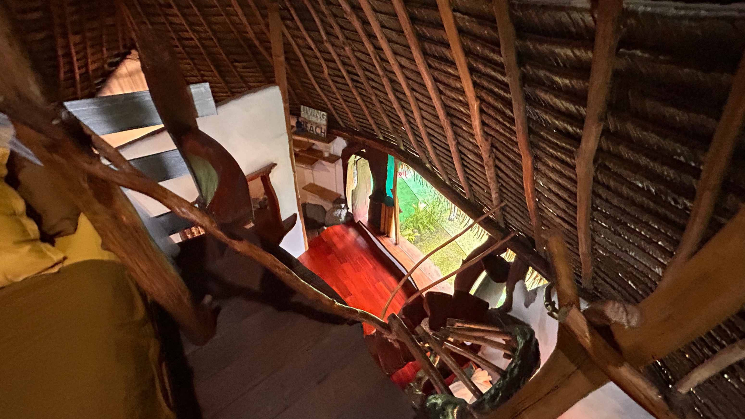 Bungalow 3: family room with two double beds, one of which is on an open mezzanine accessible by a wooden staircase. Bathroom with WC, fan, and verdant view of the tropical garden.