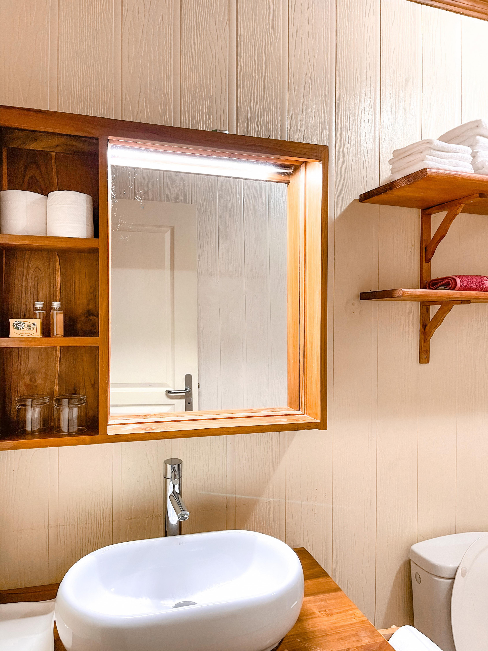 The bathroom is equipped with a shower, a sink and a toilet. Towels are at your disposal.