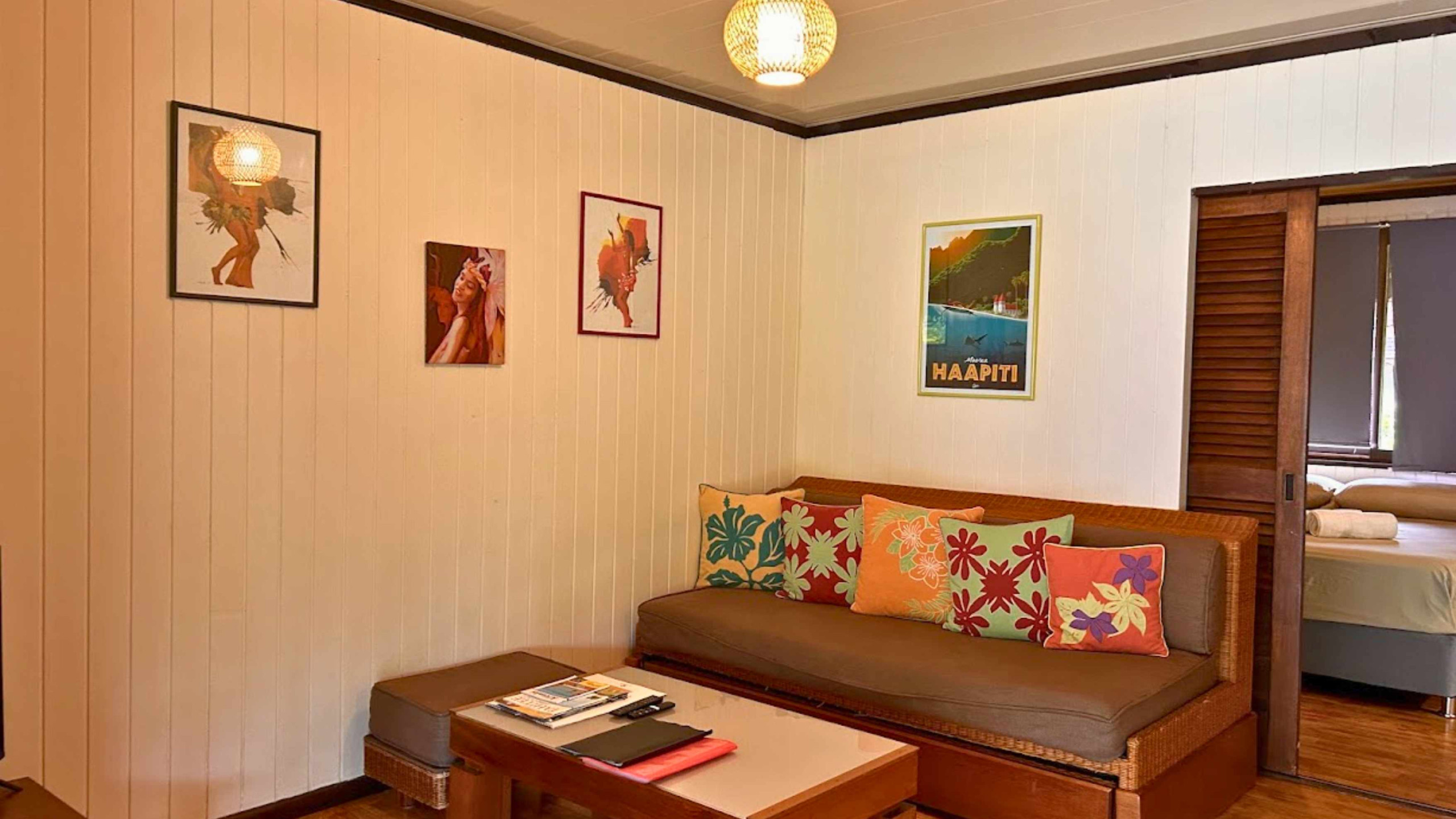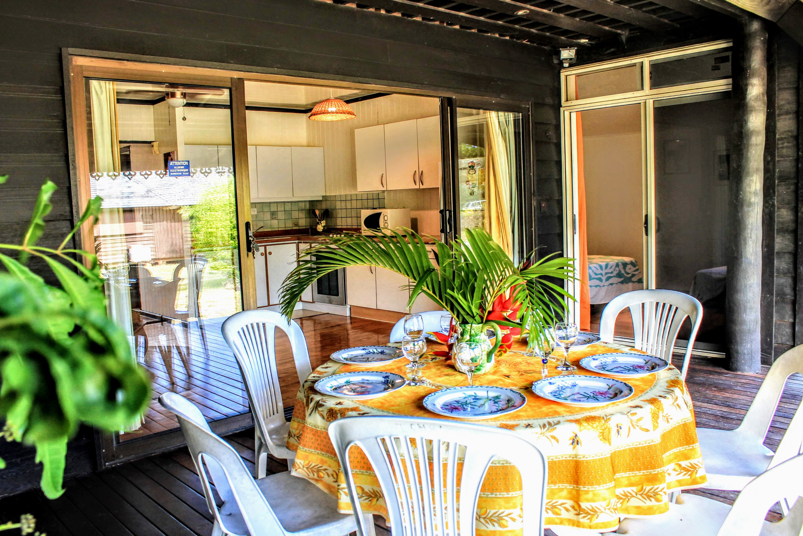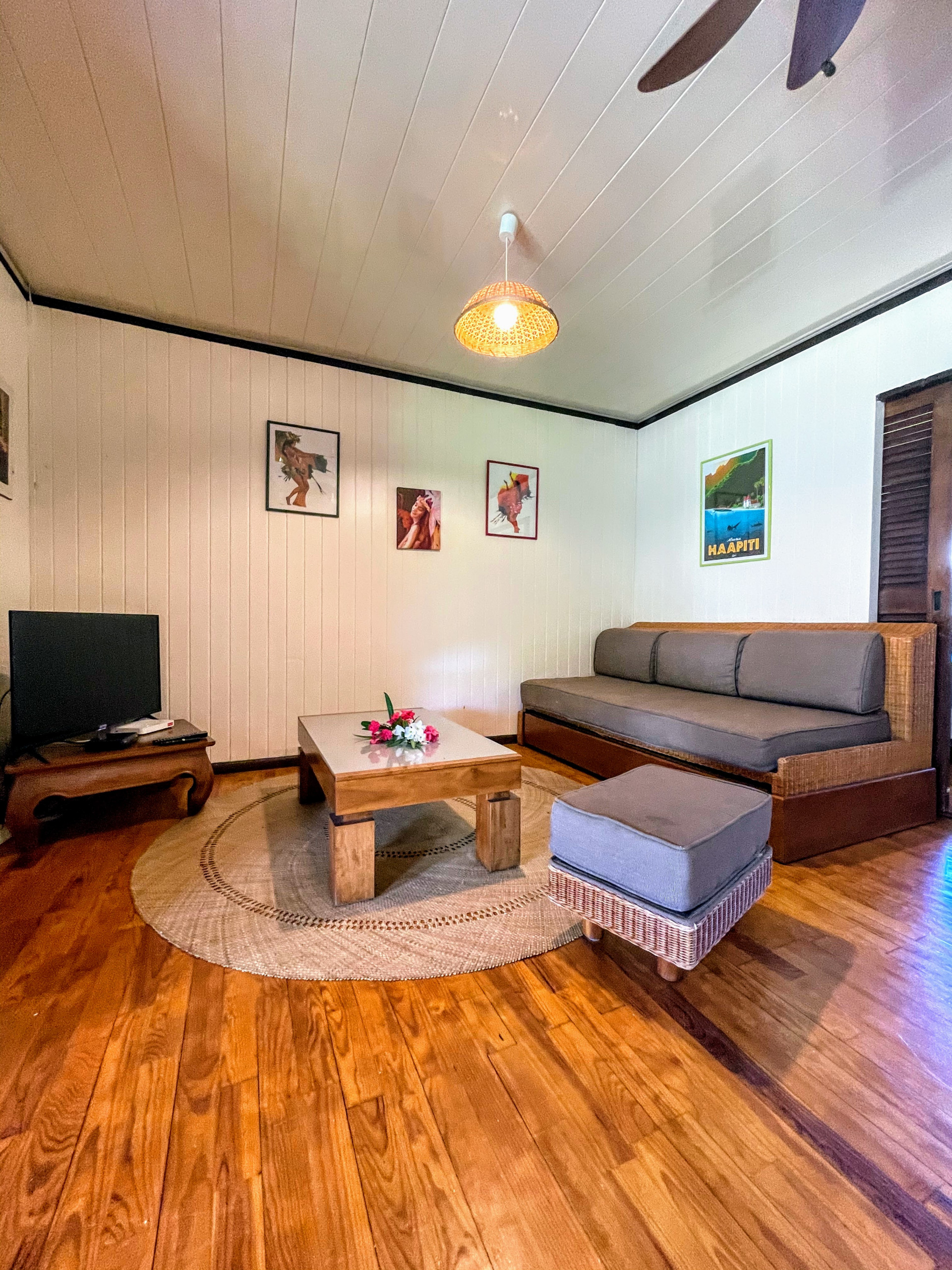 The Fare is composed of 2 confortable bedrooms with air conditionning and 2 bathrooms with shower. The living area has a large flat screen TV so you can watch or discover Polynesian and French TV shows. This spacious room can also welcome 2 additional people thank to the 2 single sofa bed. The kitchen, is entirely equiped and practical to prepare Top Chef diner and, delight your loved ones with local fresh products from the island. The terrace, will be your favortite area. It is well arranged so you can take your meals on the covered terrace or simply relax and enjoy a cocktail.