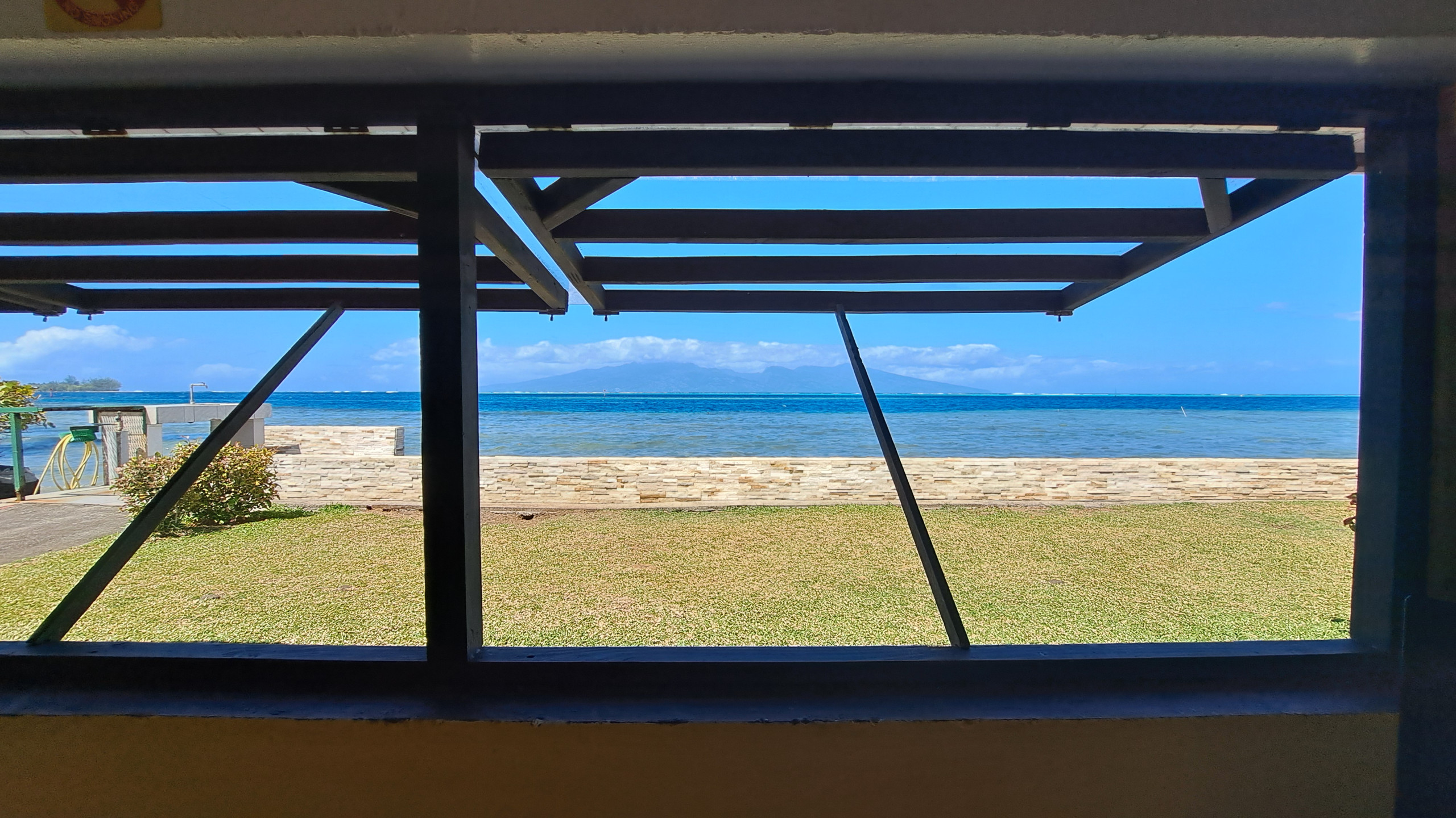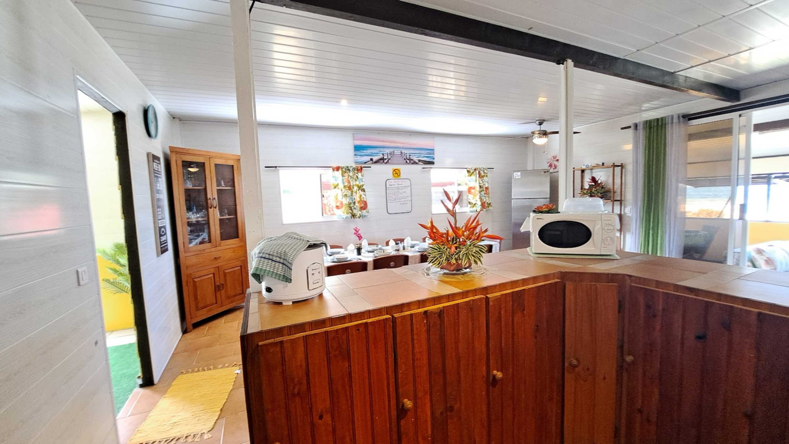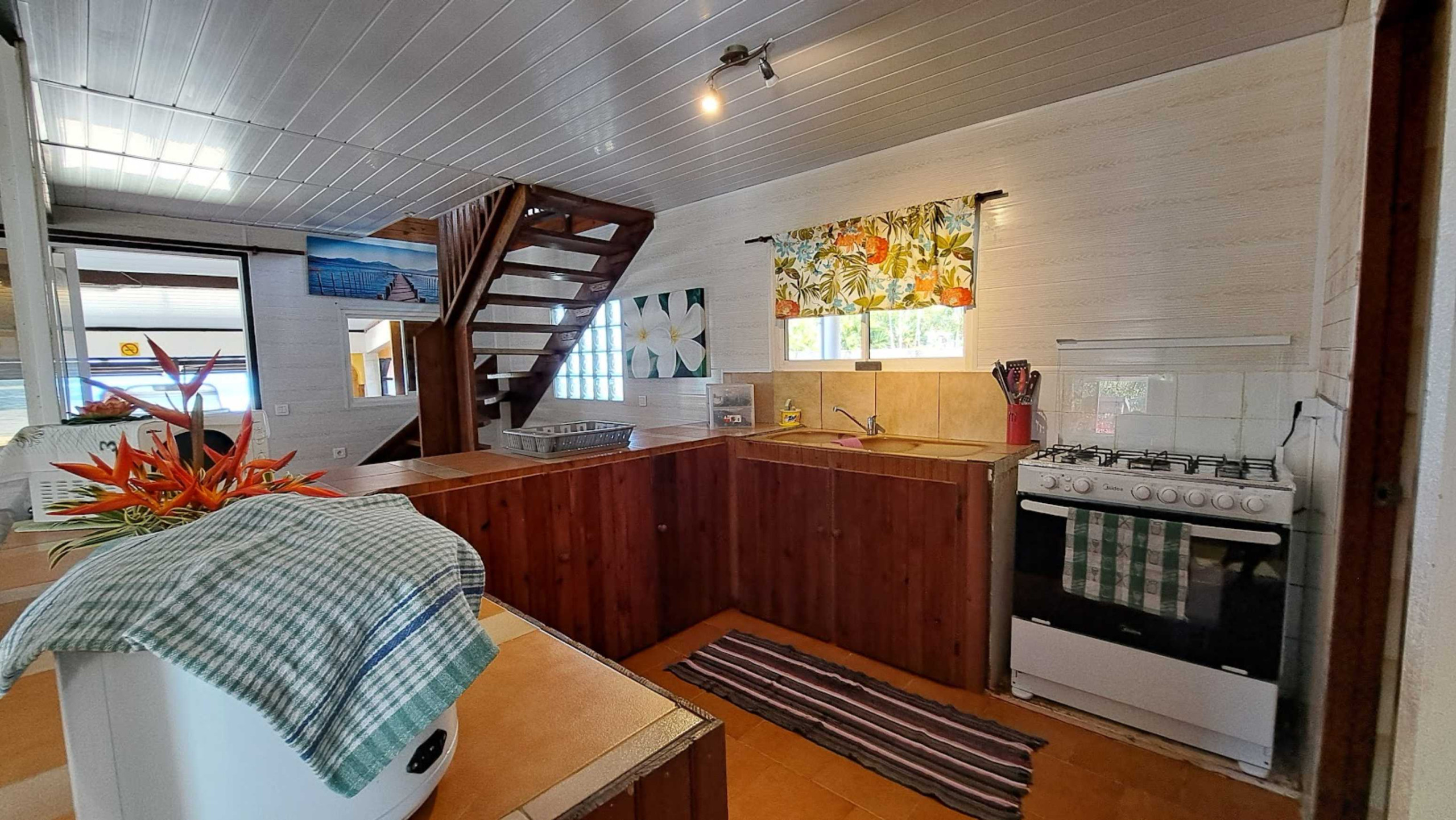 The main room consists of an open-plan kitchen and dining area. The living space, with 2 sofa beds, a TV and a small coffee table, is located on the front line with a stunning view of the lagoon.
