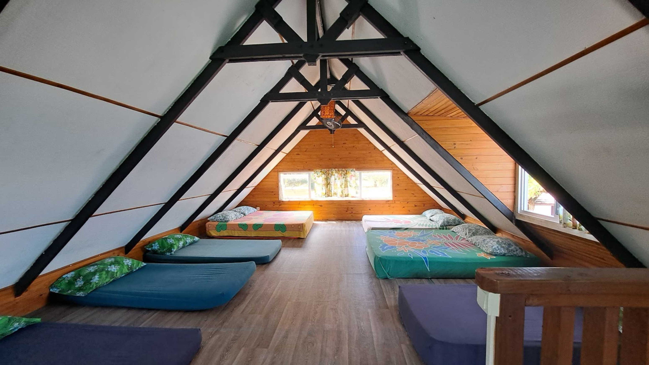 Sleeping can be done on the 2 sofa beds in the living room, or upstairs in the dormitory where mattresses are laid out on the floor, accommodating 13 people. Fans are provided for your comfort.