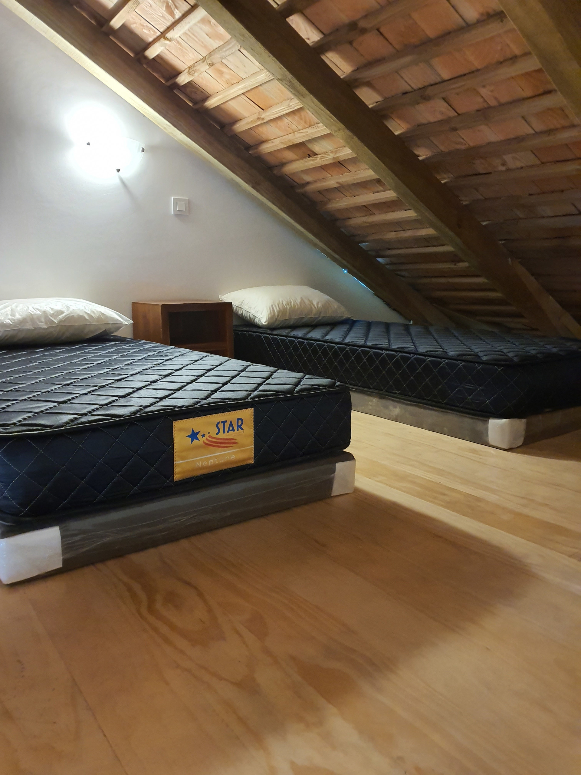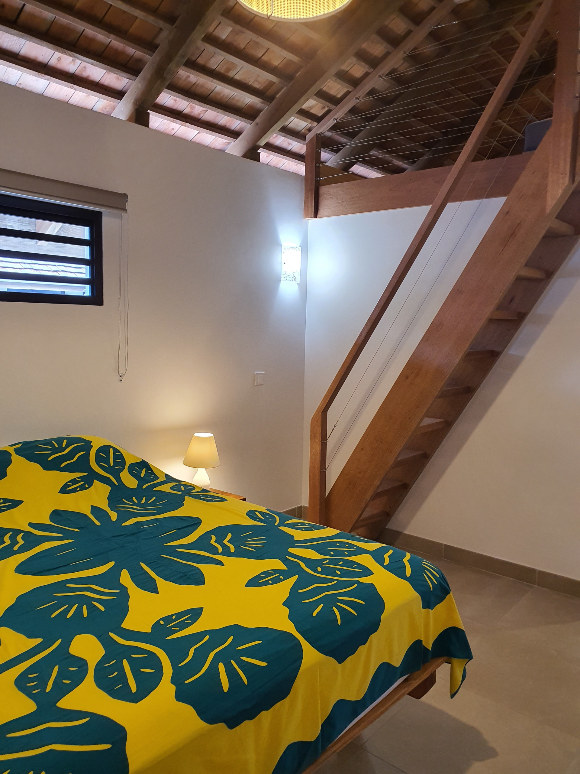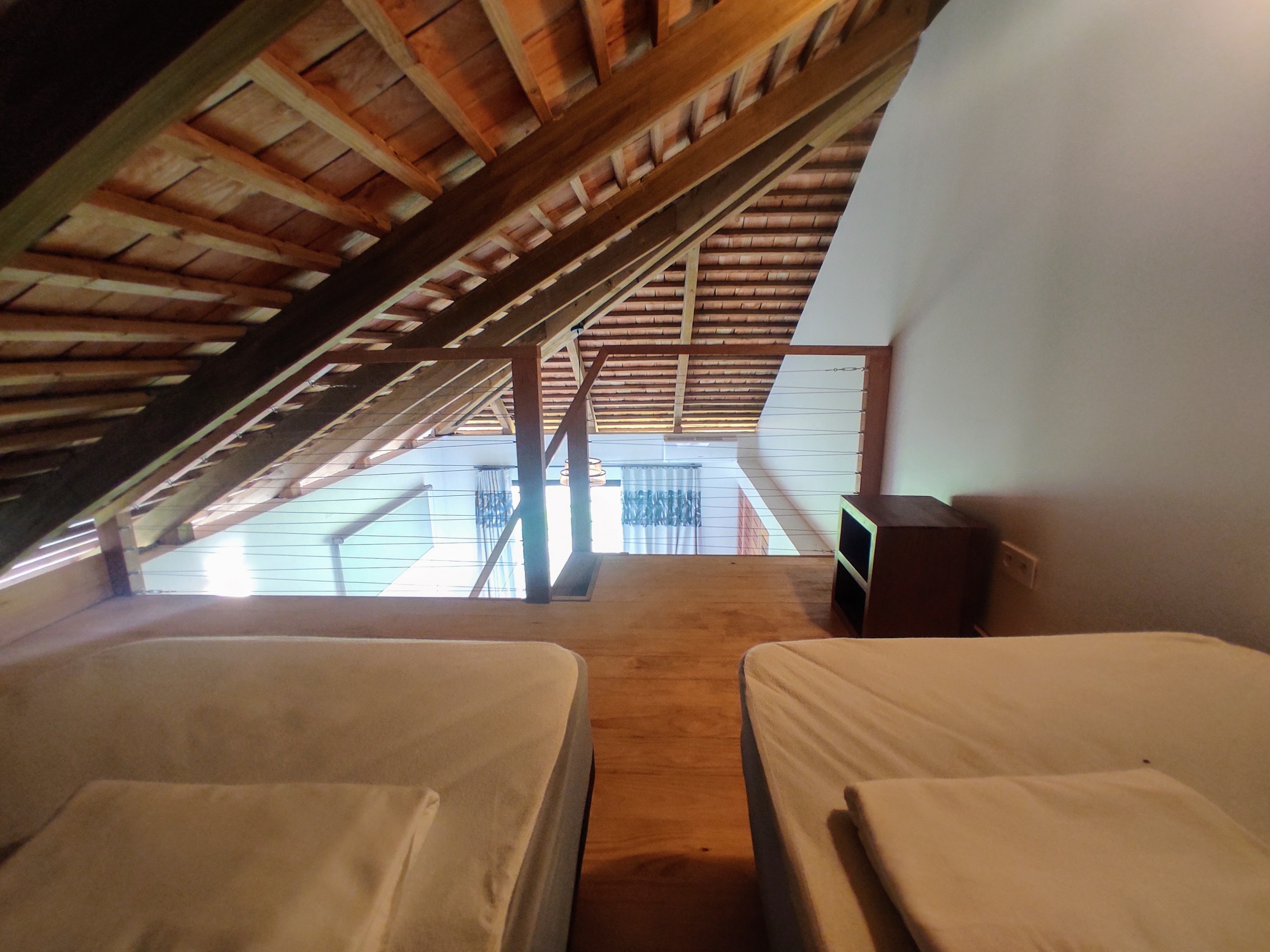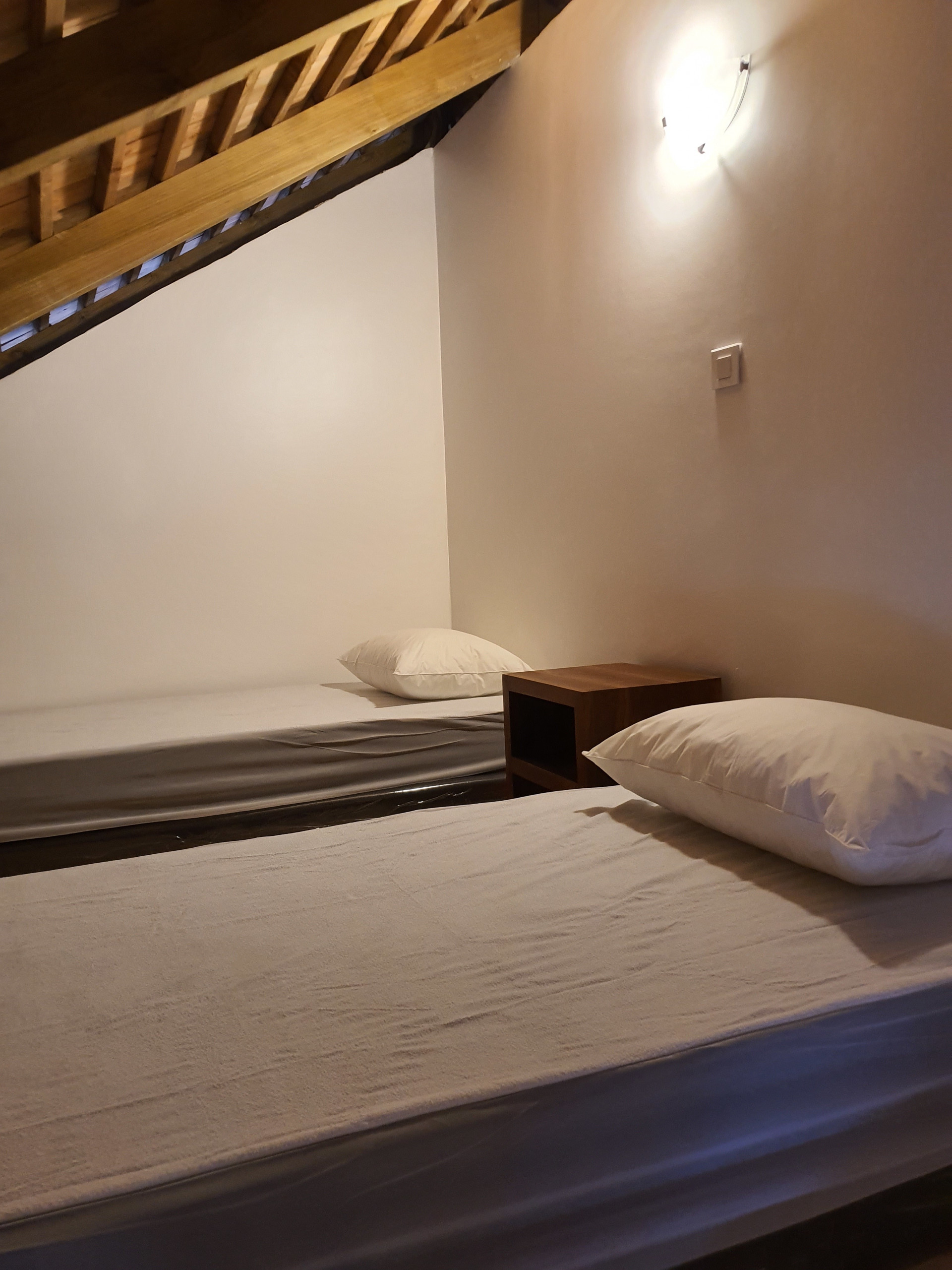 The house is composed of 2 private and air-conditioned bedrooms, each with 1 double bed and 1 mezzanine with 2 single beds.