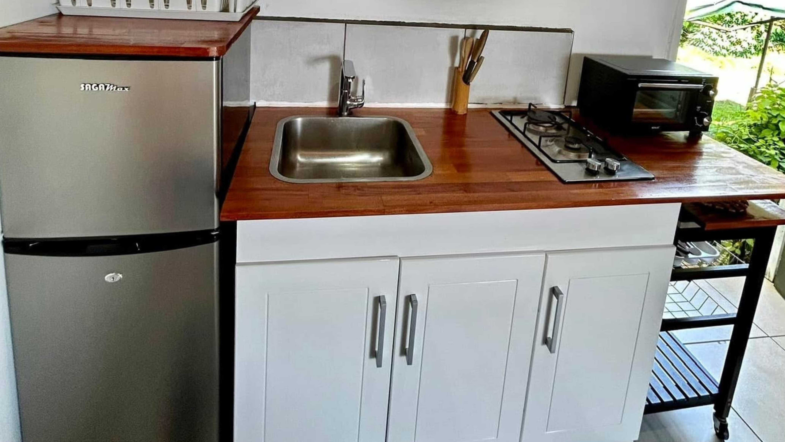 Equipped kitchenette: fridge, gas hob, coffee maker, kettle, crockery and basic utensils
