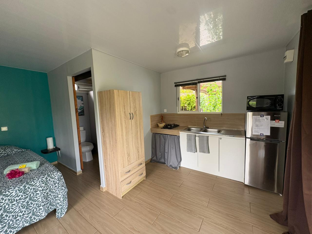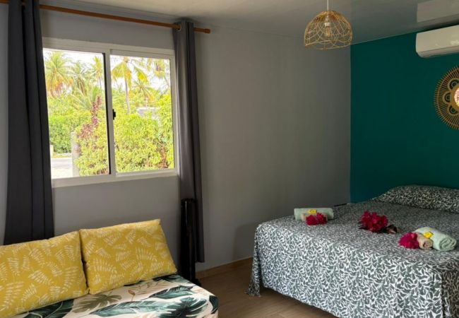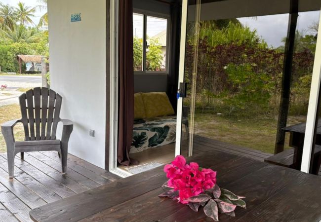 The bungalow can accommodate 2 adults and 2 children. It includes a queen-size bed, a double sofa bed, a modern bathroom with shower and toilet, as well as a kitchenette equipped to prepare your meals independently. Outside, a small terrace allows you to share your meals or enjoy the softness of Polynesian evenings.