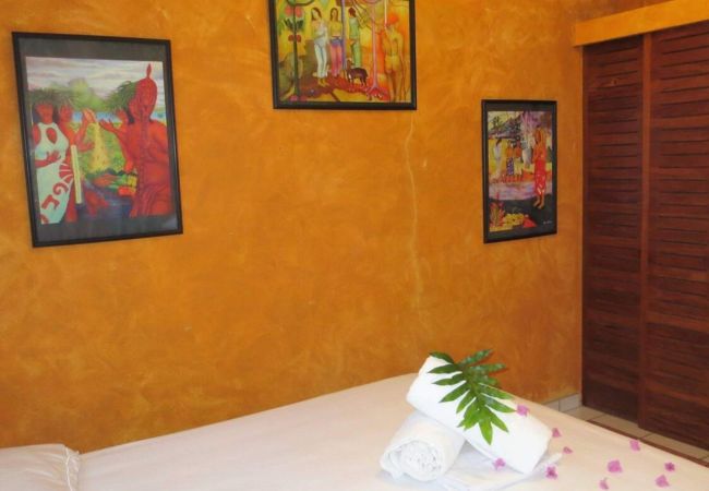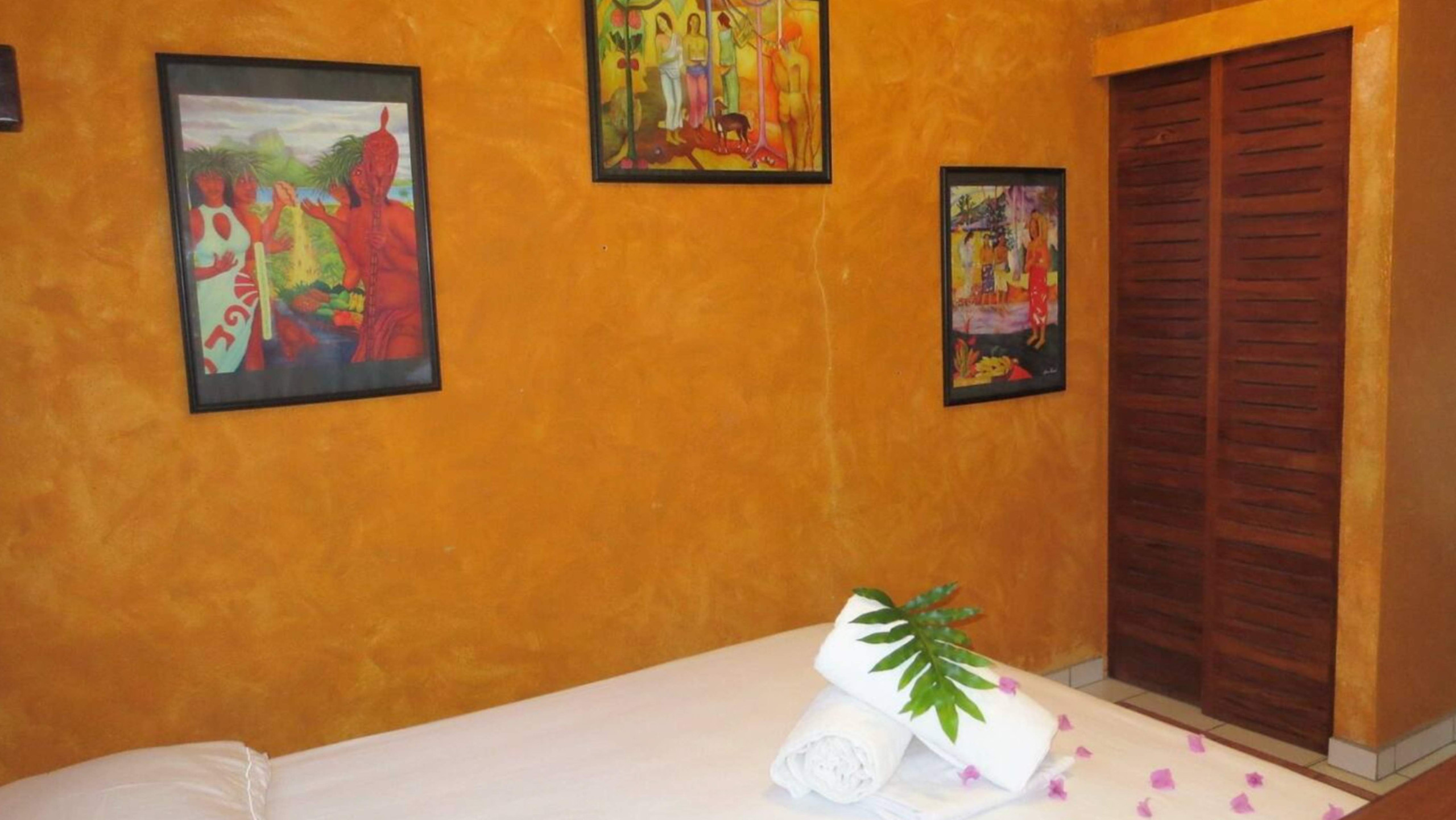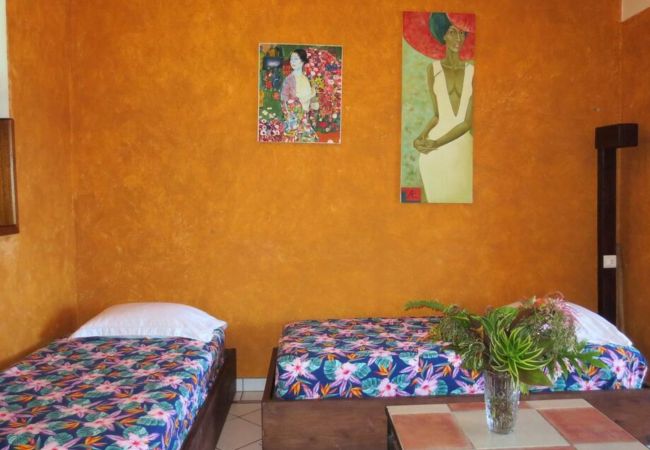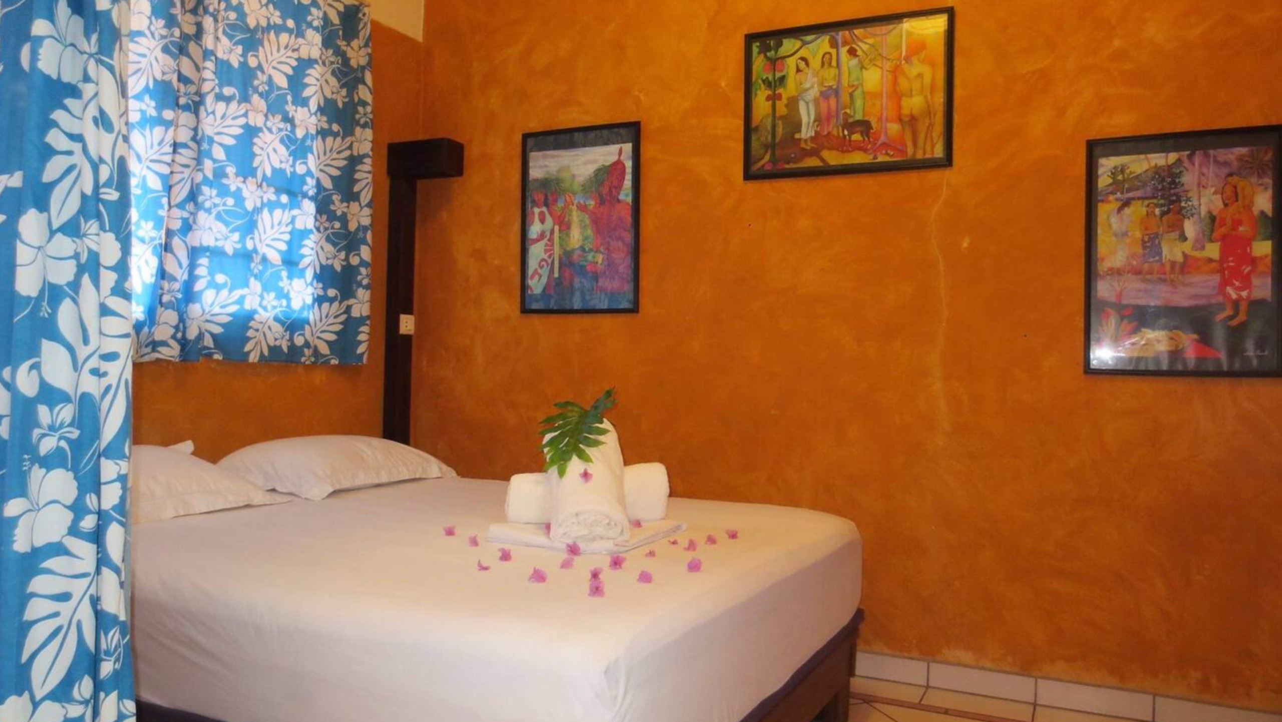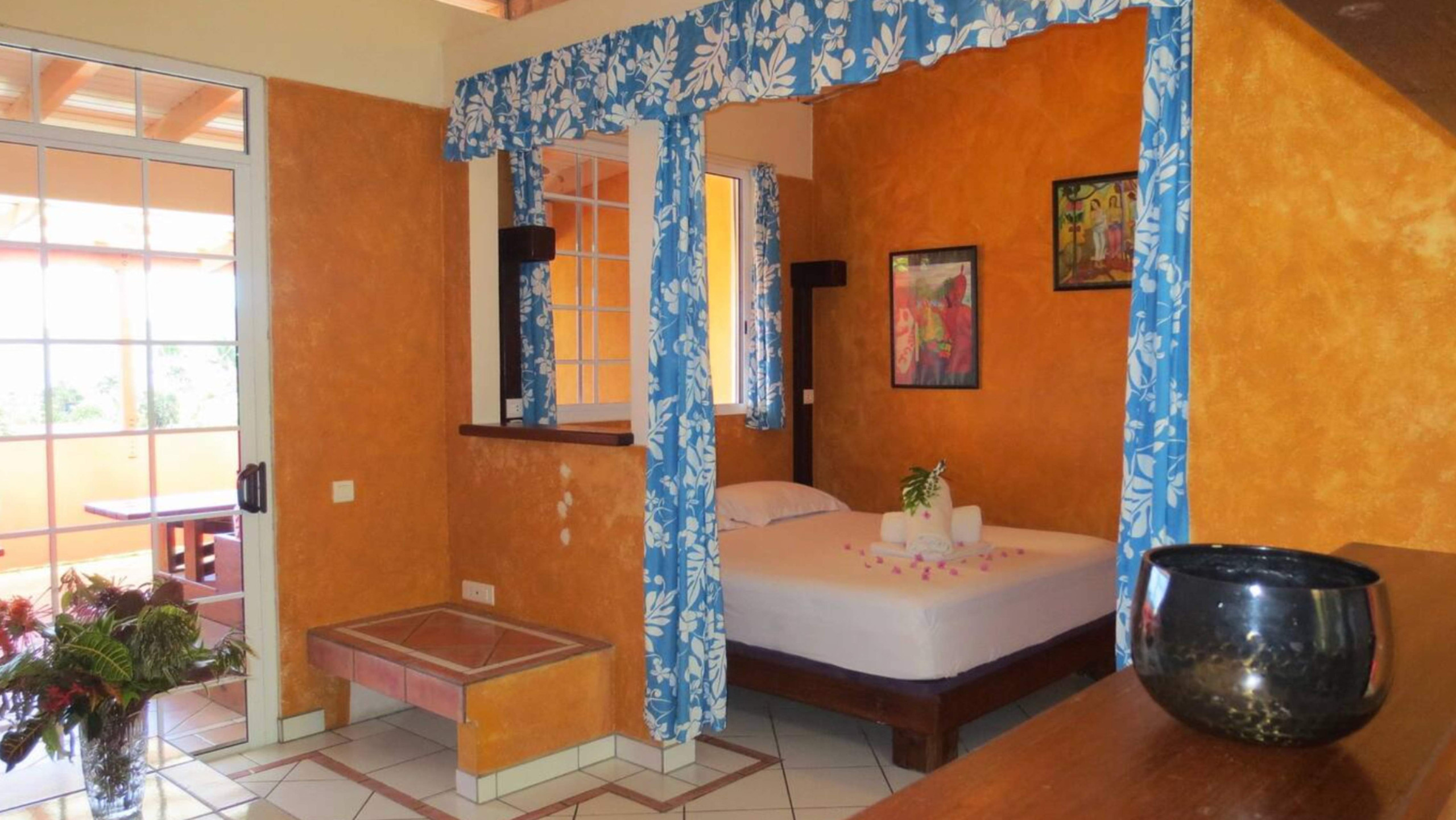 The family studio can accommodate up to 5 people and offers all the necessary comfort for a successful stay in Bora Bora. You have a large, fitted panoramic terrace, ideal for admiring the spectacular view of the lagoon and mountains or enjoying sunsets. The modern and fully equipped kitchen allows you to prepare your meals in a friendly atmosphere. The bright living area, carefully decorated, includes several single beds in a welcoming ambiance. The bedroom with a queen-size bed, separated by an elegant pareo curtain, creates an intimate and restful atmosphere. 3 additional sleeping spaces are possible with extra beds. The contemporary bathroom includes a shower, washbasin and toilet, in a practical and comfortable layout.