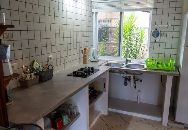 The garden-side studio consists of a fitted kitchen (gas hob, refrigerator, kettle, coffee maker and toaster), a dining room and a terrace open to the garden.