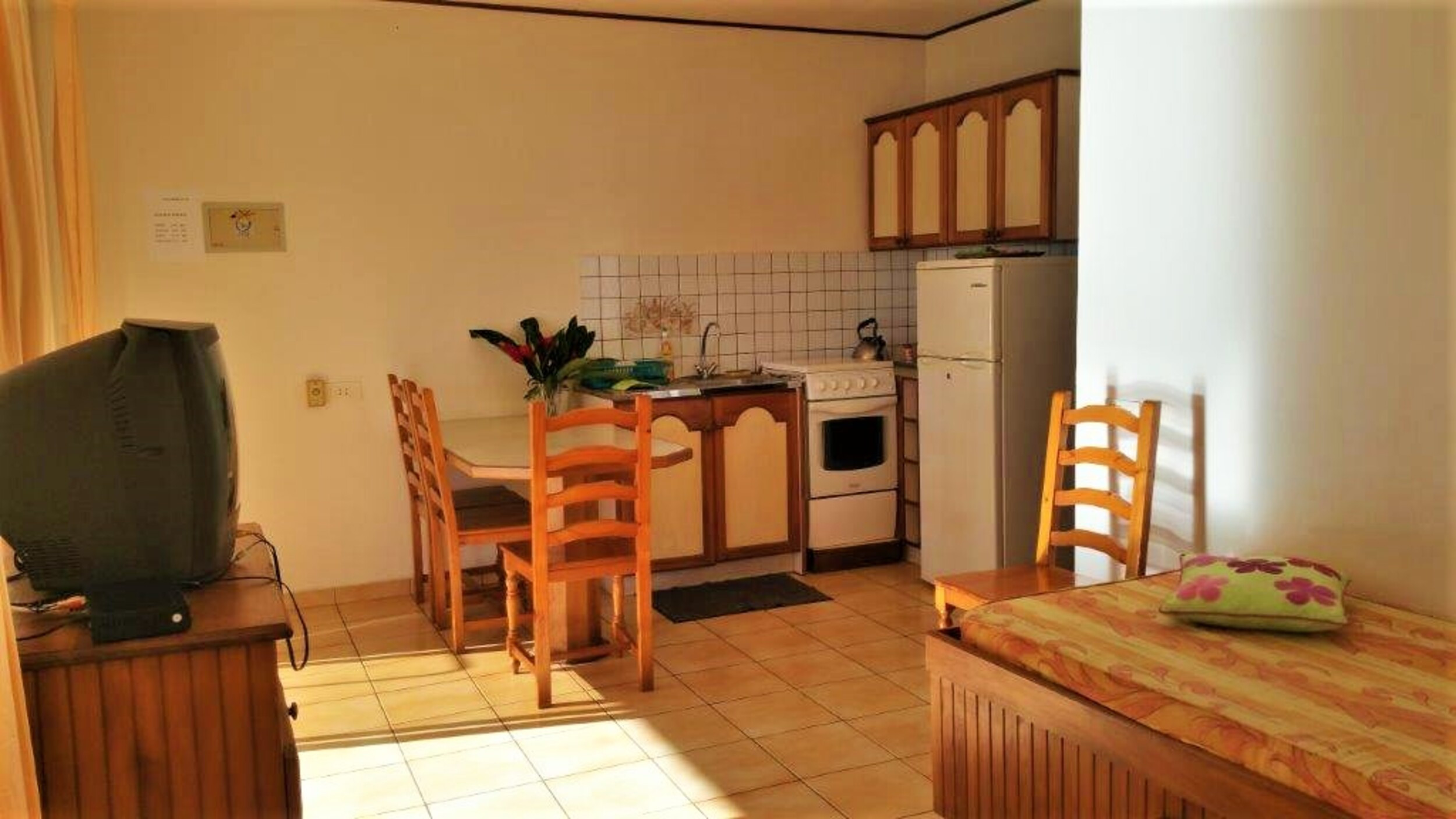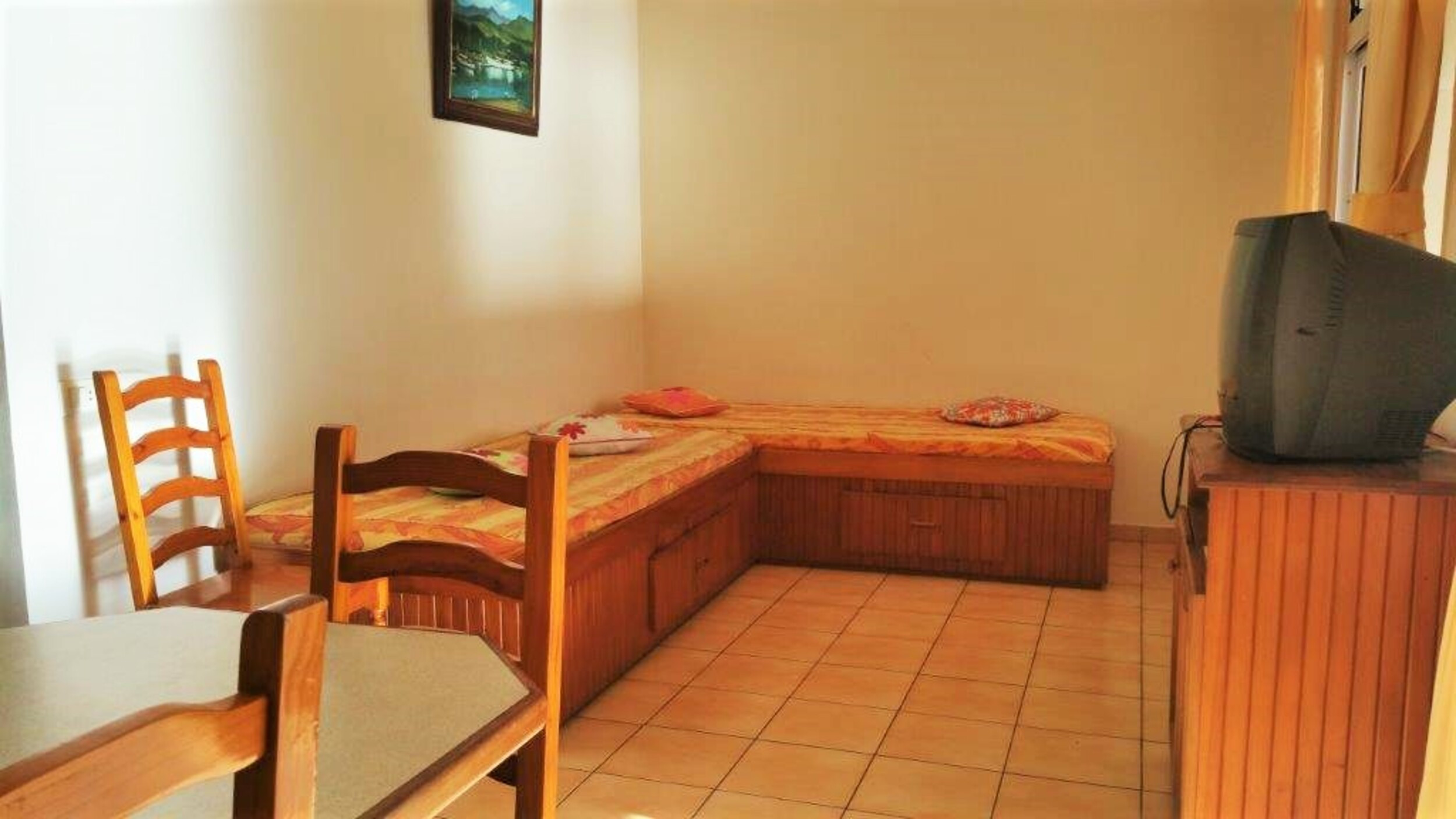 An independent, air-conditioned bedroom with a double bed and a large wardrobe to store your personal belongings, and two single beds in the main room equipped with a fan for your comfort.
