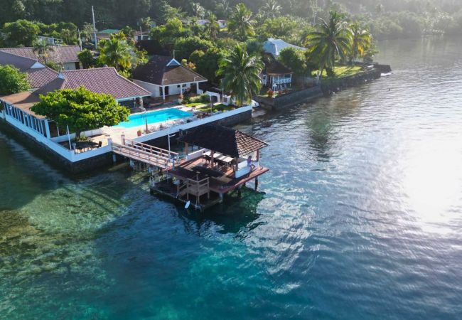 On the edge of the lagoon, a beautiful shared swimming pool with deckchairs for sunbathing. A Fare Pote is at your disposal with tables and benches for aperitifs and meals, and for admiring the sunsets over the lagoon.