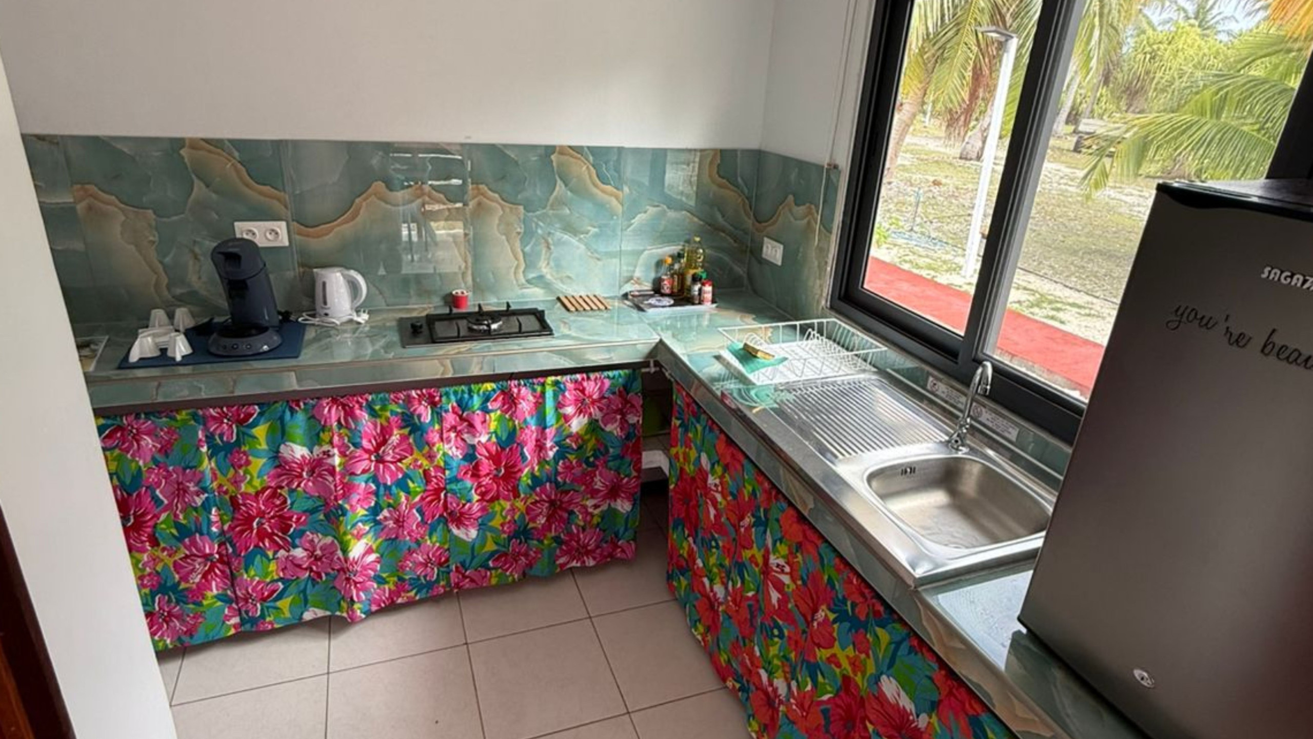 The accommodation can accommodate up to 5 people and features a bedroom area with two queen-size beds and a single bed. The large covered terrace is perfect for sharing a meal, relaxing after a day at the lagoon, or simply enjoying the tranquillity of the island. You will find an indoor bathroom with hot water, complemented by a convenient outdoor shower upon returning from the beach. The fitted kitchen allows you to prepare your meals independently, and the bungalow is equipped with WiFi, a washing machine, and a drying area for added comfort.