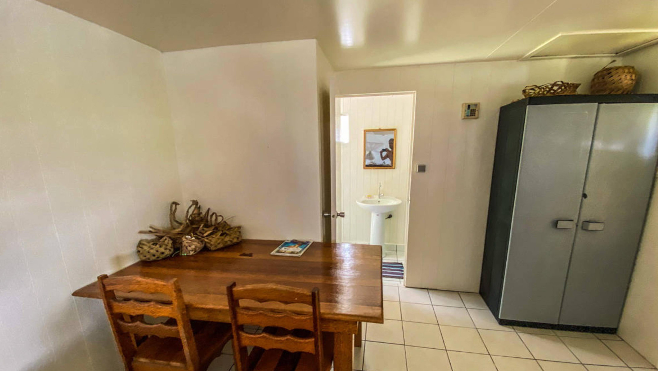The shared kitchen, shared with another bungalow, has a terrace and a friendly dining table. The necessary items to prepare your breakfasts are included.